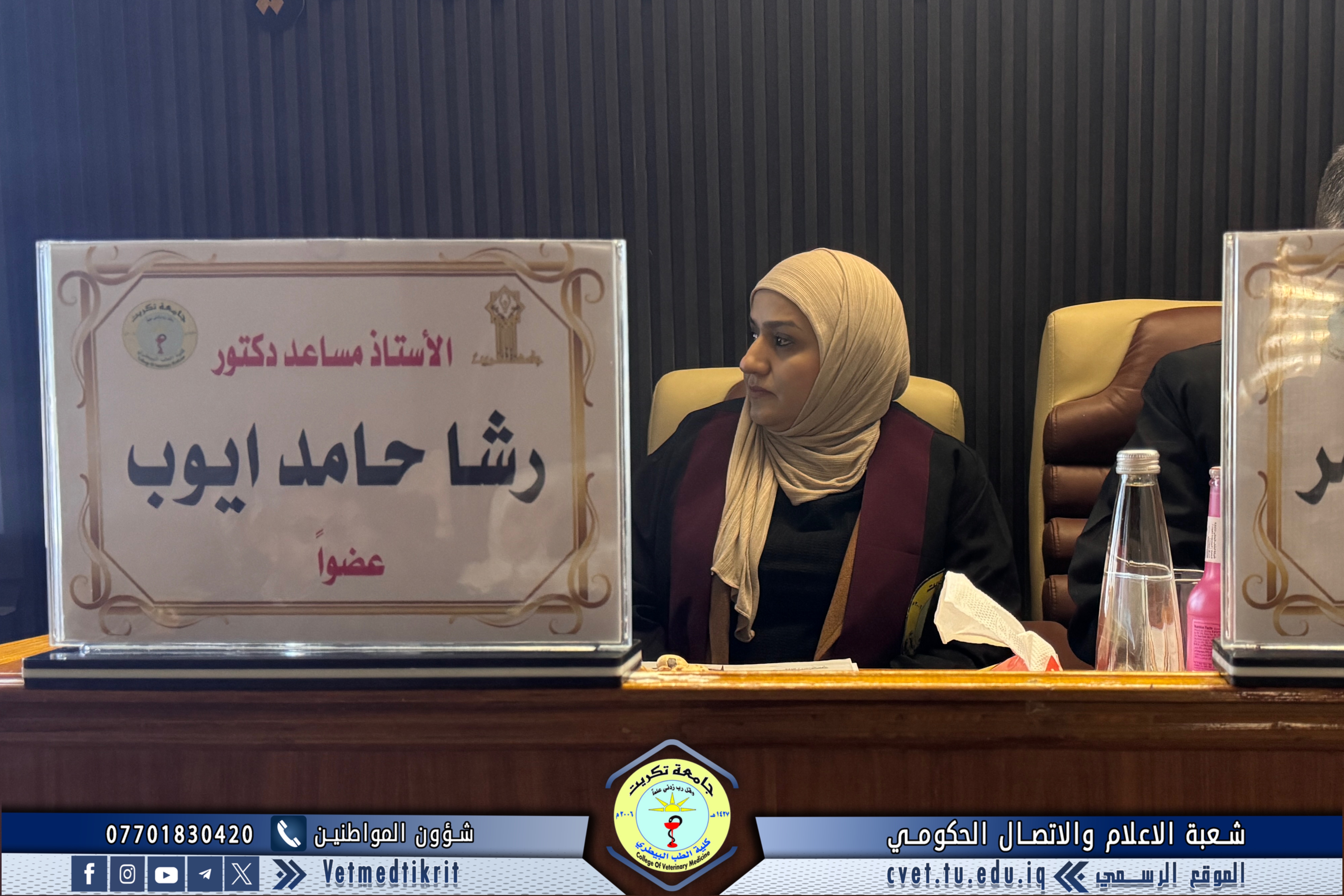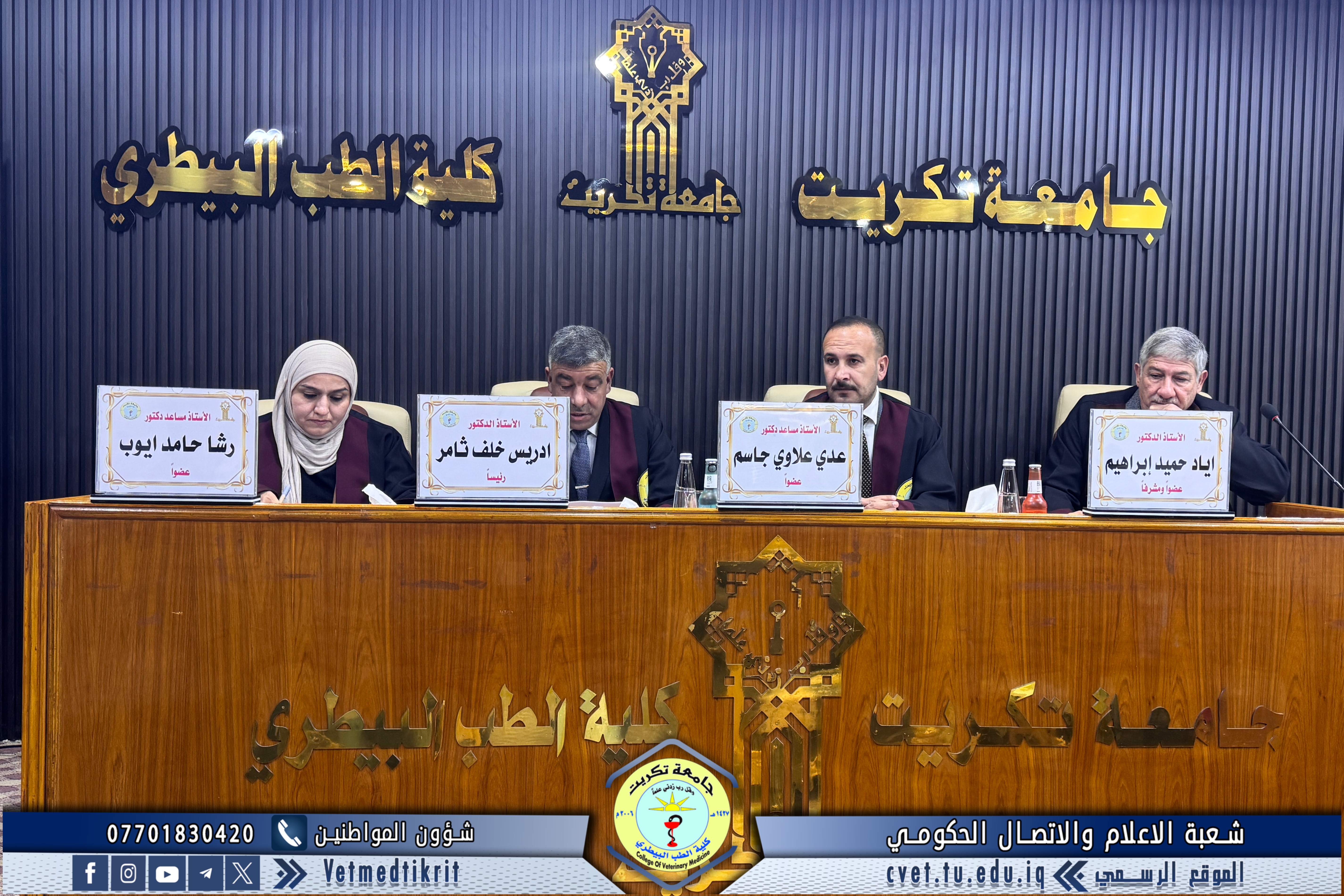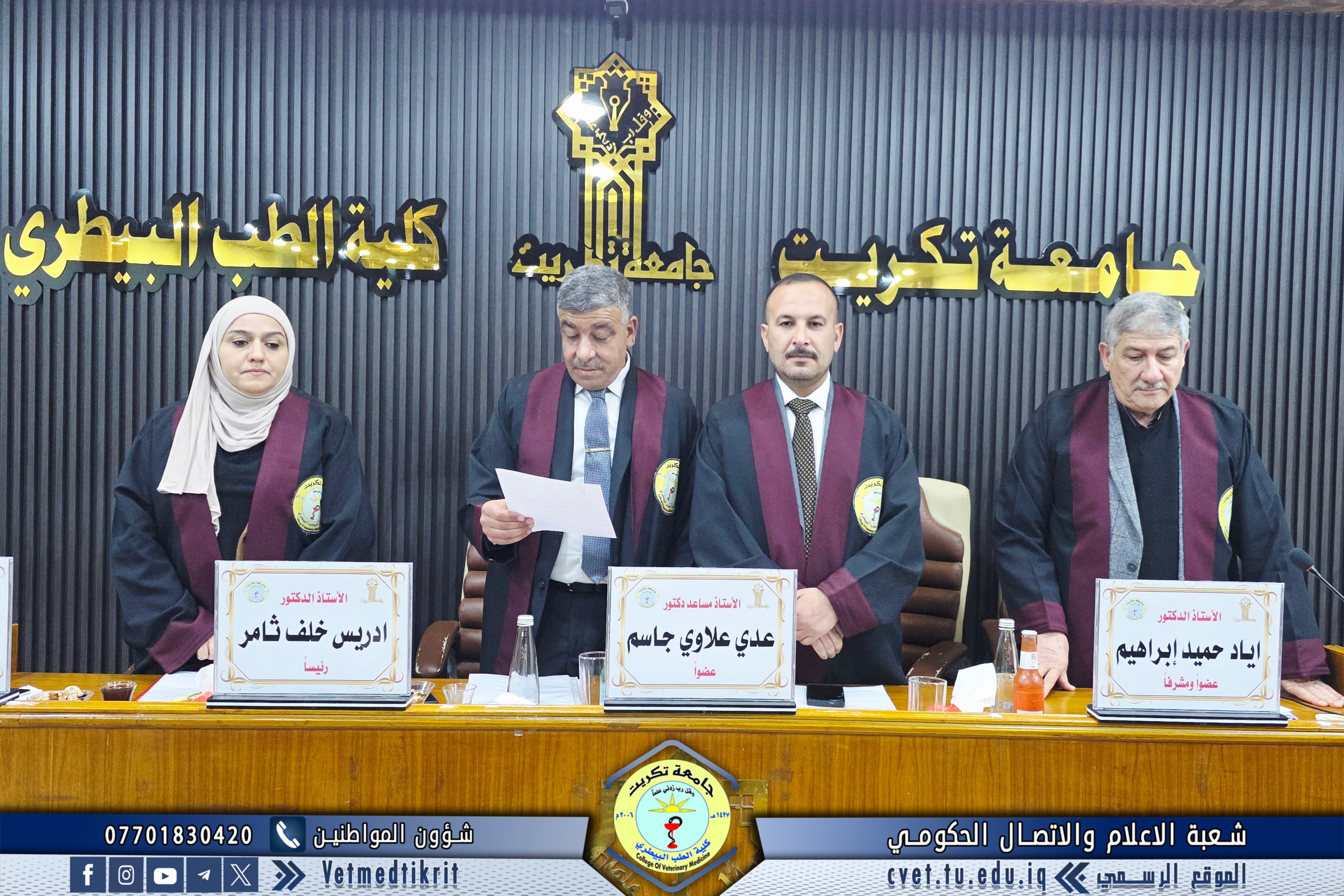 The thesis defense was held at Dr. Muhannad Maher Hall at the College of Veterinary Medicine, and was attended by a number of faculty members and students in a distinguished academic atmosphere.