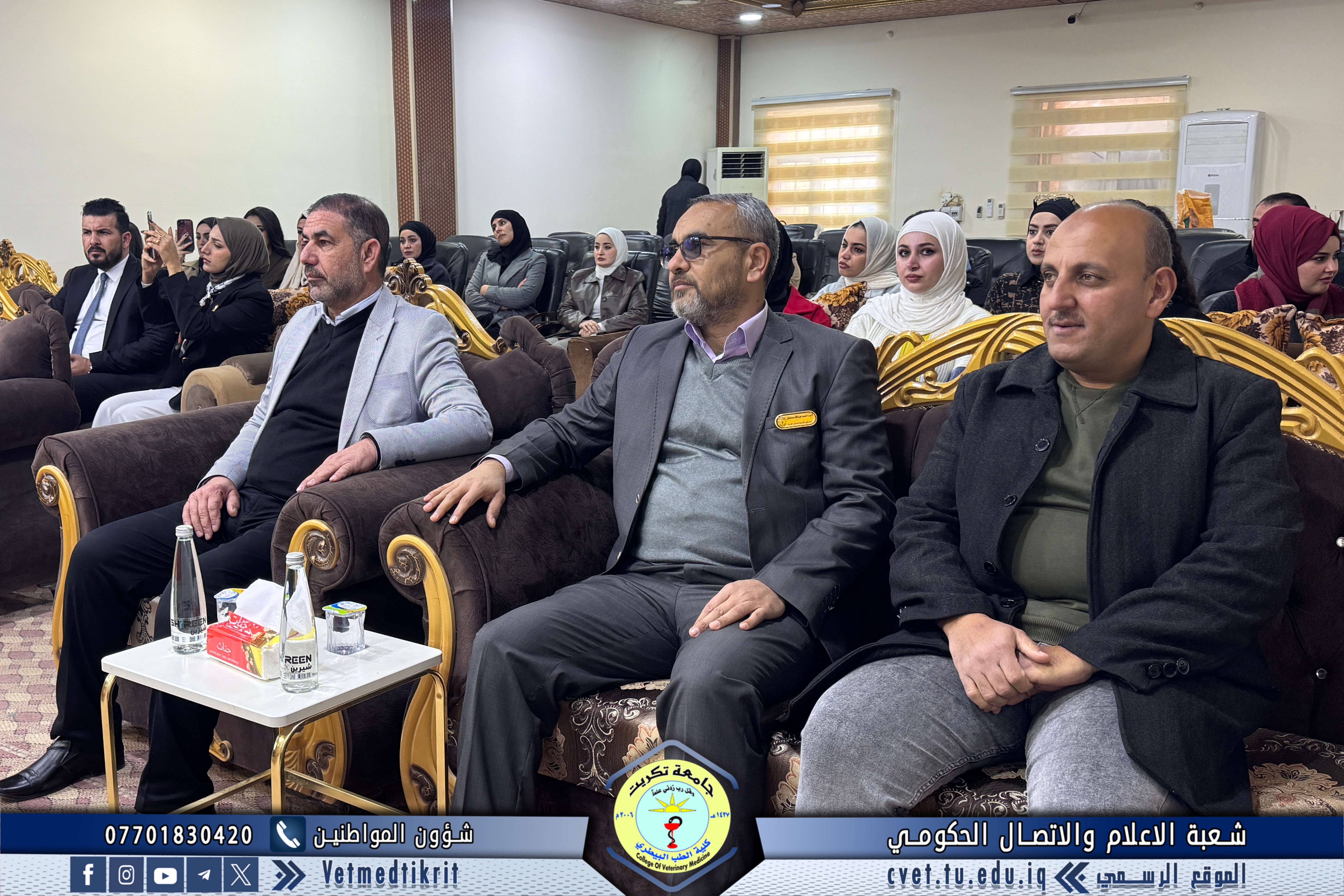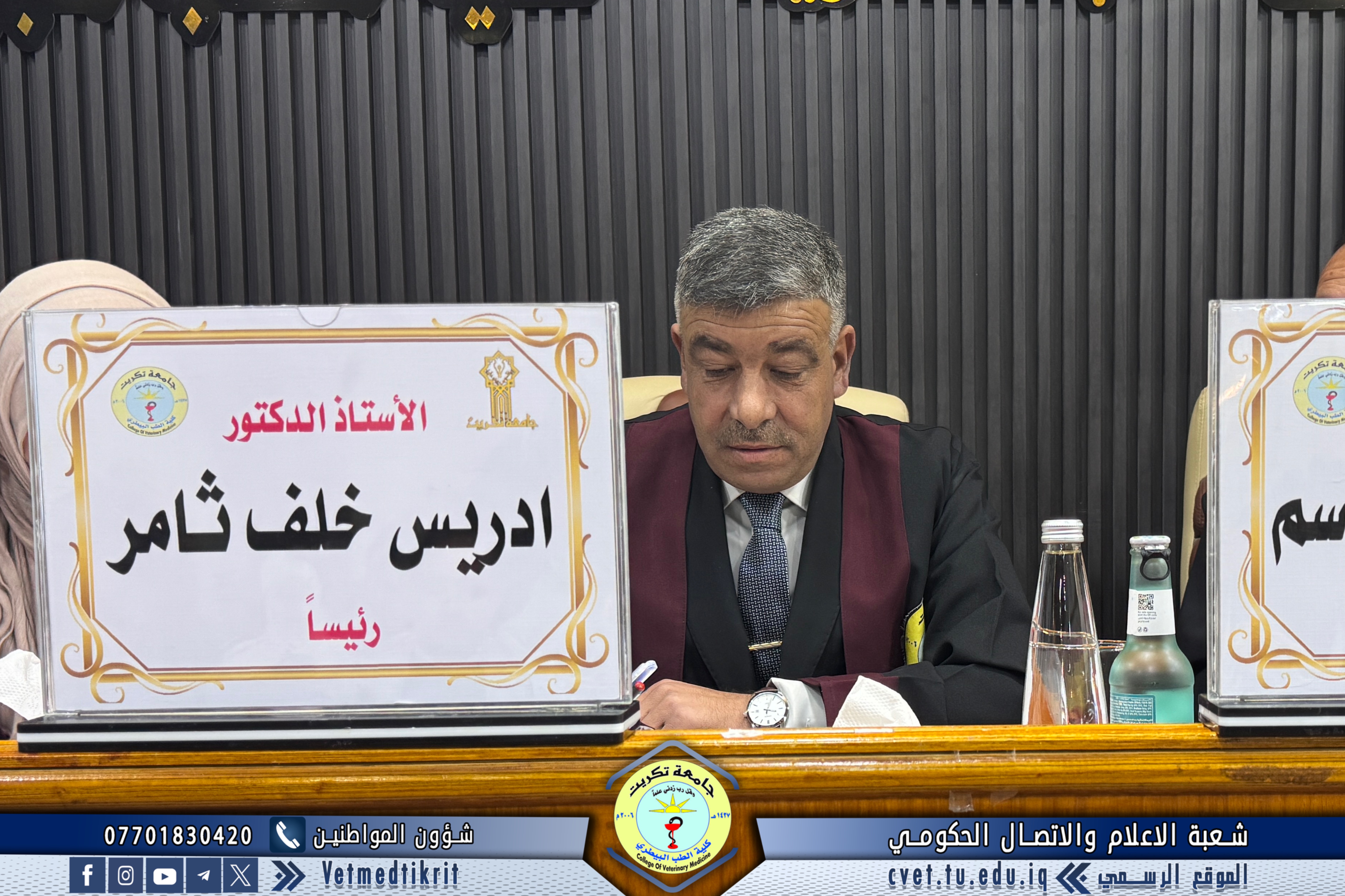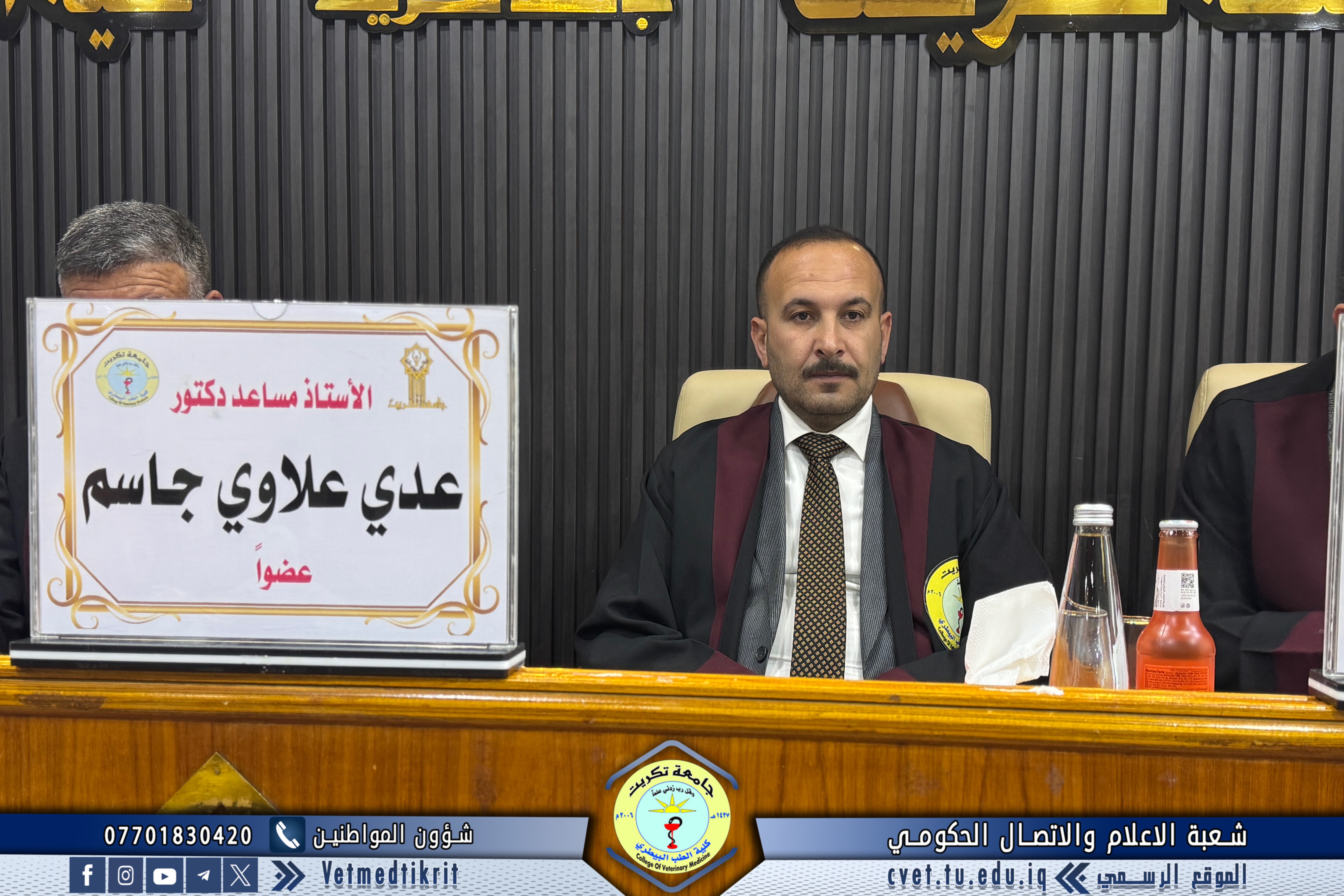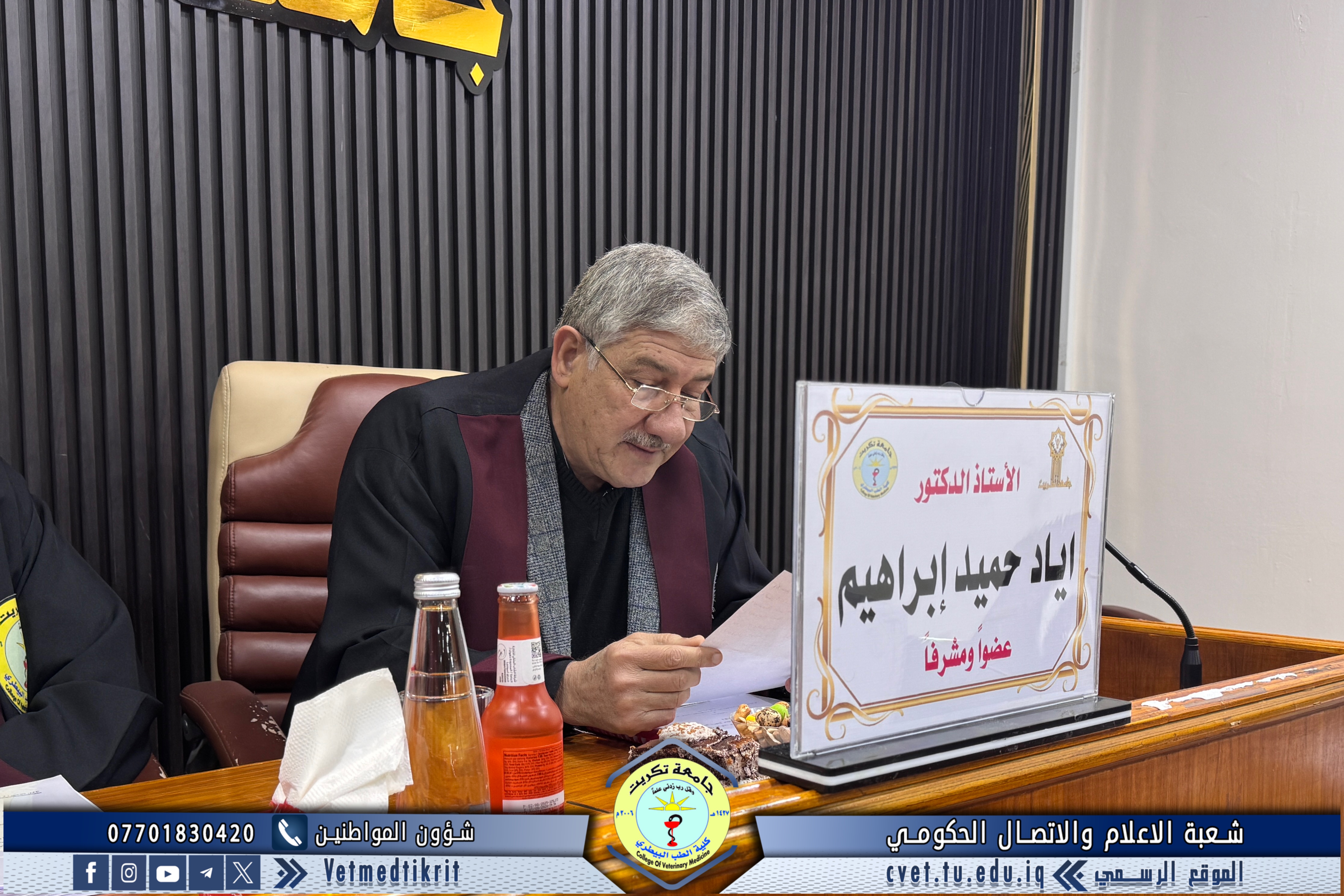 The thesis defense was held at Dr. Muhannad Maher Hall at the College of Veterinary Medicine, and was attended by a number of faculty members and students in a distinguished academic atmosphere.