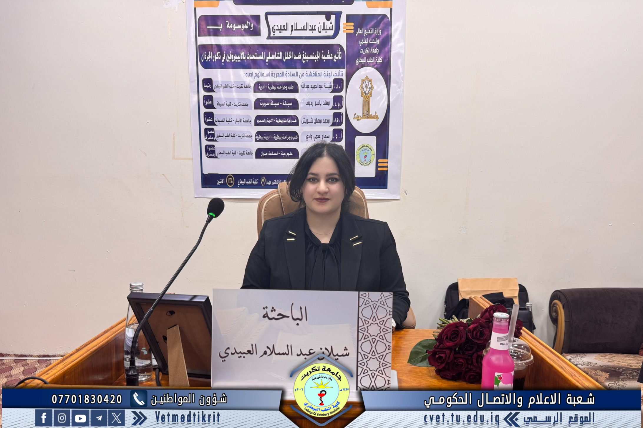 With the grace of Almighty God, the College of Veterinary Medicine at the University of Tikrit held the defense of the Master’s thesis entitled “The Effect of Ginseng Herb Against Ibuprofen-Induced Reproductive Dysfunction in Male Rats”, presented by Shilan Abdulsalam Hamad, majoring in Veterinary Medical Pharmacology. The defense was attended by Prof. Dr. Bashar Sadiq Noami, Dean of the College.