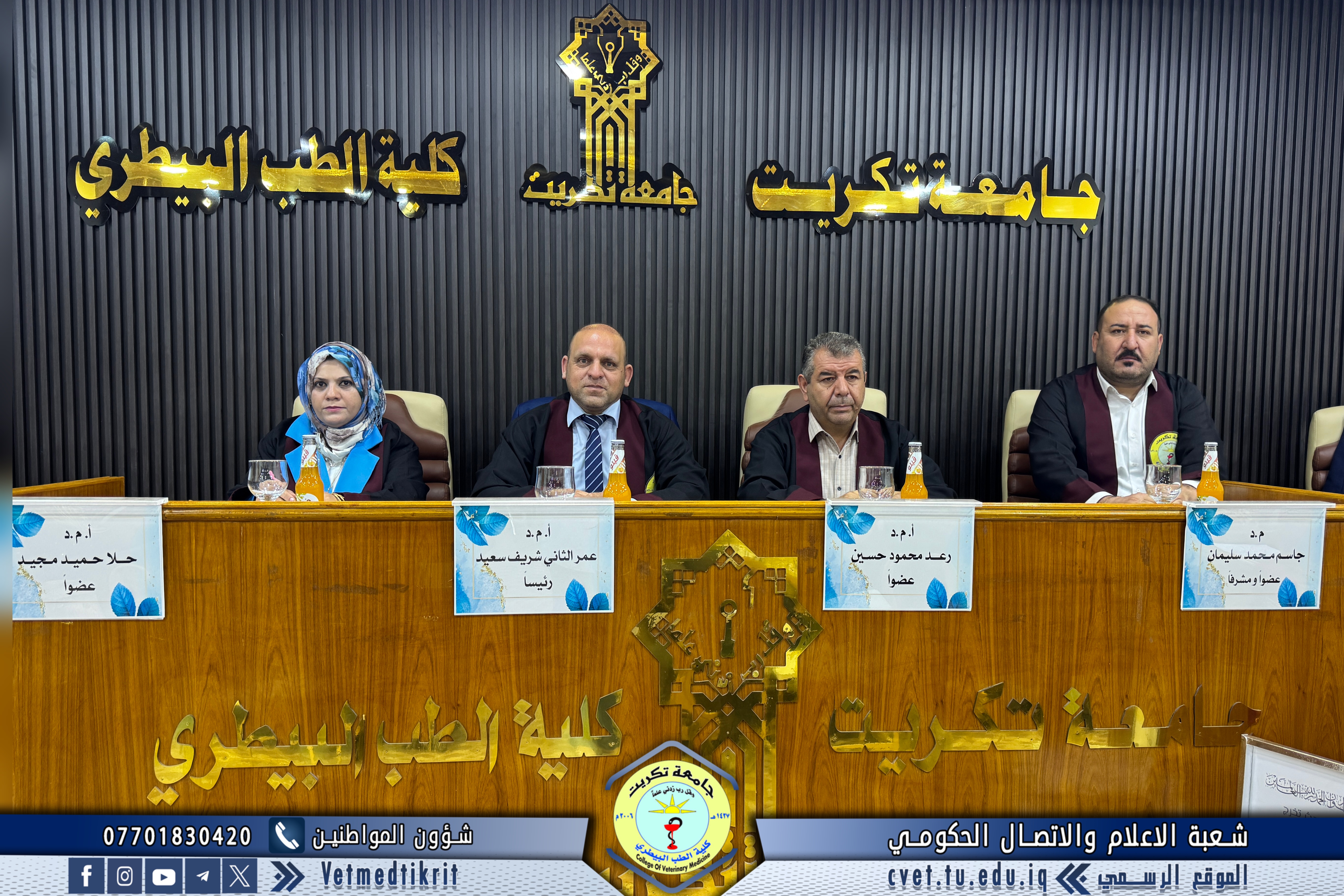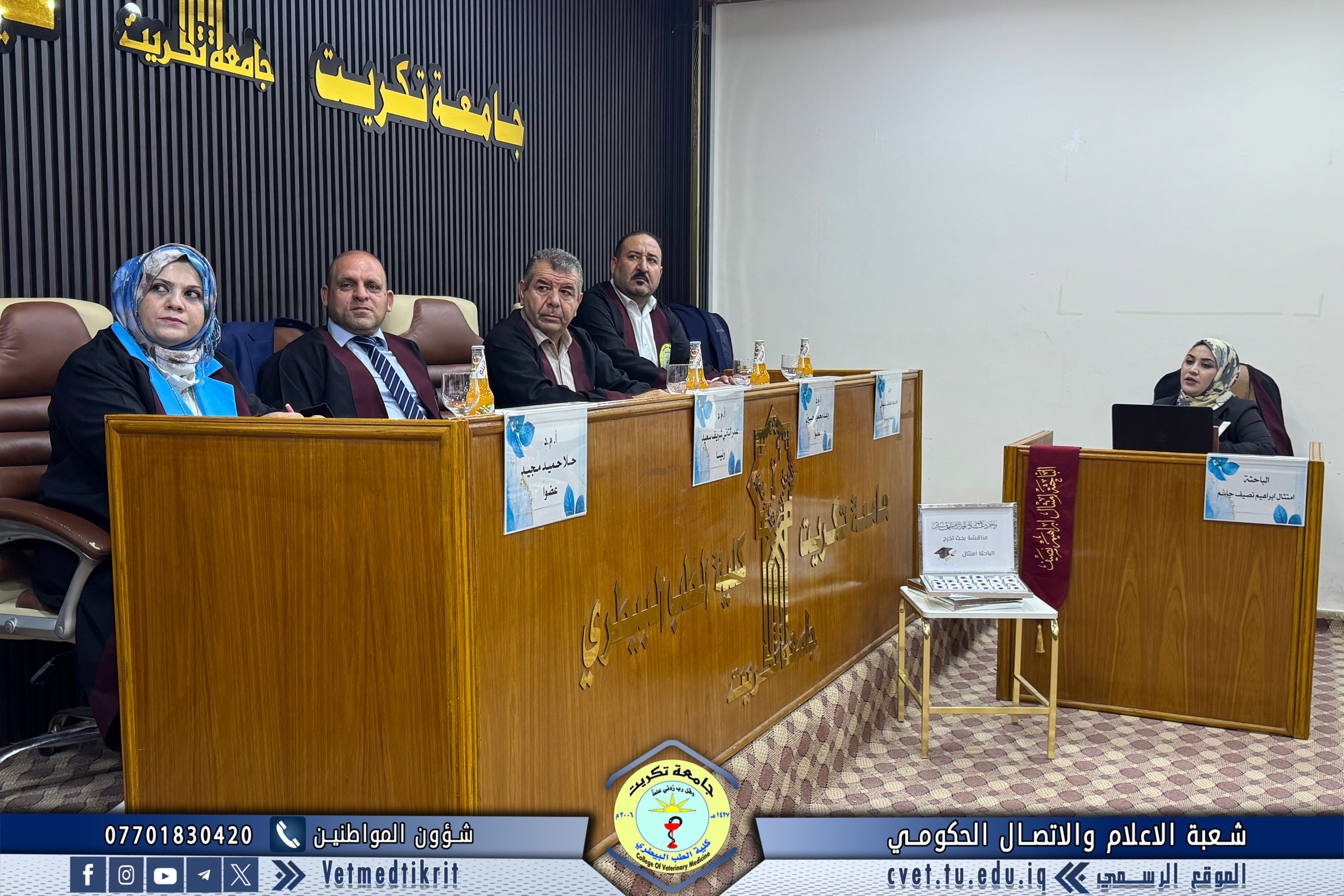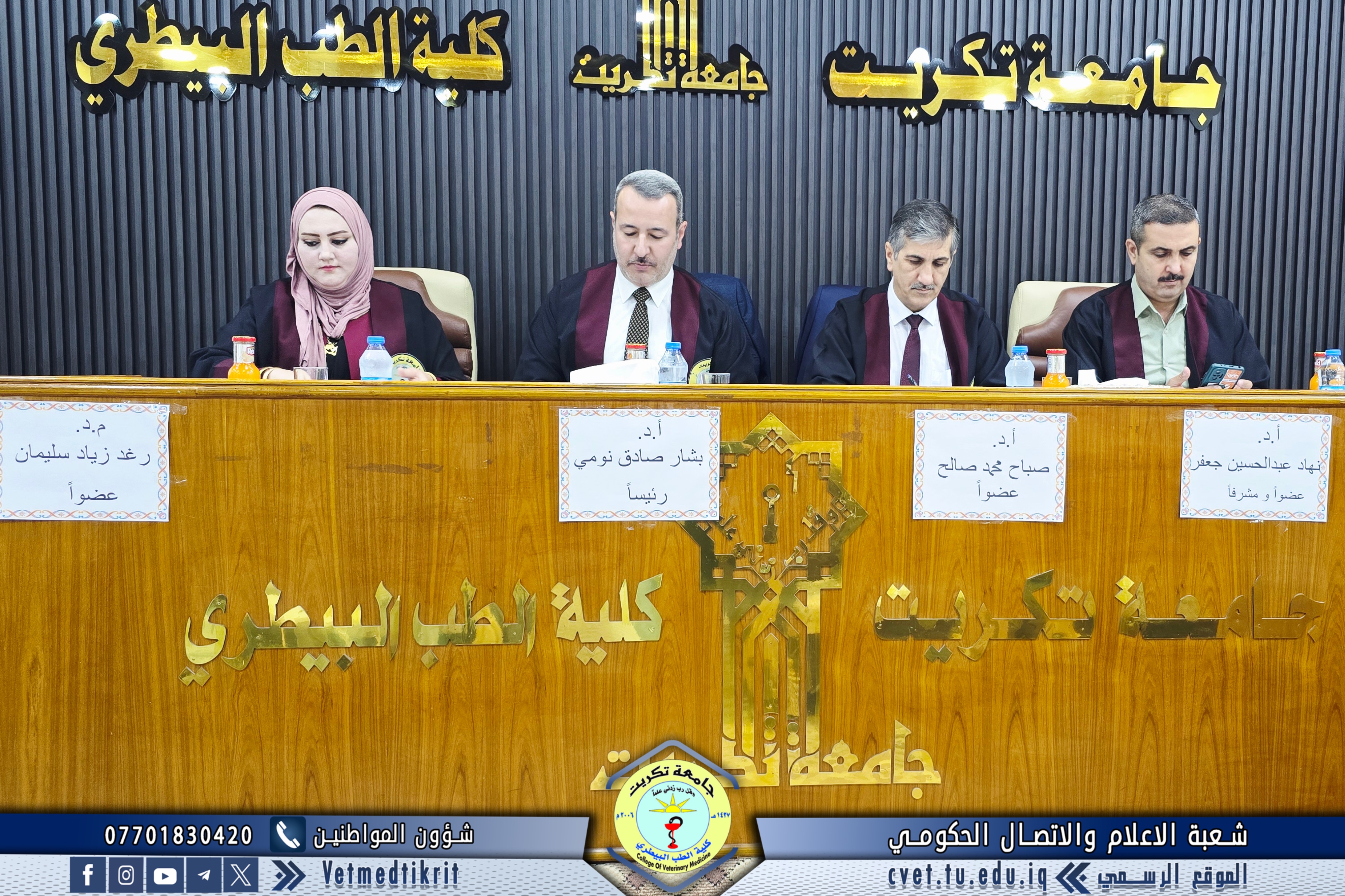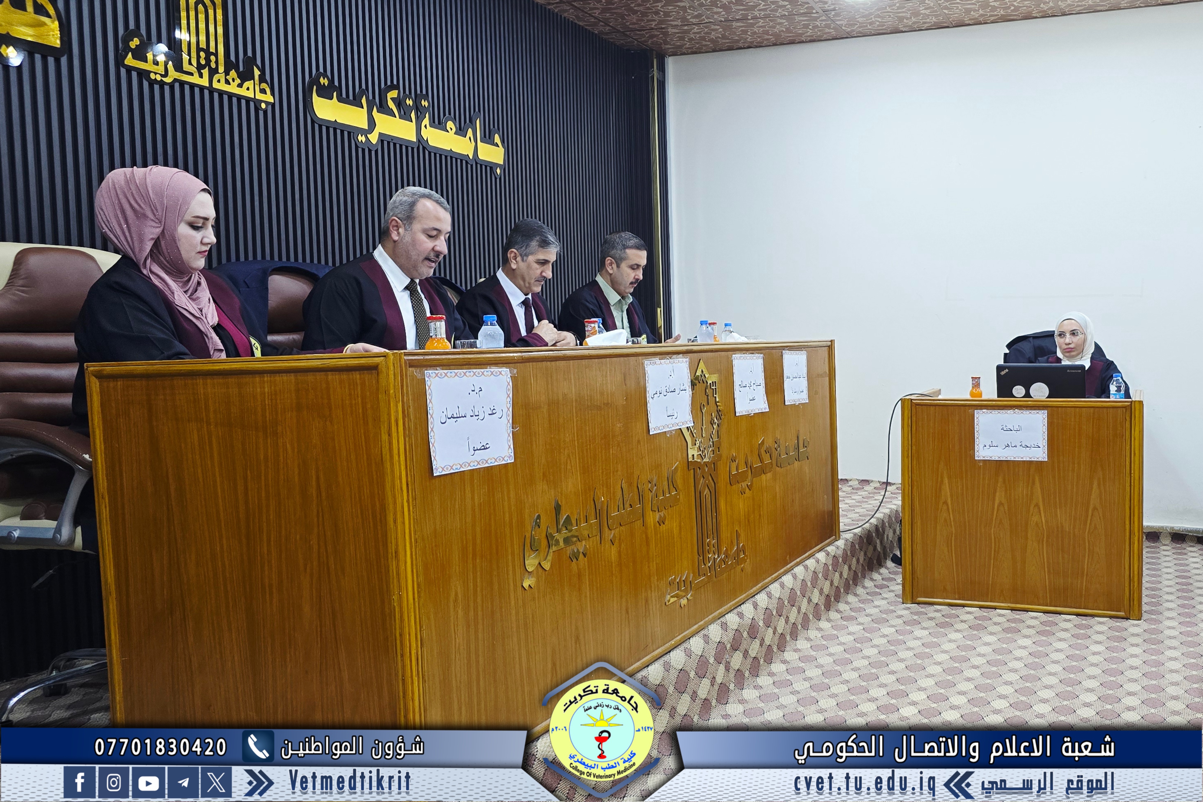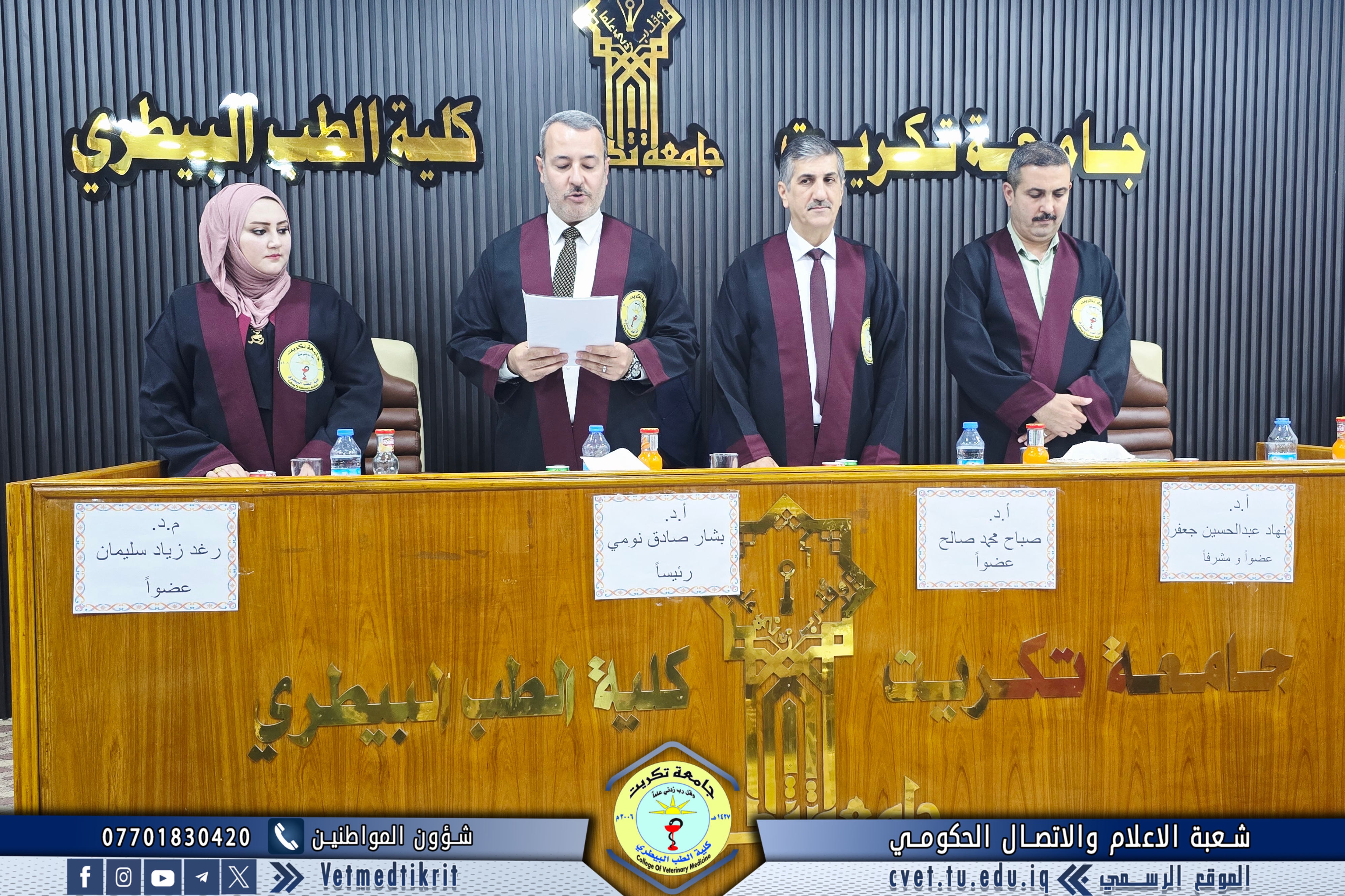The thesis defense, held in Dr. Muhannad Maher Hall at the College of Veterinary Medicine, was attended by a number of faculty members and a group of students.