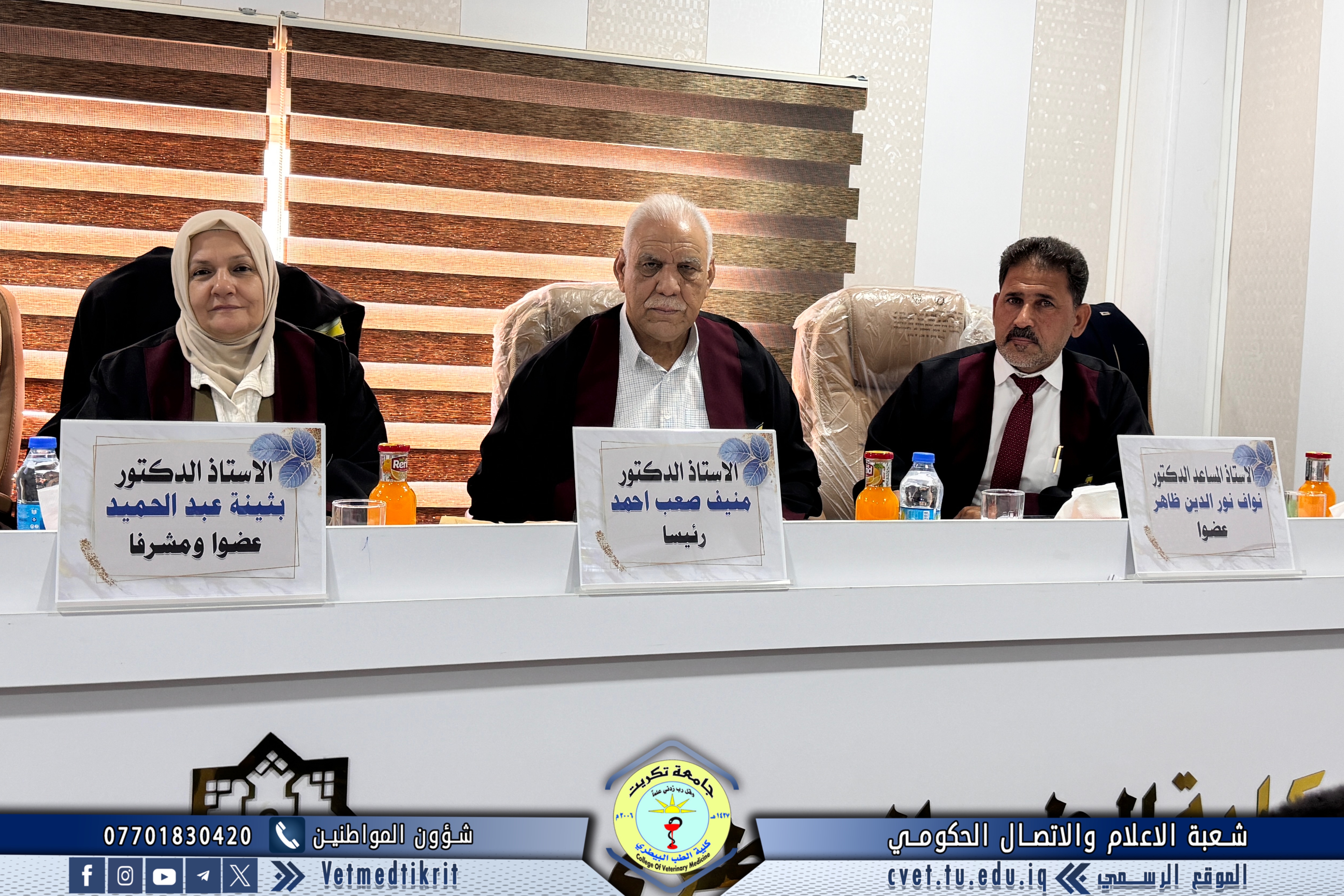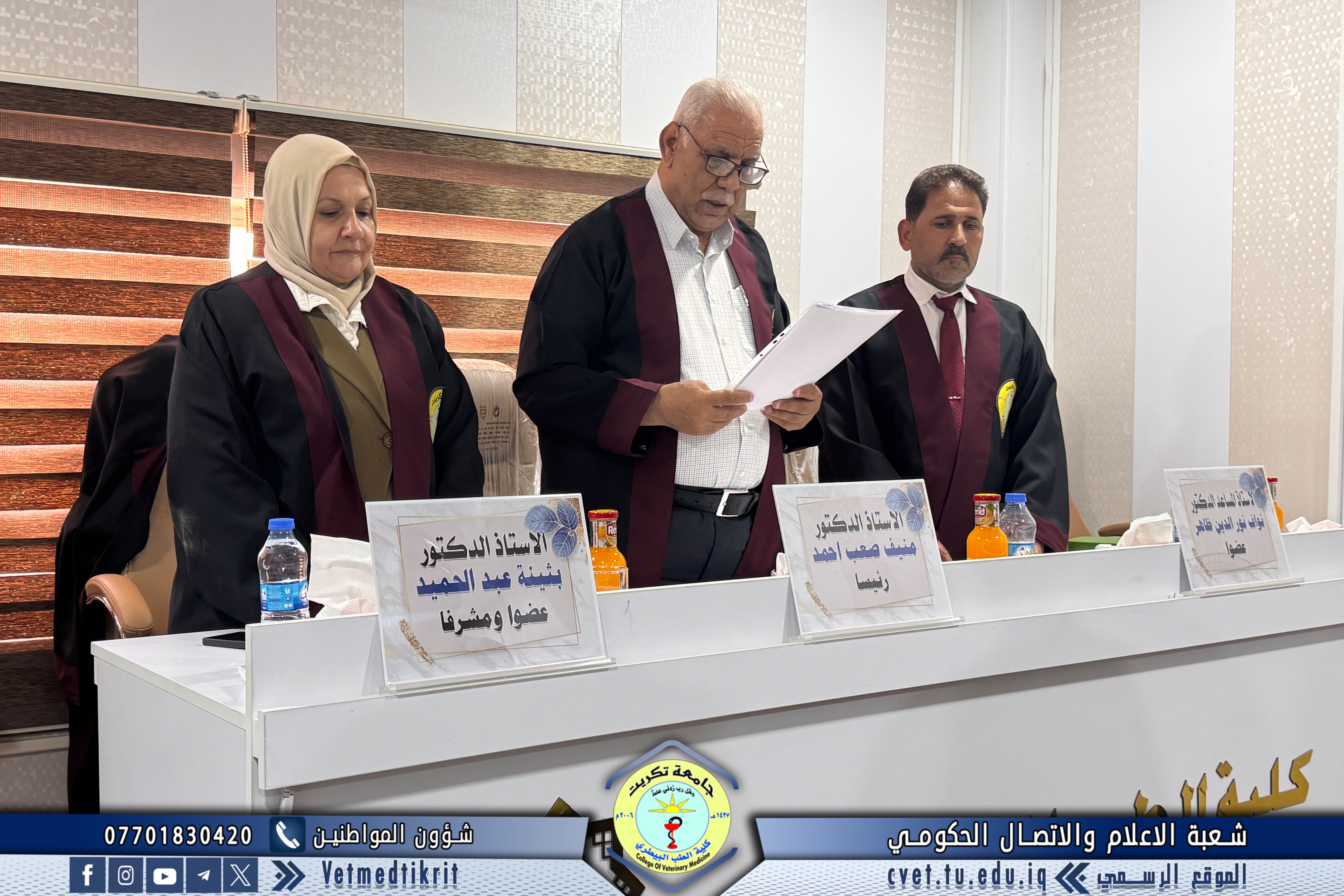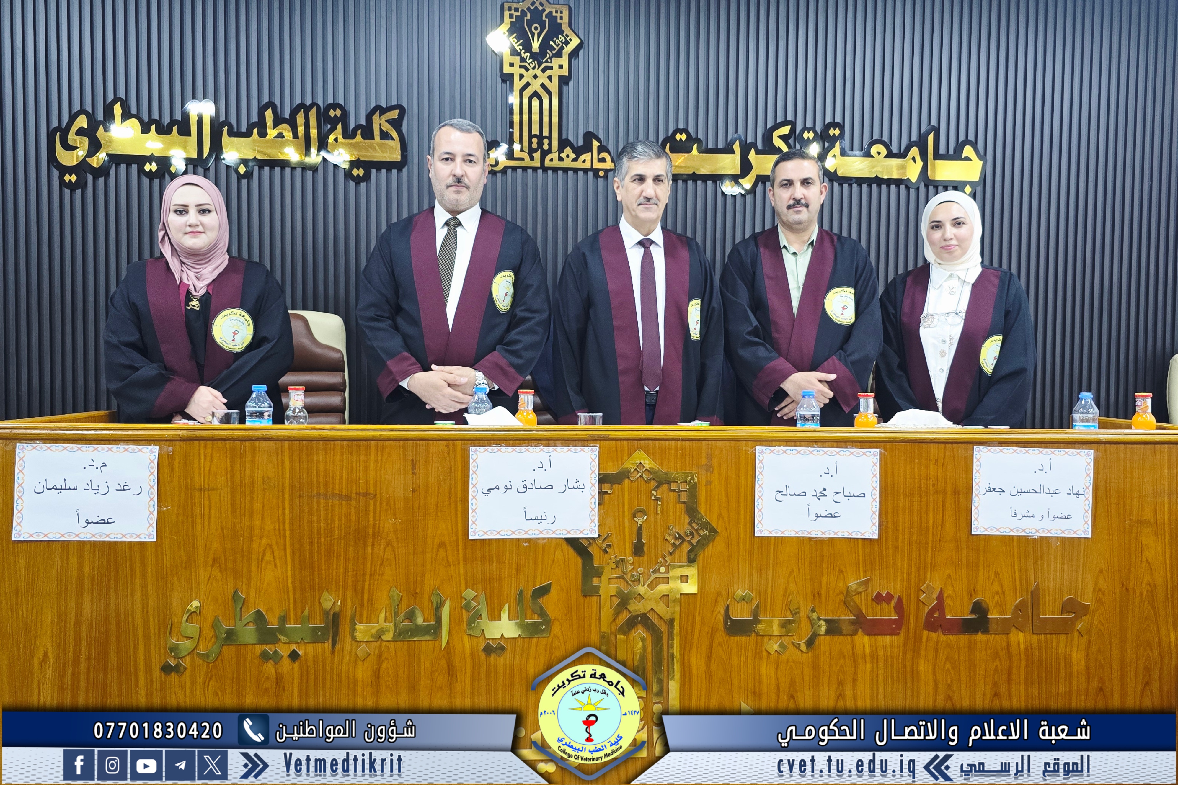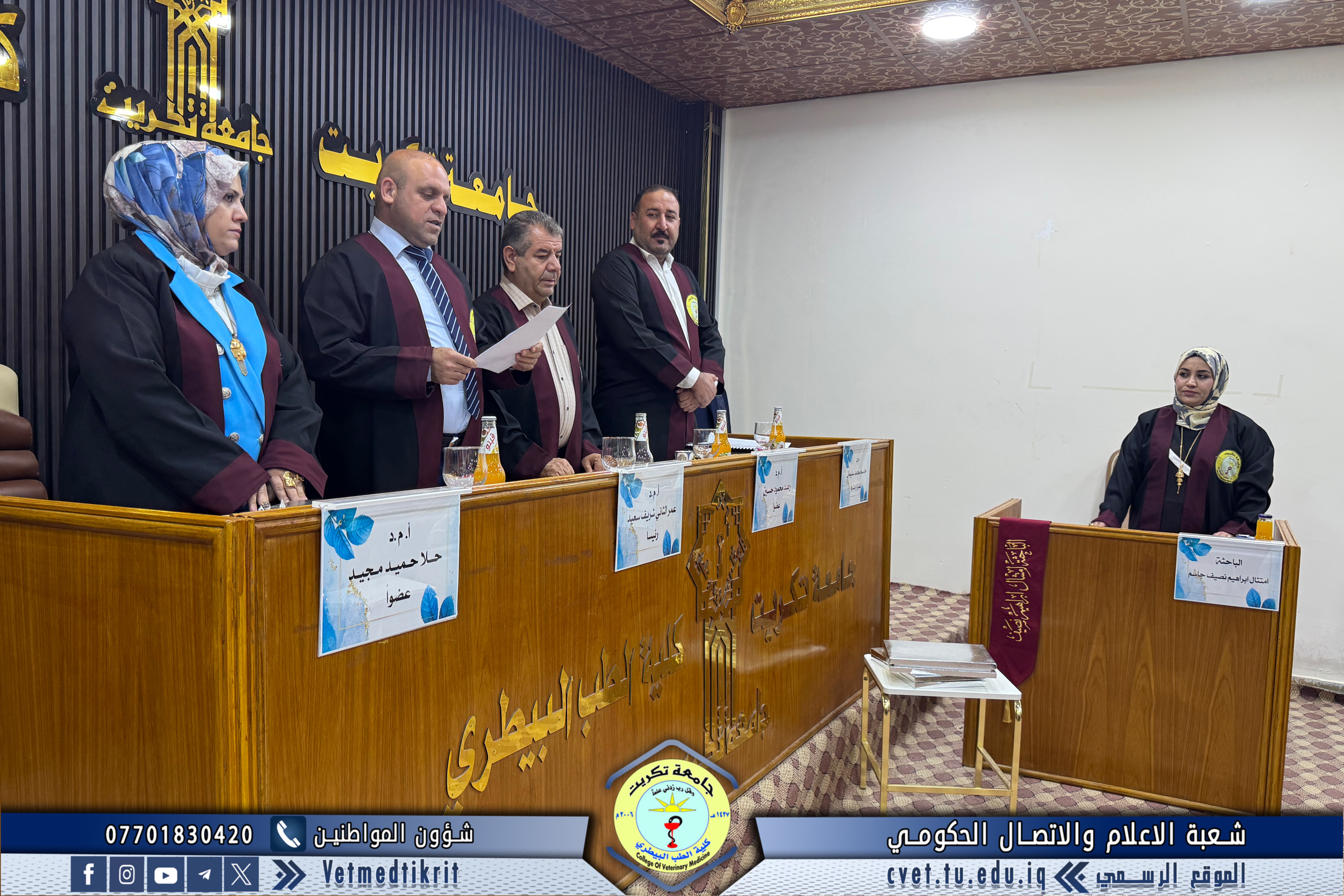 The thesis defense, held in Dr. Muhannad Maher Hall at the College of Veterinary Medicine, was attended by a number of faculty members and a group of students.
