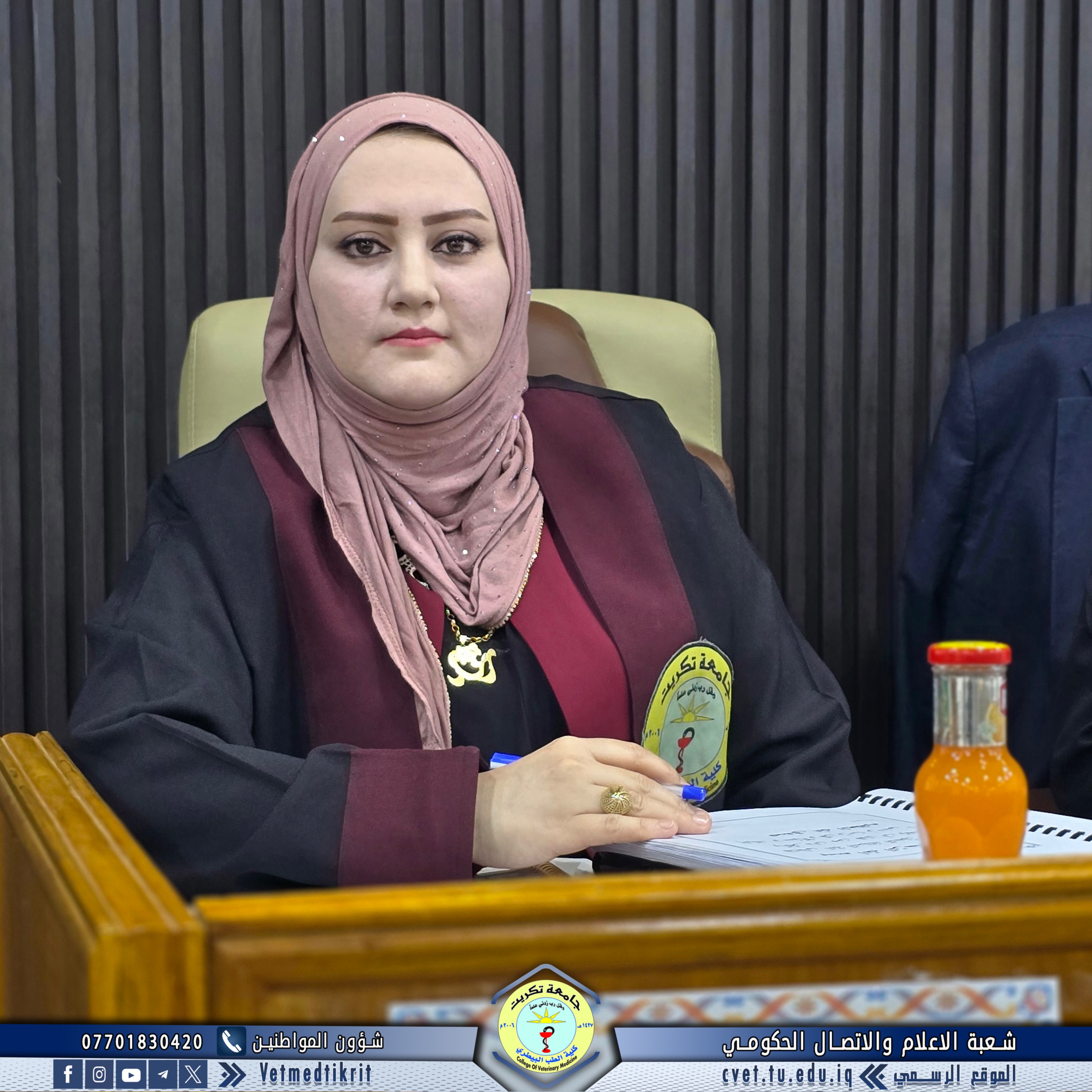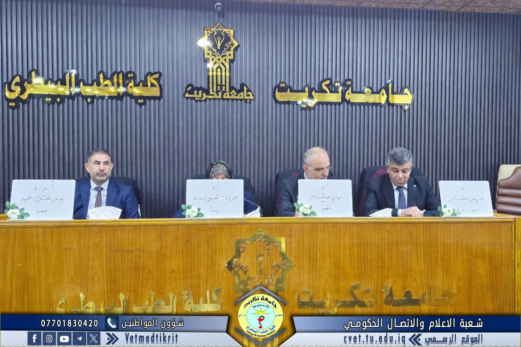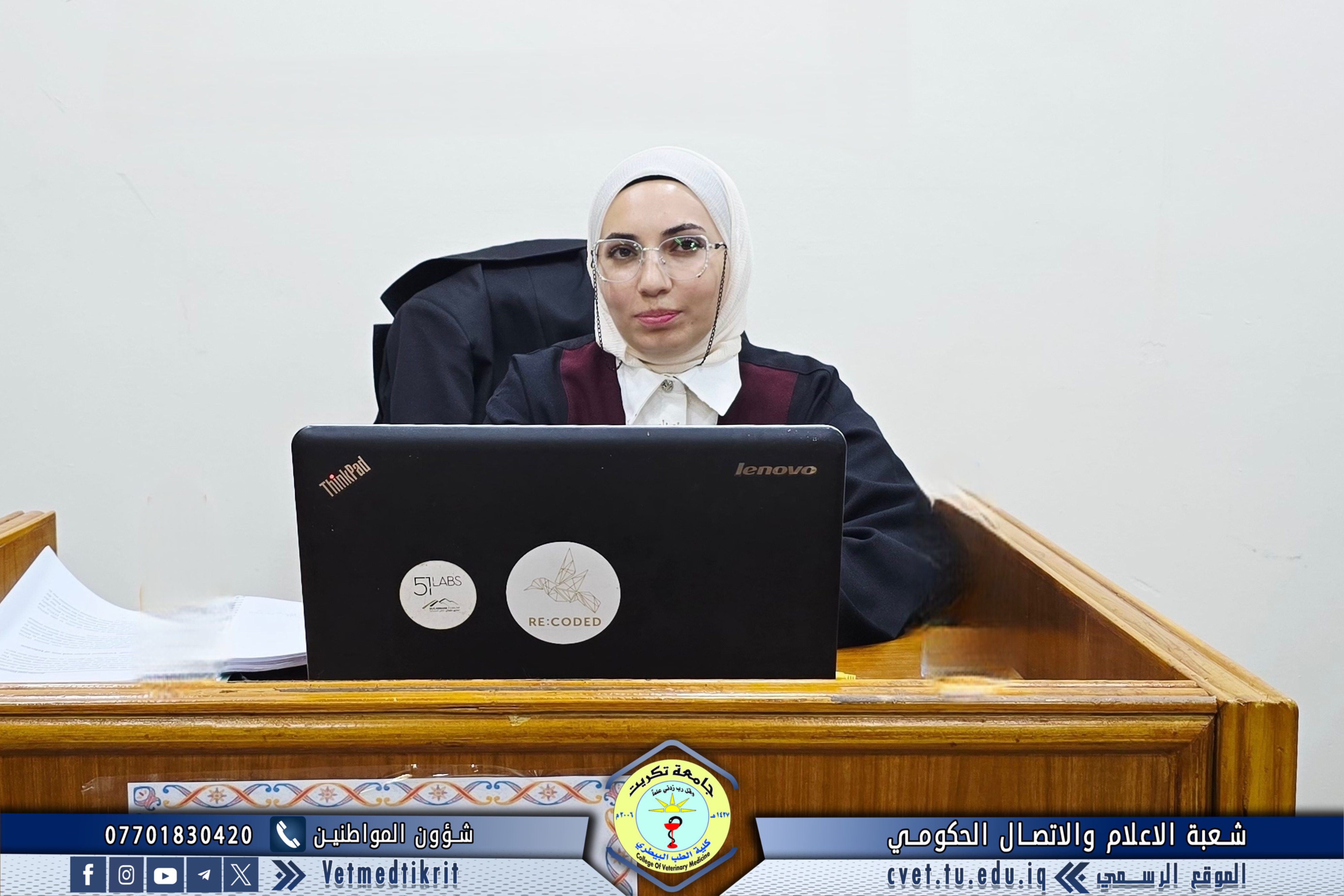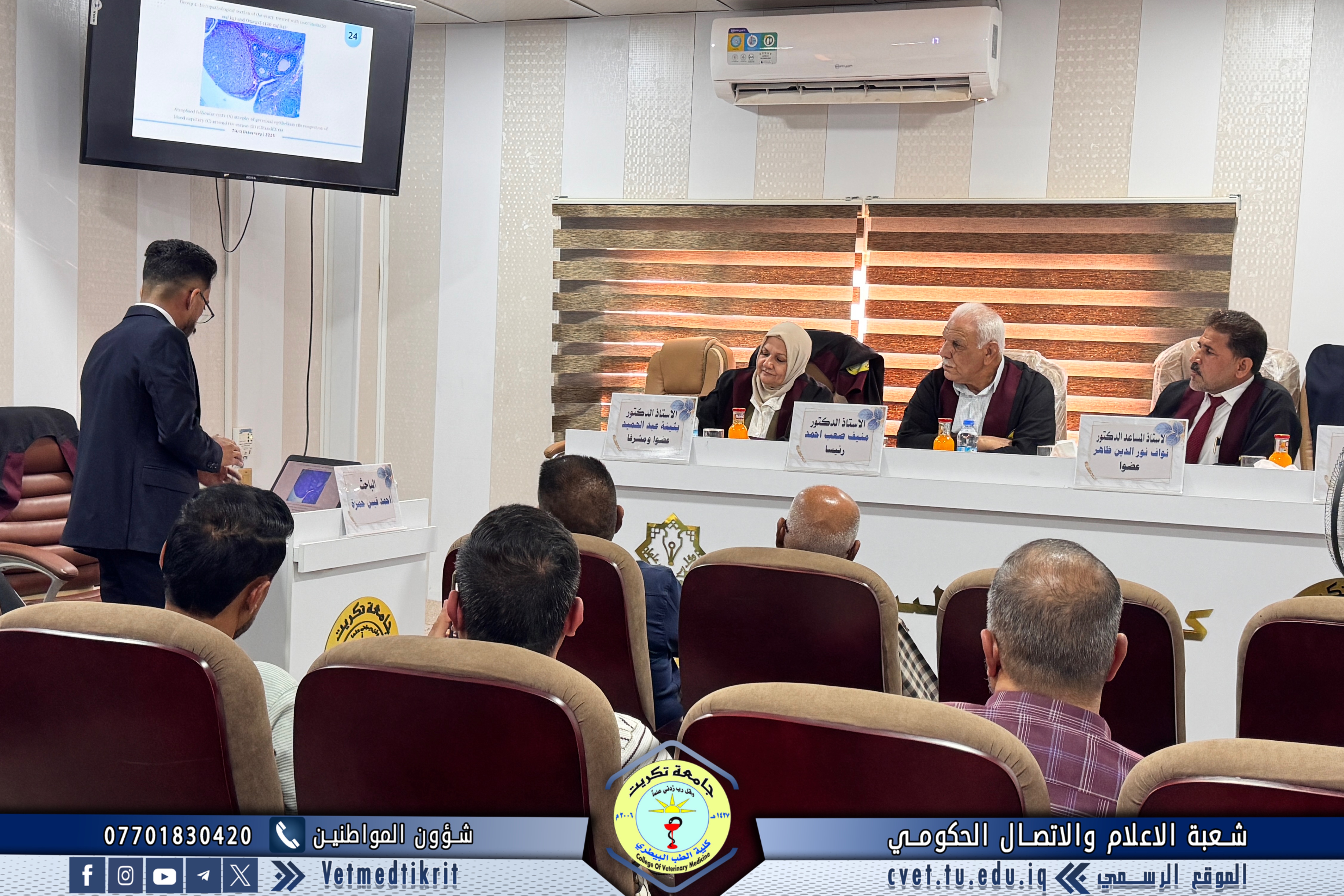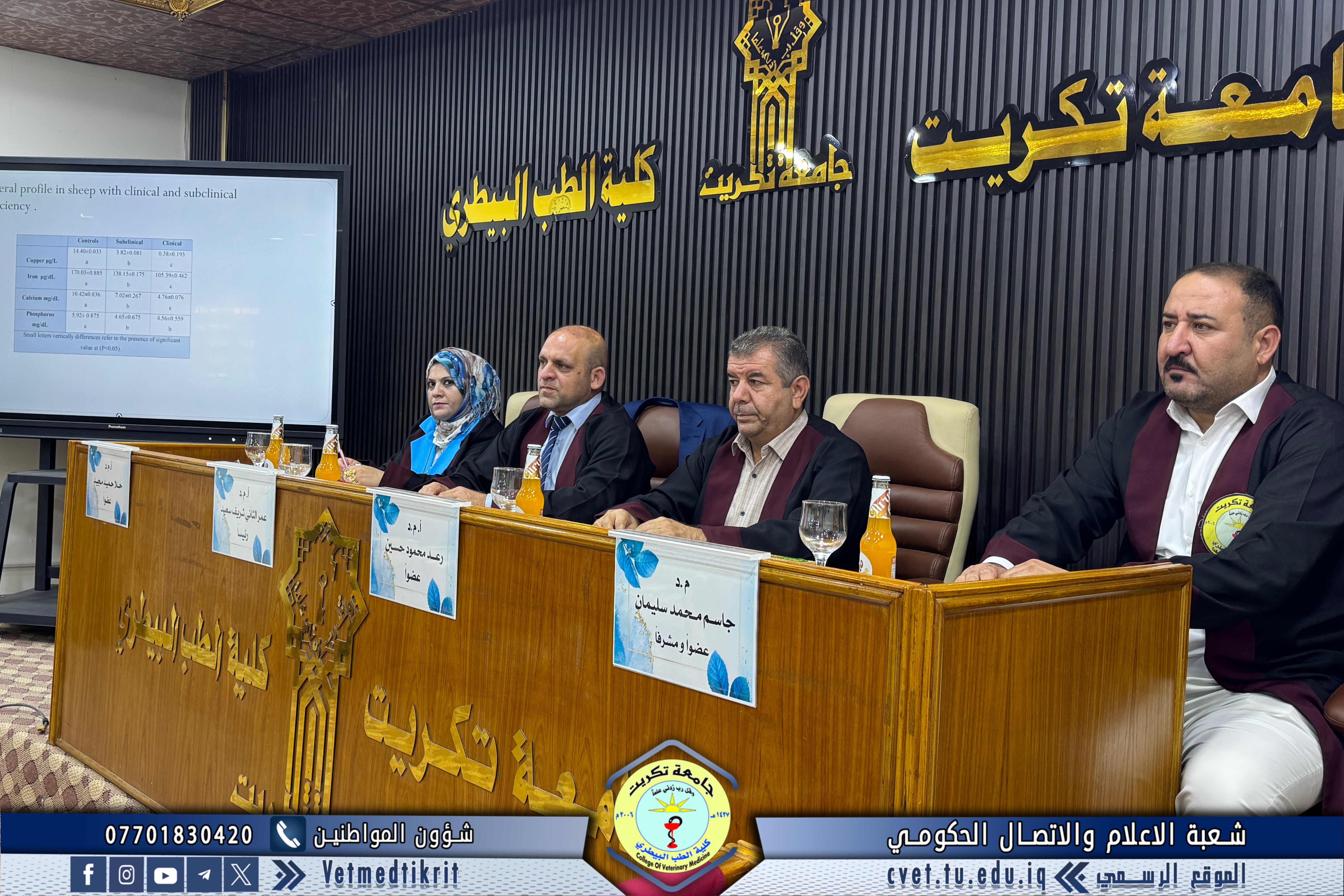 The thesis defense, held in Dr. Muhannad Maher Hall at the College of Veterinary Medicine, was attended by a number of faculty members and a group of students.