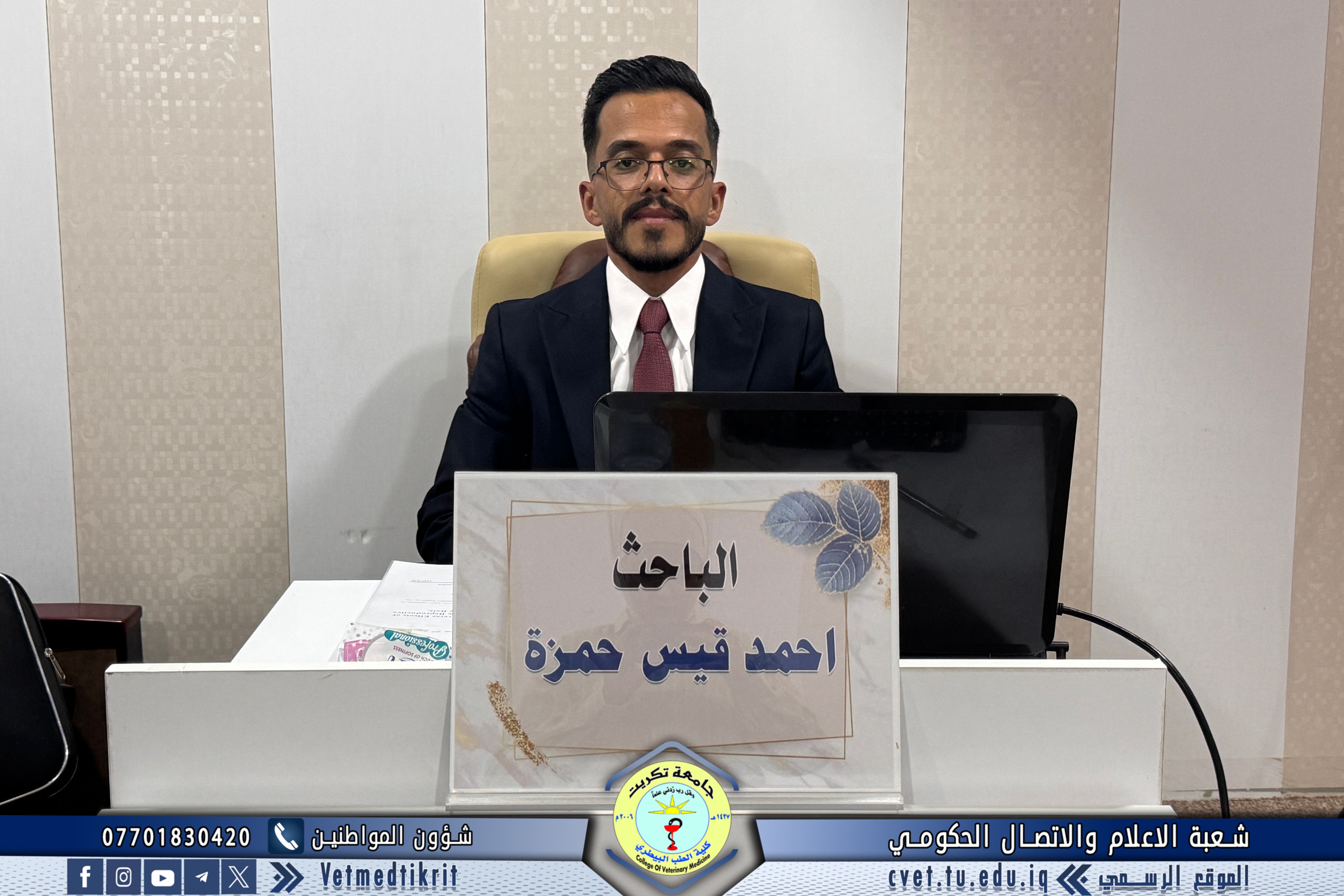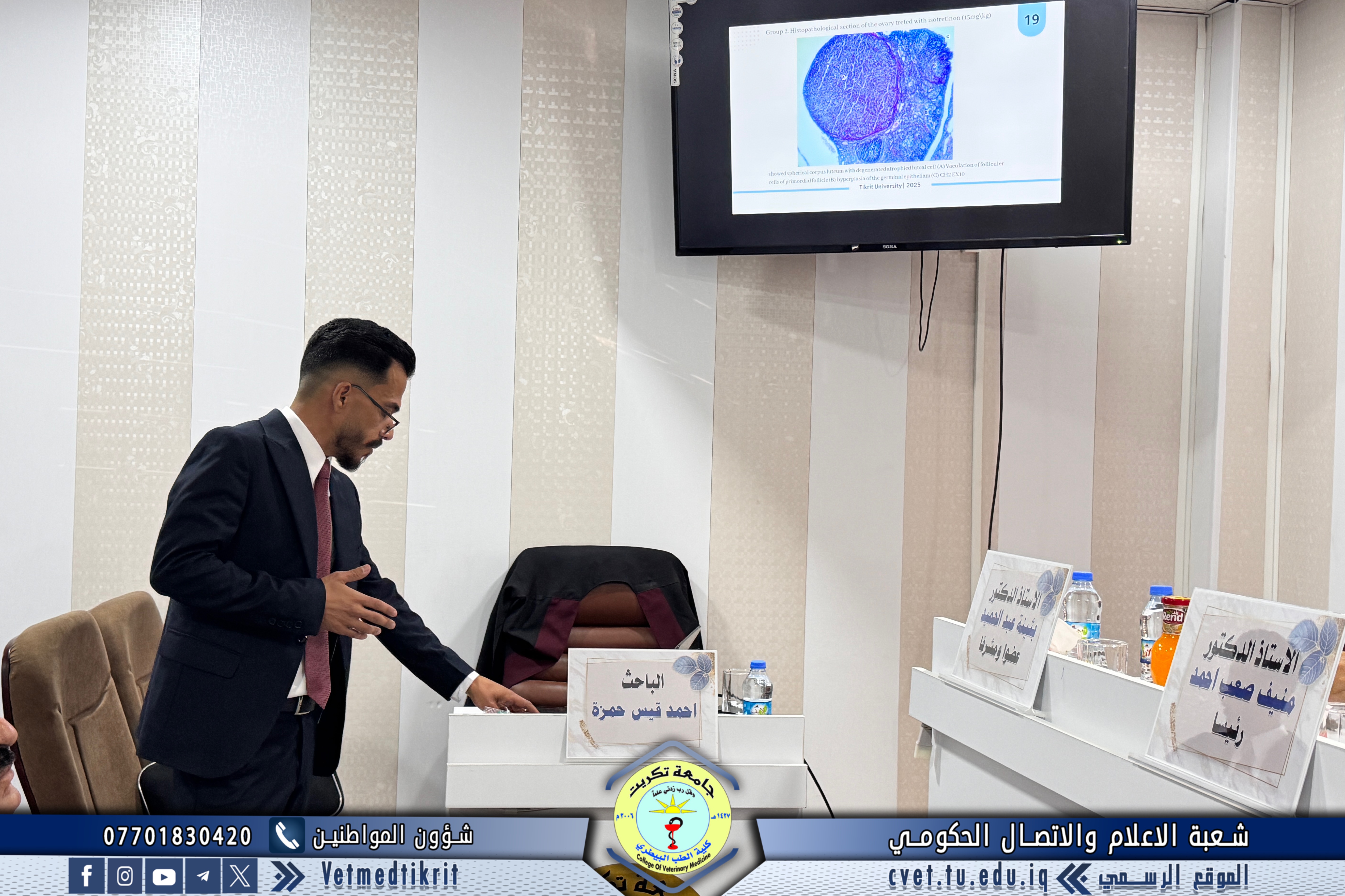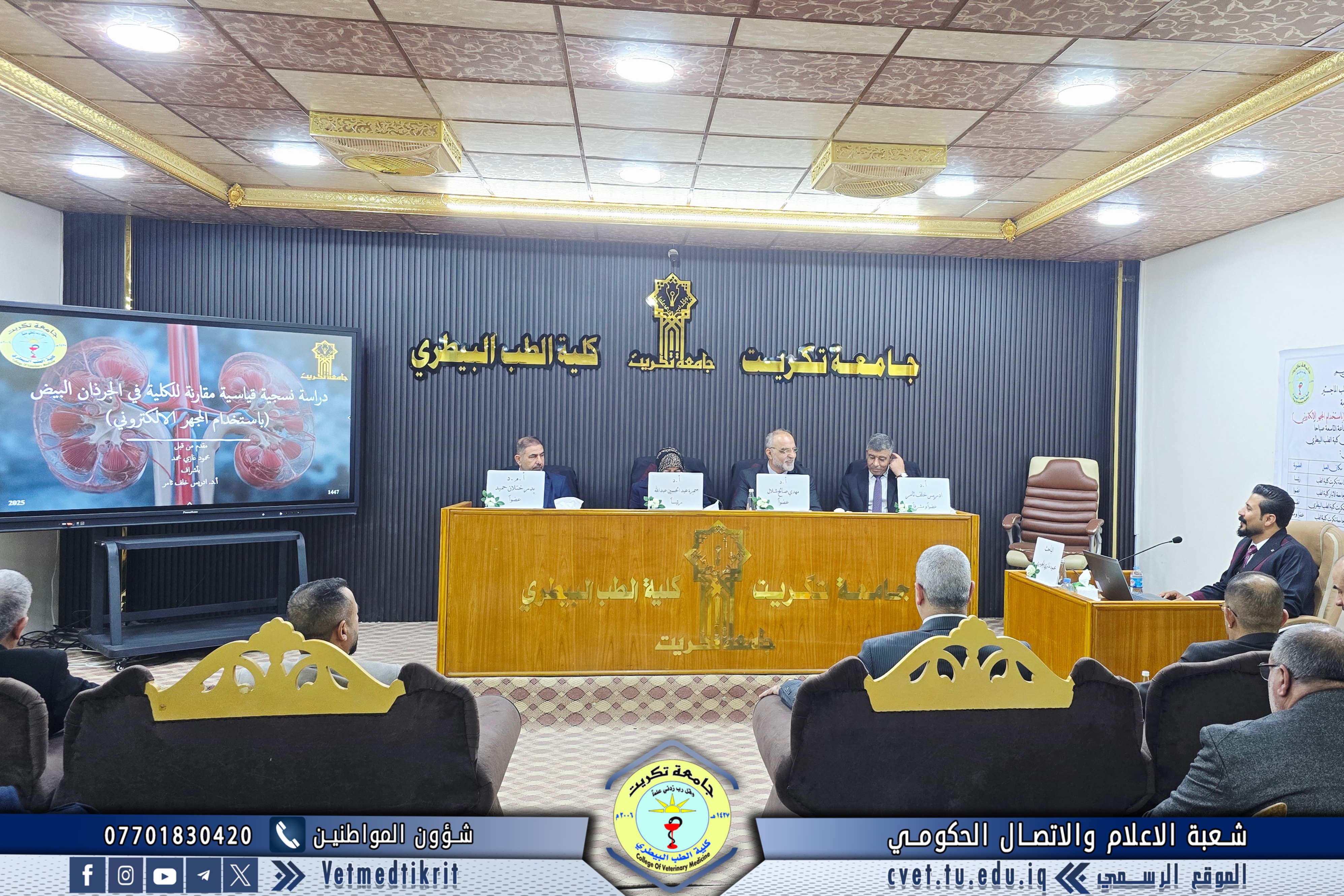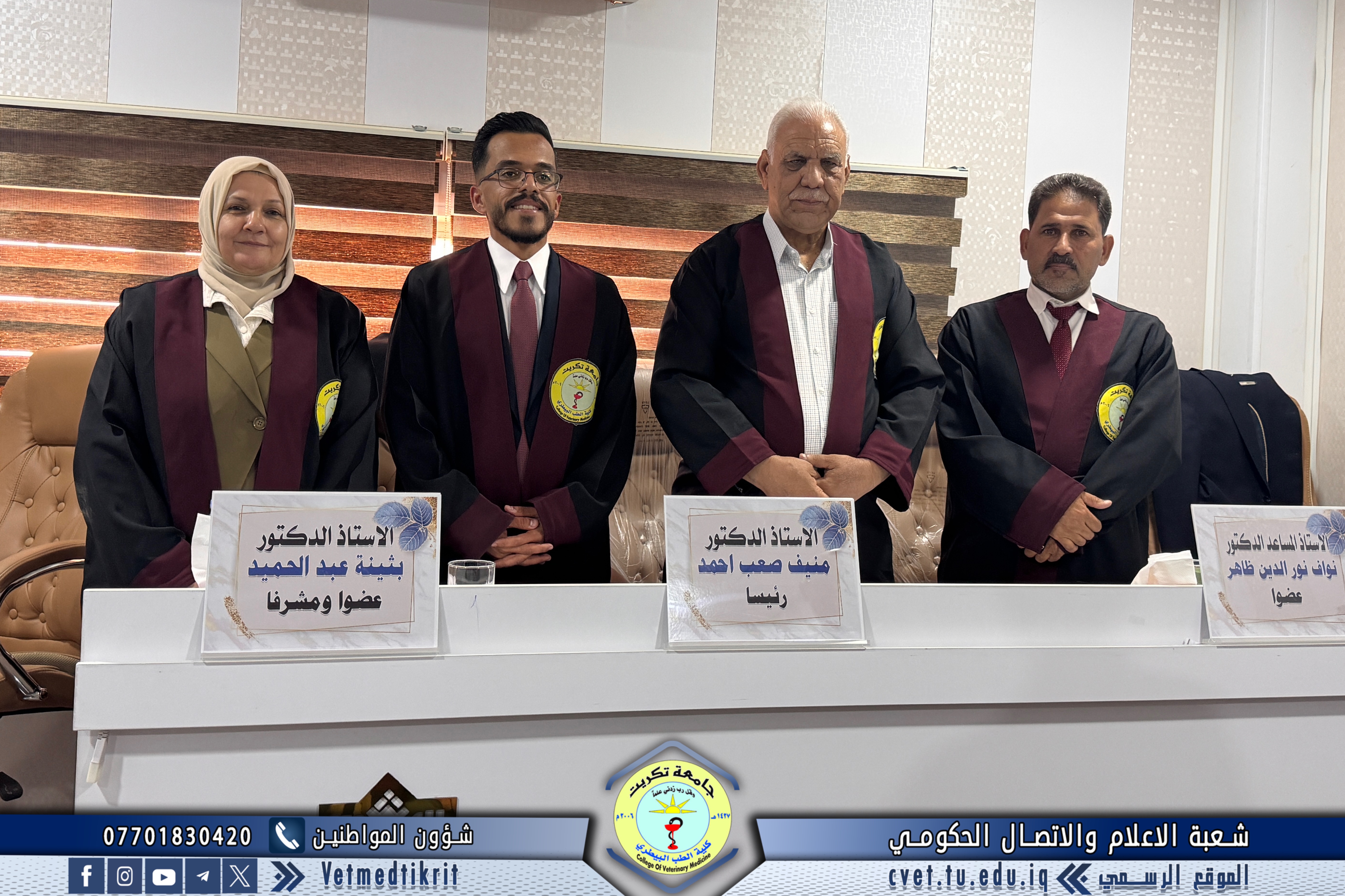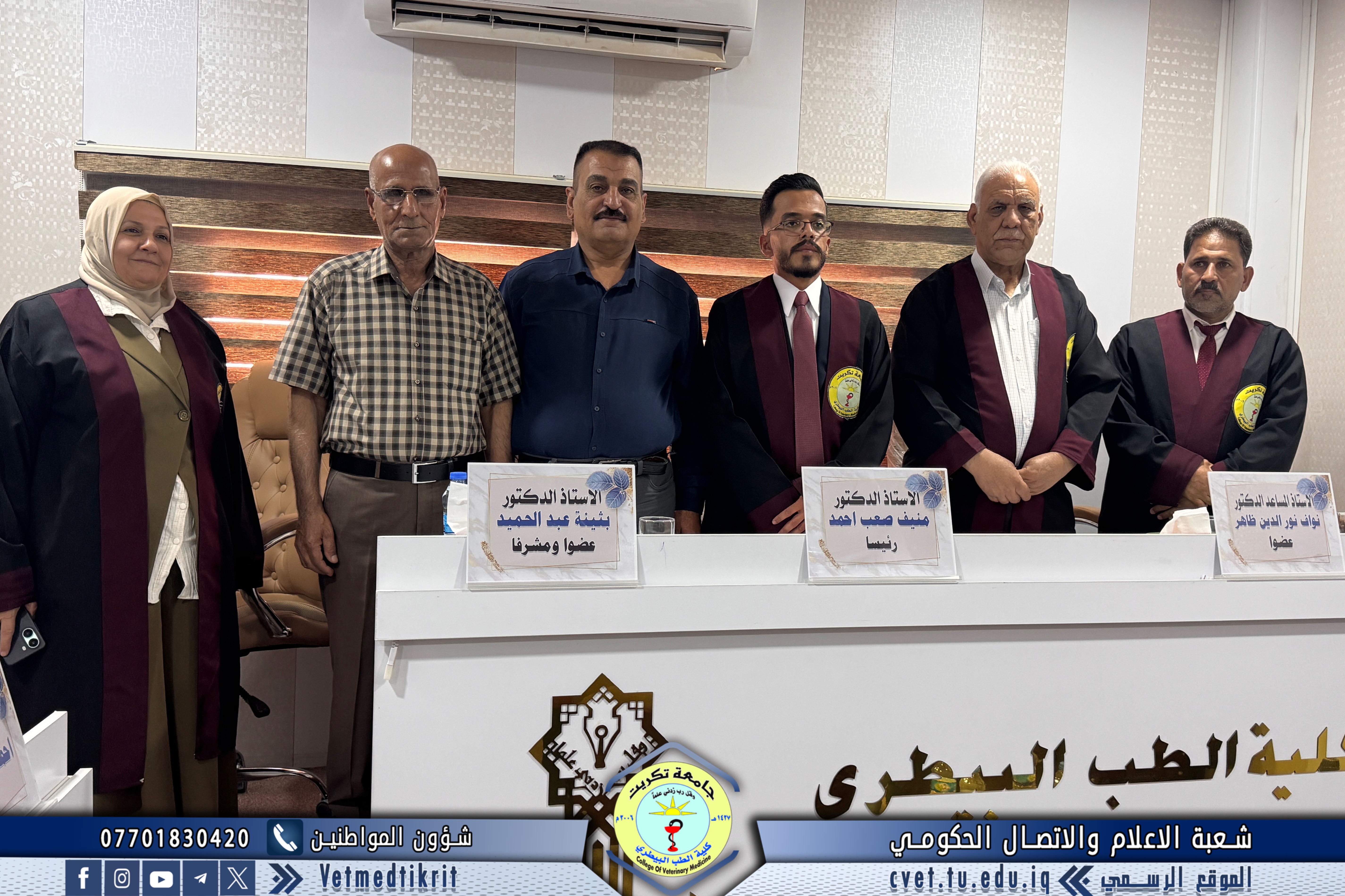 By the grace of Almighty God, the College of Veterinary Medicine at the University of Tikrit held the public defense of the Master’s thesis entitled “A Comparative Standardized Histological Study of the Kidney in Albino Rats (Using the Electron Microscope)”, submitted by the student Mahmoud Ghazi Mohammed in the field of Veterinary Histology.
