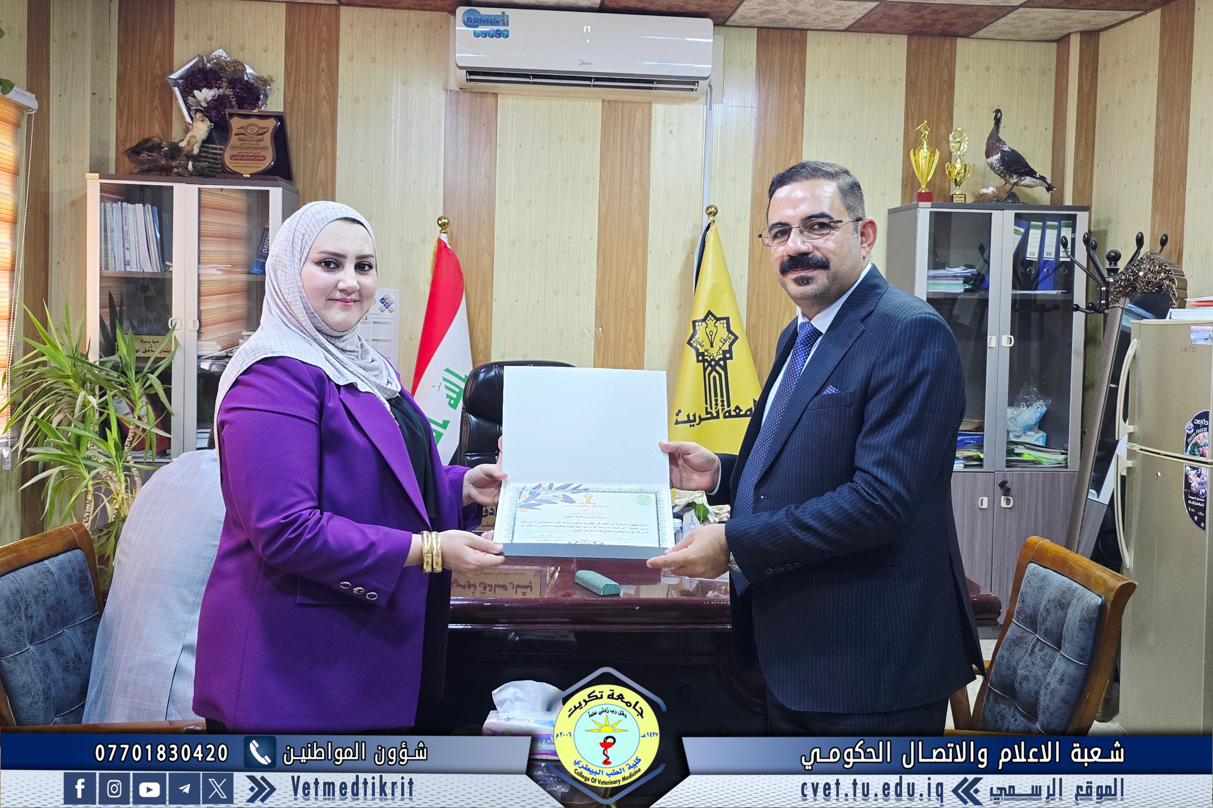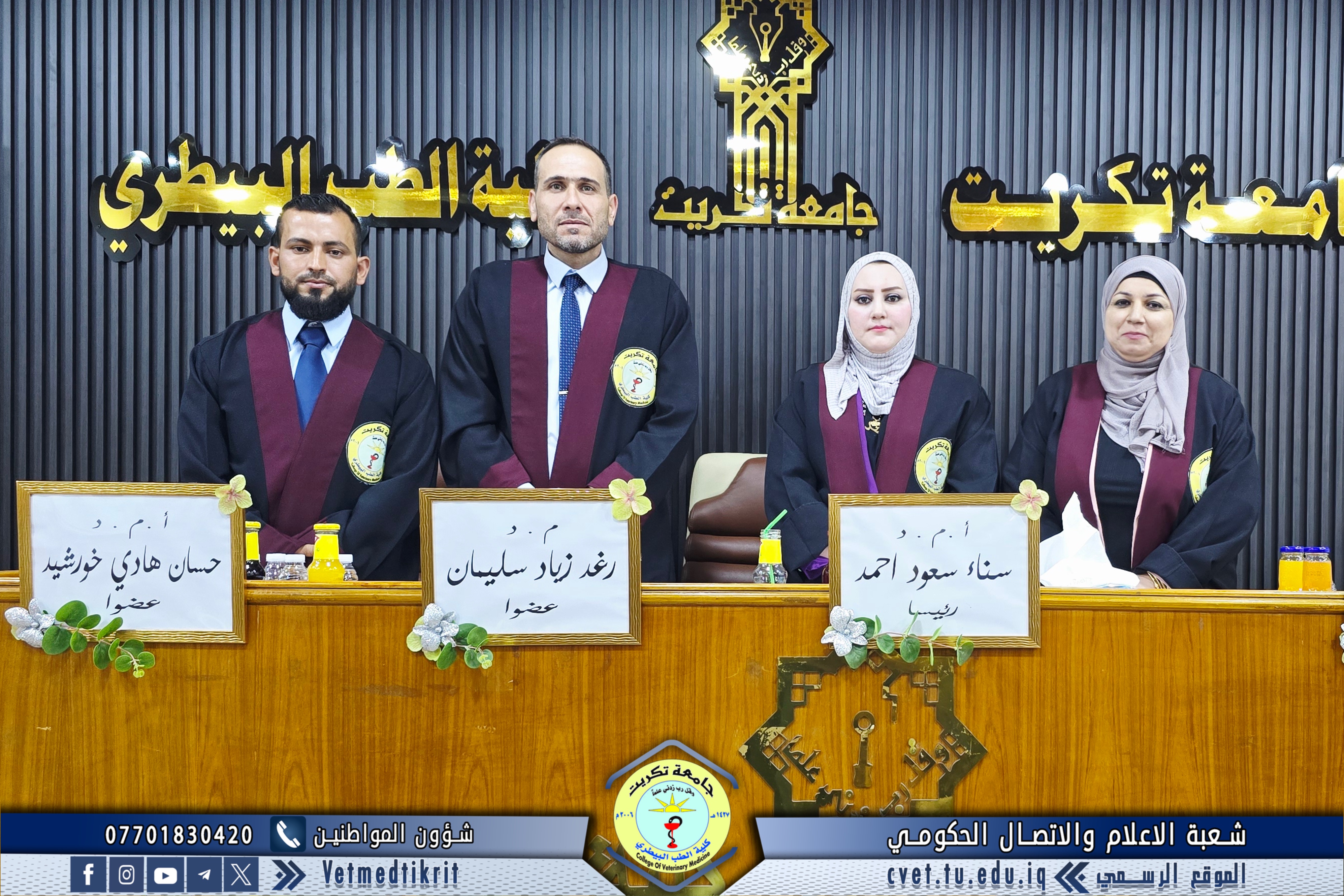 By the grace of God, the Master's thesis entitled "The Antibacterial, Protective, and Immunological Effect of Pyocyanin on Pseudomonas aeruginosa Isolated from Otitis Media in Dogs and Cats" was discussed by Ibrahim Hussein Muhammad, a student majoring in Microbiology, at the College of Veterinary Medicine at Tikrit University. The discussion committee consisted of: