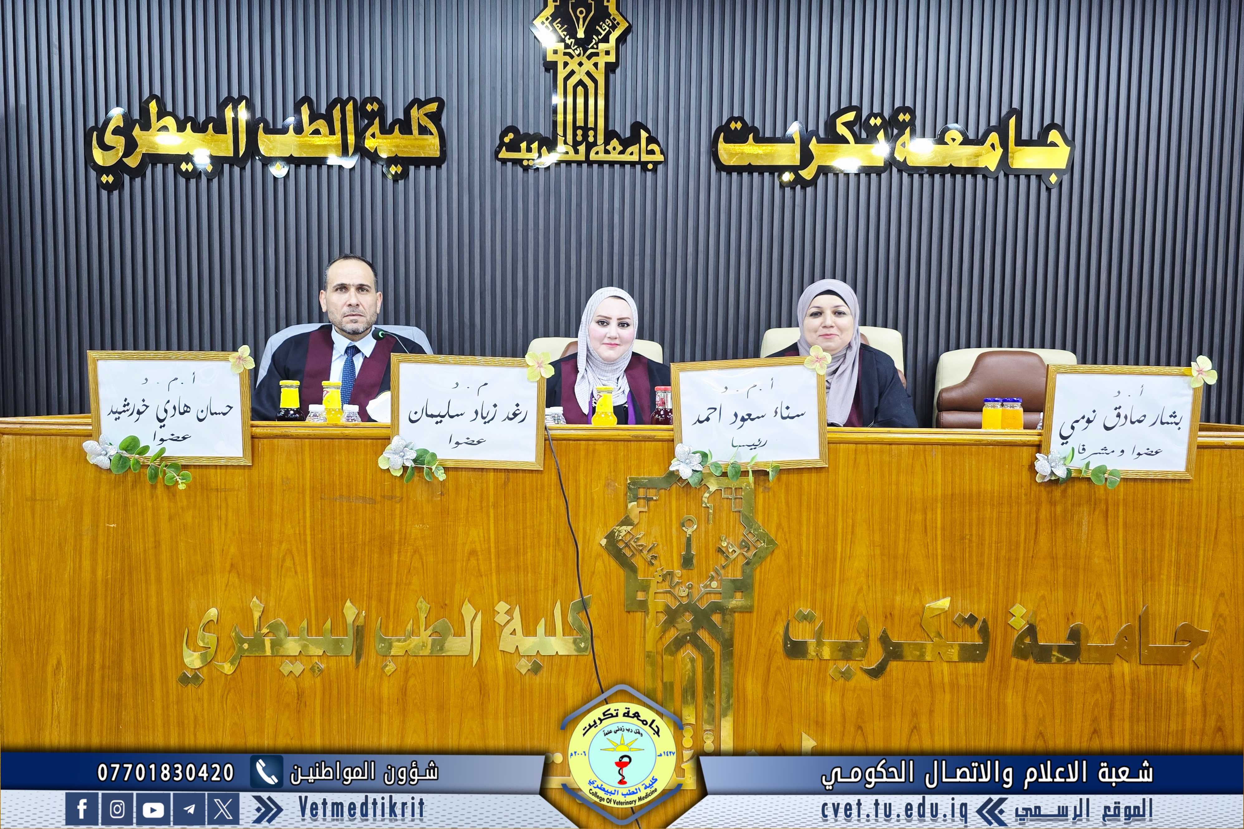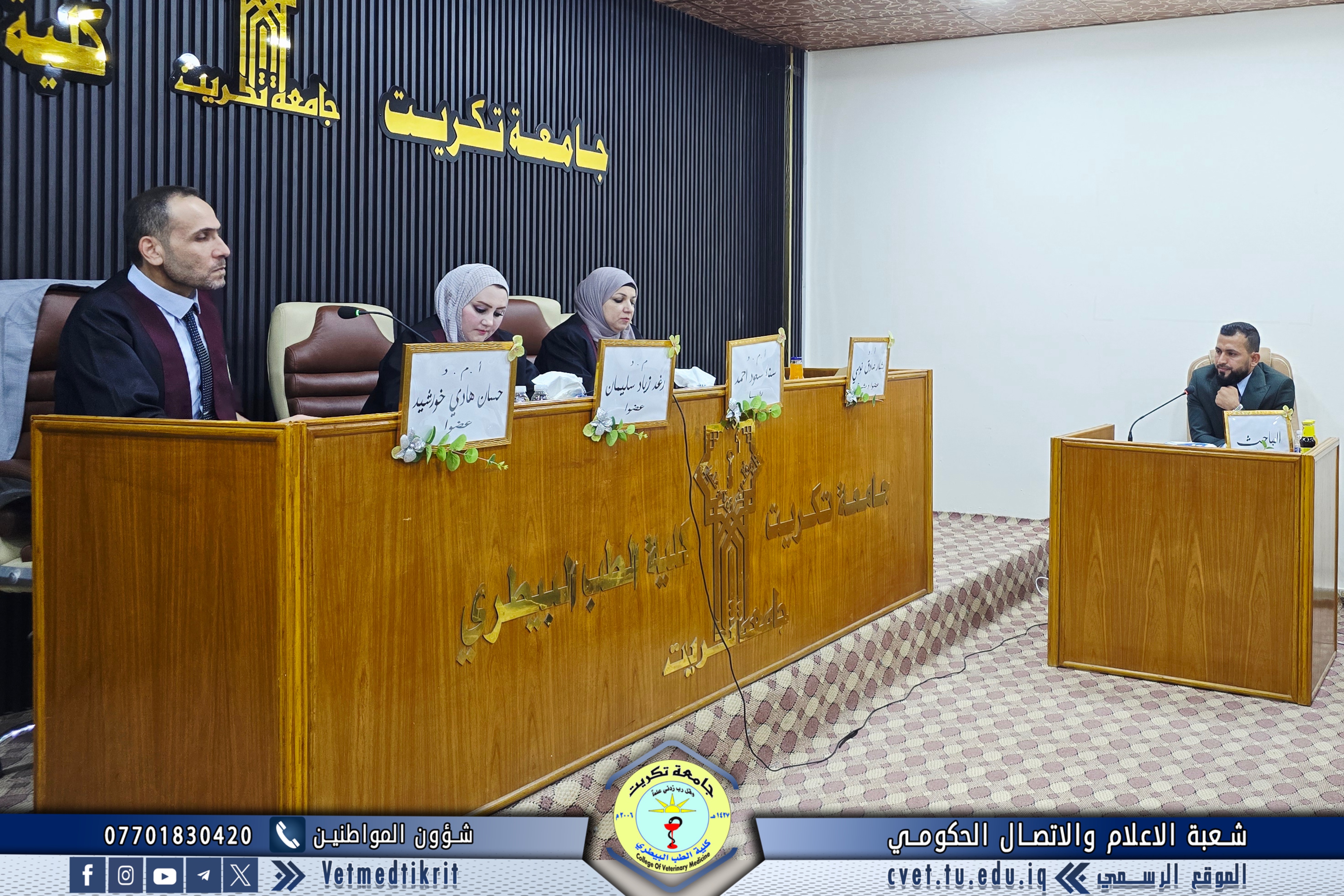 The abstract of the thesis was as follows: Pseudomonas aeruginosa is an important pathogenic bacterium in the medical and veterinary fields, causing numerous diseases in humans and animals, including wound and burn infections, eye infections, skin infections, urinary tract infections, middle ear infections, septicemia, and bone and joint infections. Among these diseases, middle ear infections are prominent, which are frequently observed in pets such as dogs and cats. To isolate and identify pyocyanin-producing Pseudomonas aeruginosa bacteria and their resistance to antibiotics, 40 ear swabs were collected from domestic cats admitted to private veterinary clinics in Tikrit, diagnosed with otitis, during December 2024. Ear swabs were collected from the infected cats using sterile cotton swabs, and Pseudomonas aeruginosa was isolated and identified. The study demonstrated the isolate's ability to produce large quantities of the exochrome pyocyanin when cultured on King's A medium. This pigment exhibited significant inhibitory activity against S. aureus and Candida albicans, but had no effect on E. coli or E. faecalis, highlighting its potential as a potential antimicrobial. In bone marrow cell cultures, results showed that pyocyanin exerts a direct cytotoxic effect, with varying degrees of damage depending on the associated microbe. The negative effect was greater when pyocyanin was combined with E. coli and E. faecalis, while it was less severe with S. aureus and Candida albicans, due to the hemoglobin inhibiting the growth of these organisms. These results indicate that pyocyanin has a dual nature: on the one hand, it is an important virulence factor for P. aeruginosa, and on the other hand, it possesses antibacterial and antifungal properties that could be employed in future therapeutic fields, provided its concentration is controlled to reduce its toxicity to host cells. The discussion, held in Dr. Muhannad Maher Hall at the College of Veterinary Medicine, was attended by a number of faculty members and students.