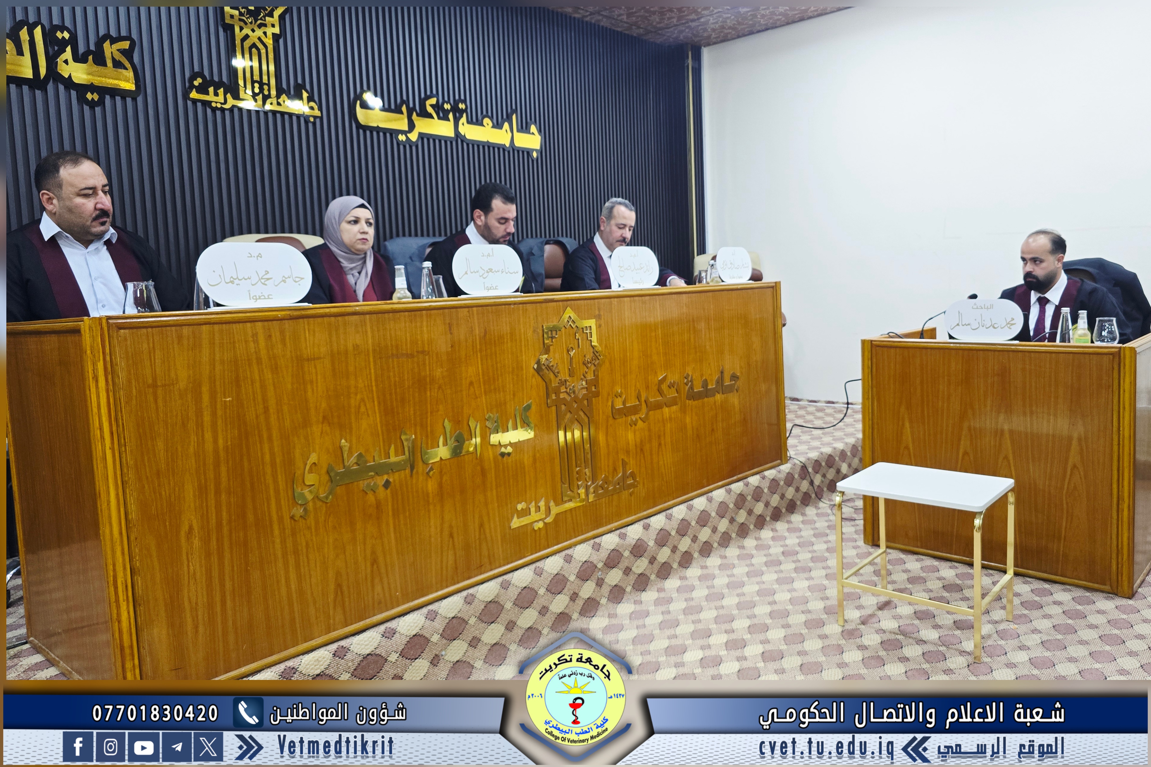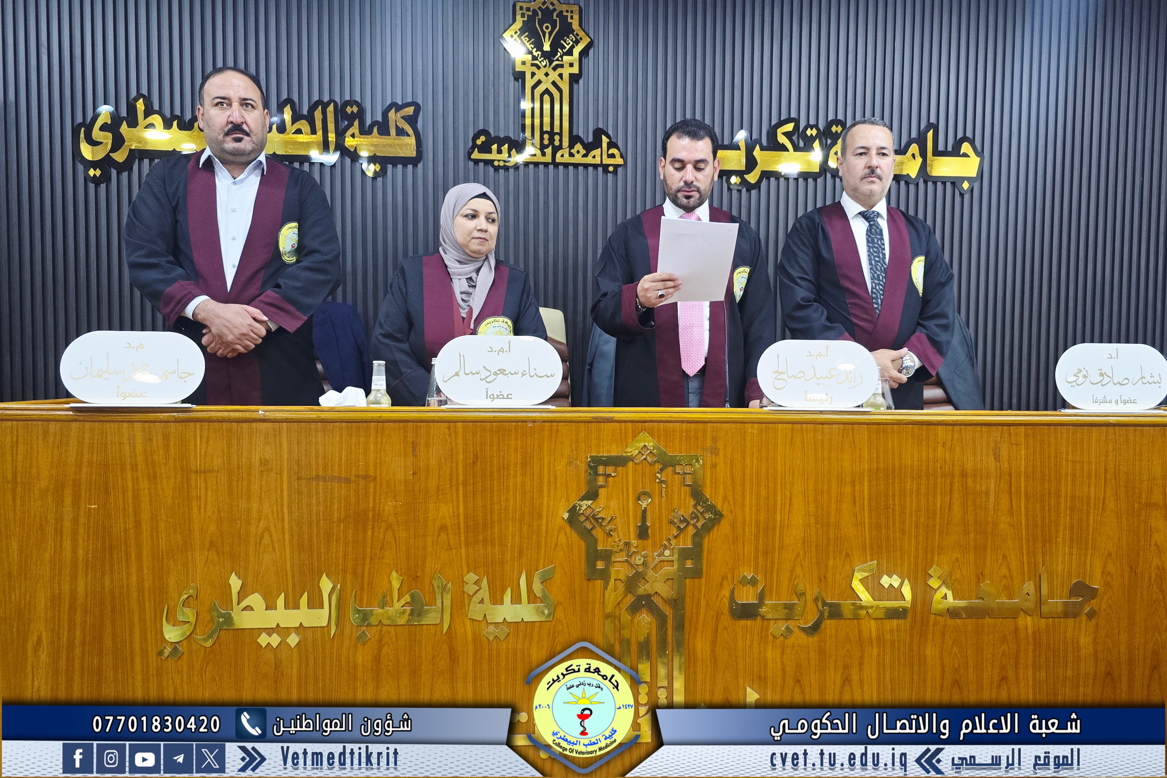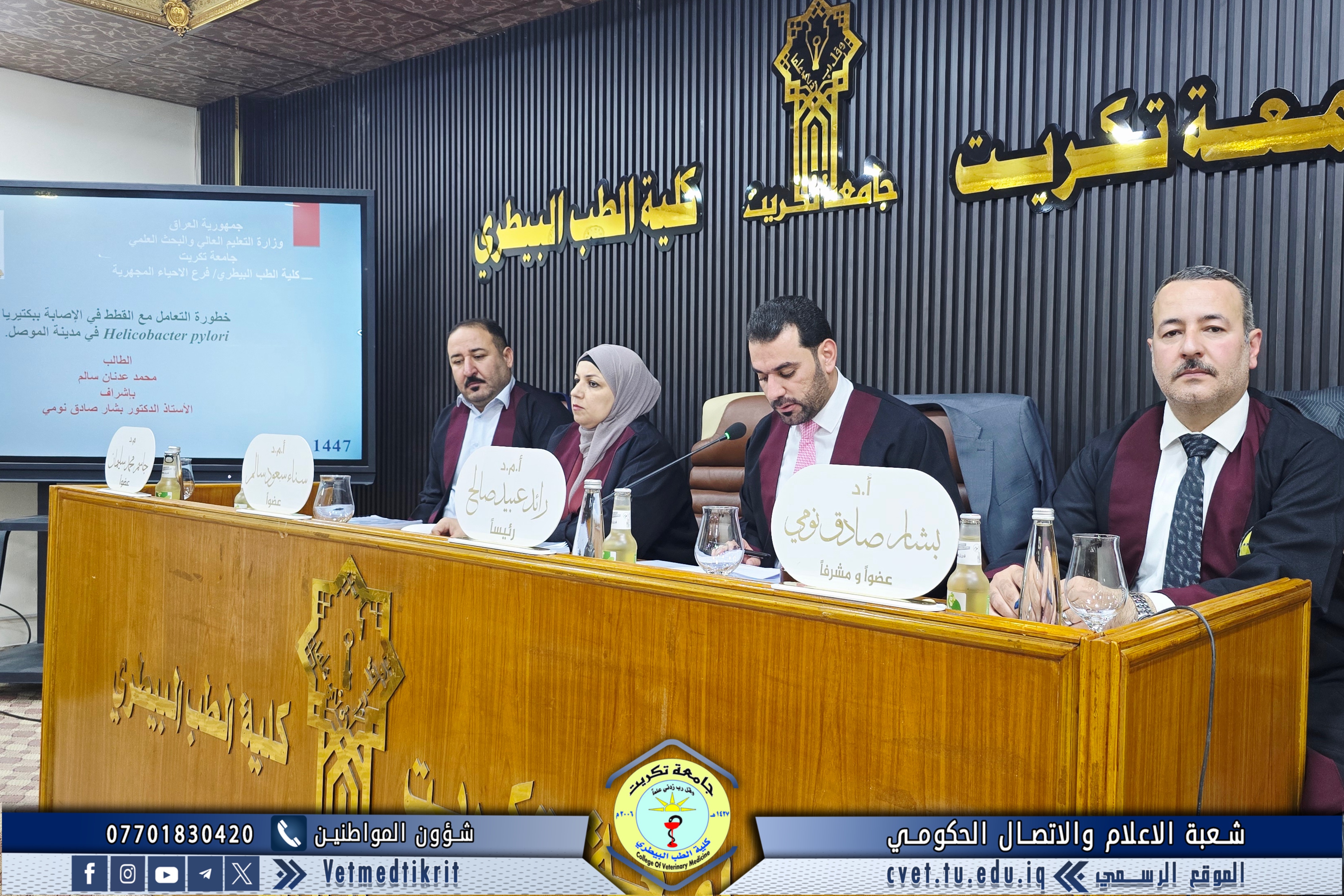 By the grace of God, the Master's thesis entitled "The Dangers of Handling Cats in Helicobacter pylori Infection in Mosul" was discussed by the student (Mohammed Adnan Salem Qasim) majoring in (Microbiology) at the College of Veterinary Medicine at Tikrit University. The discussion committee consisted of: