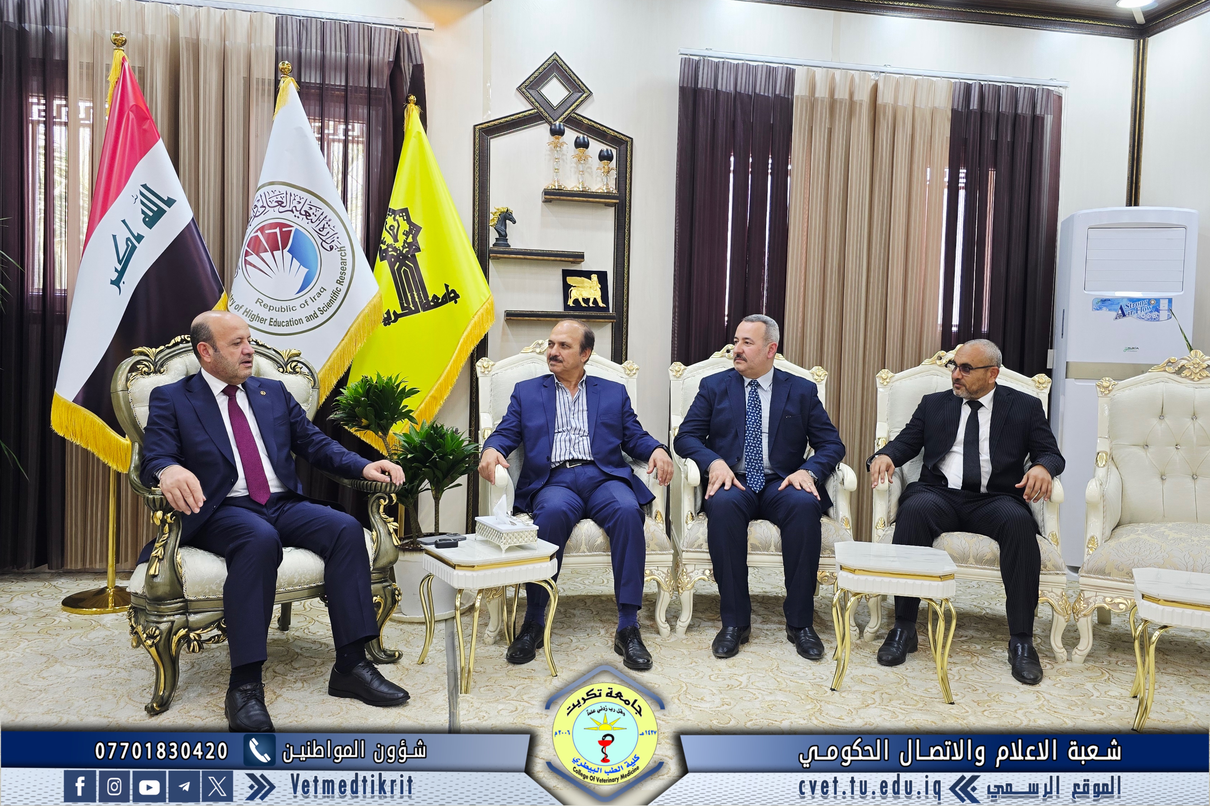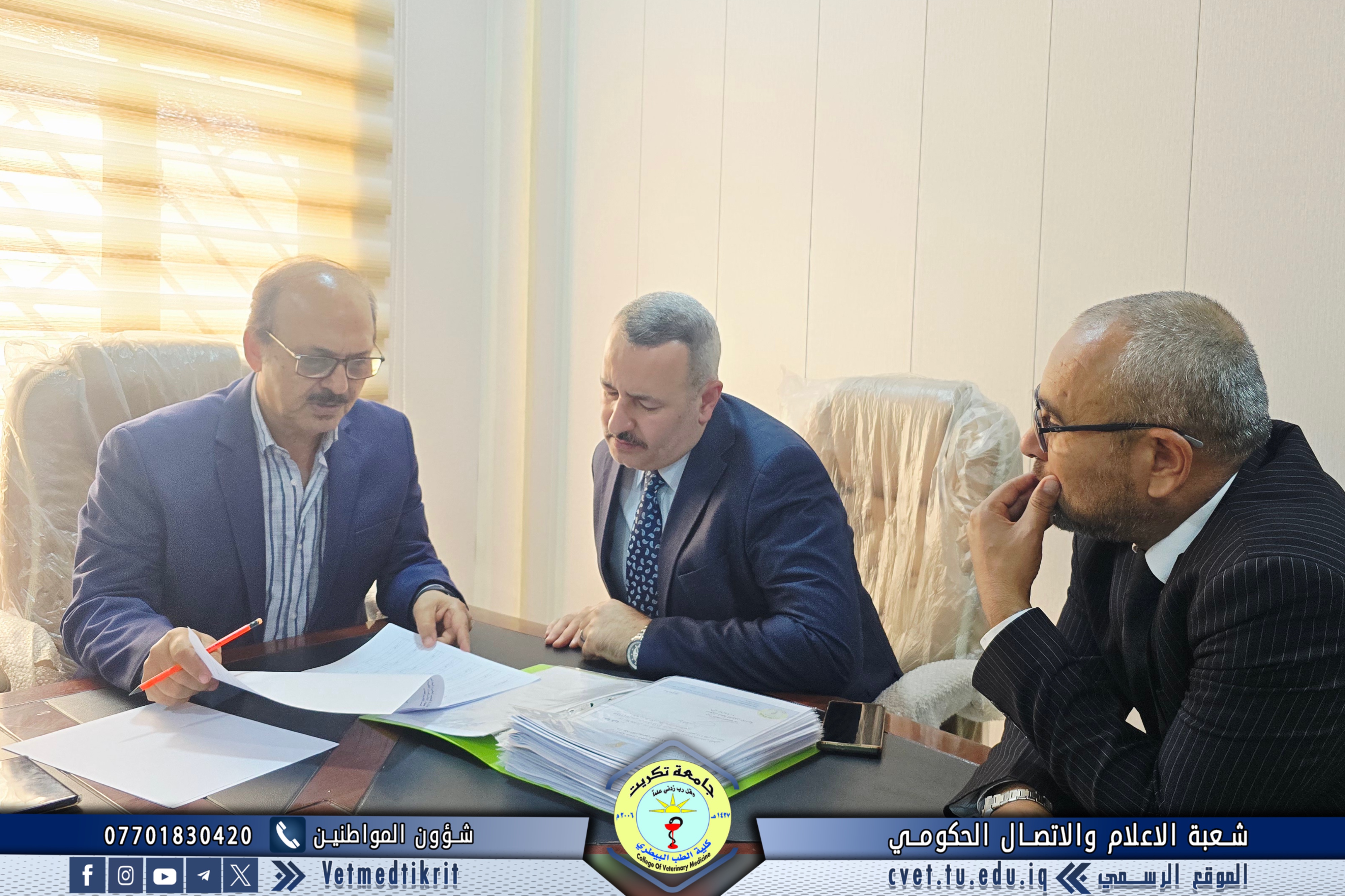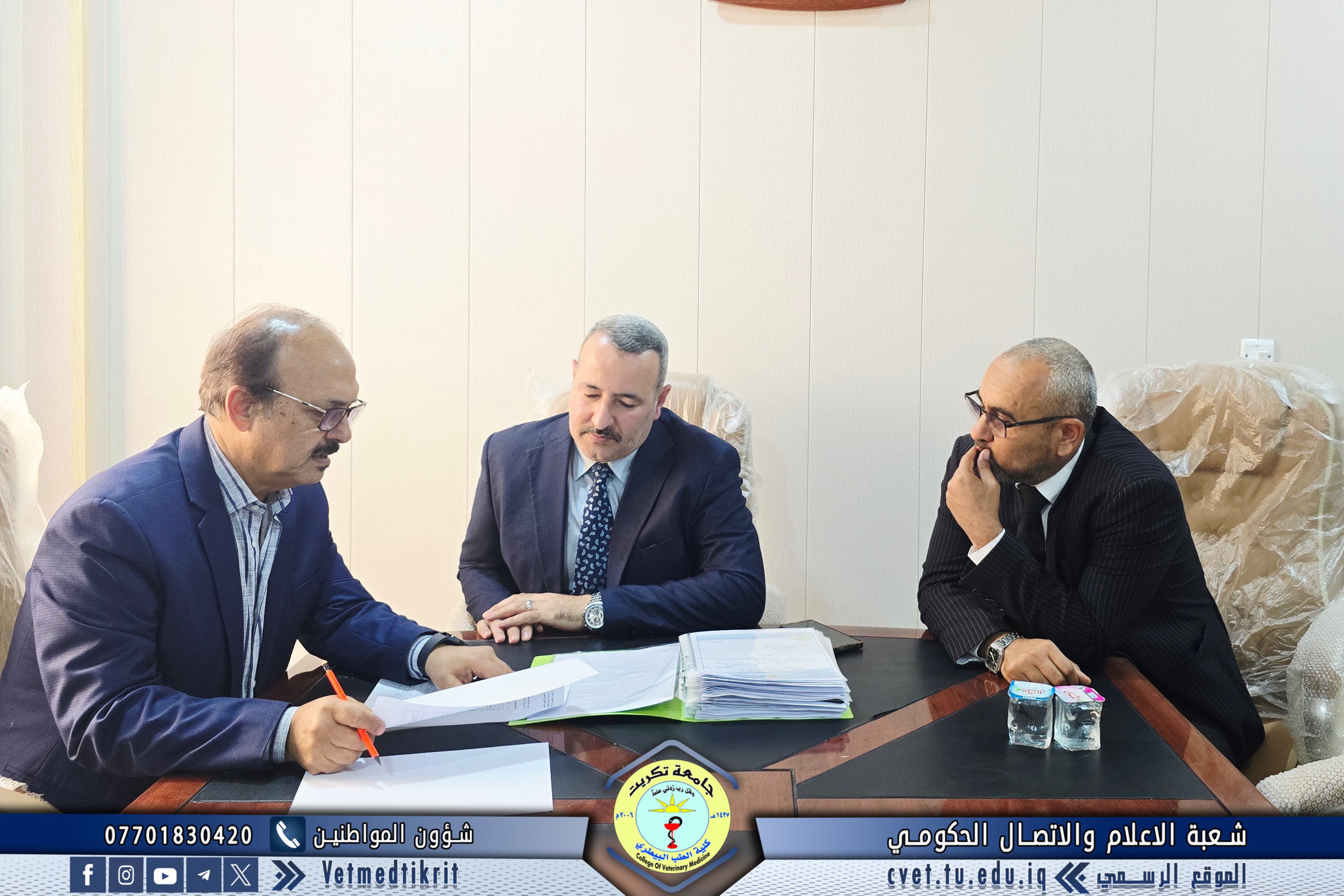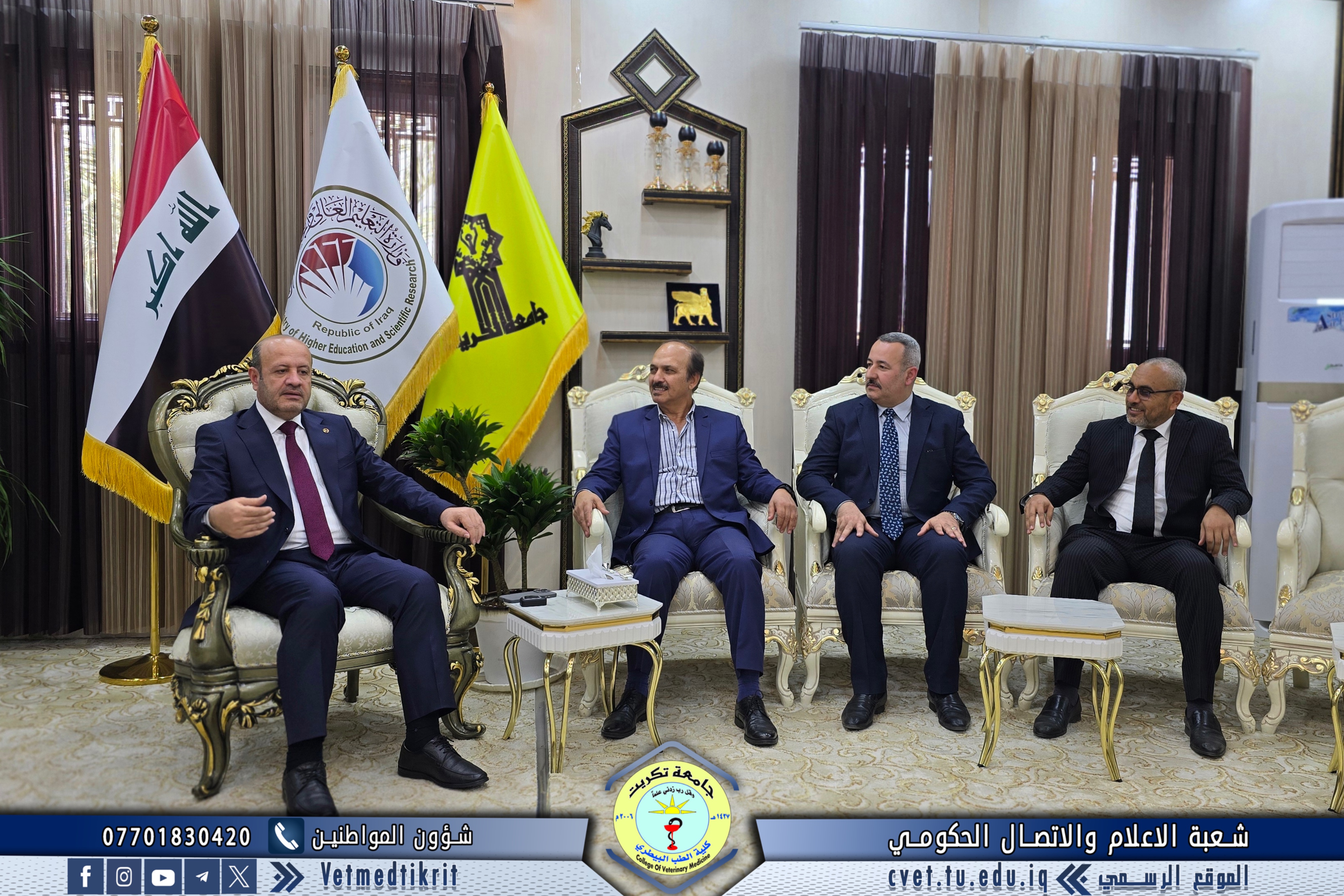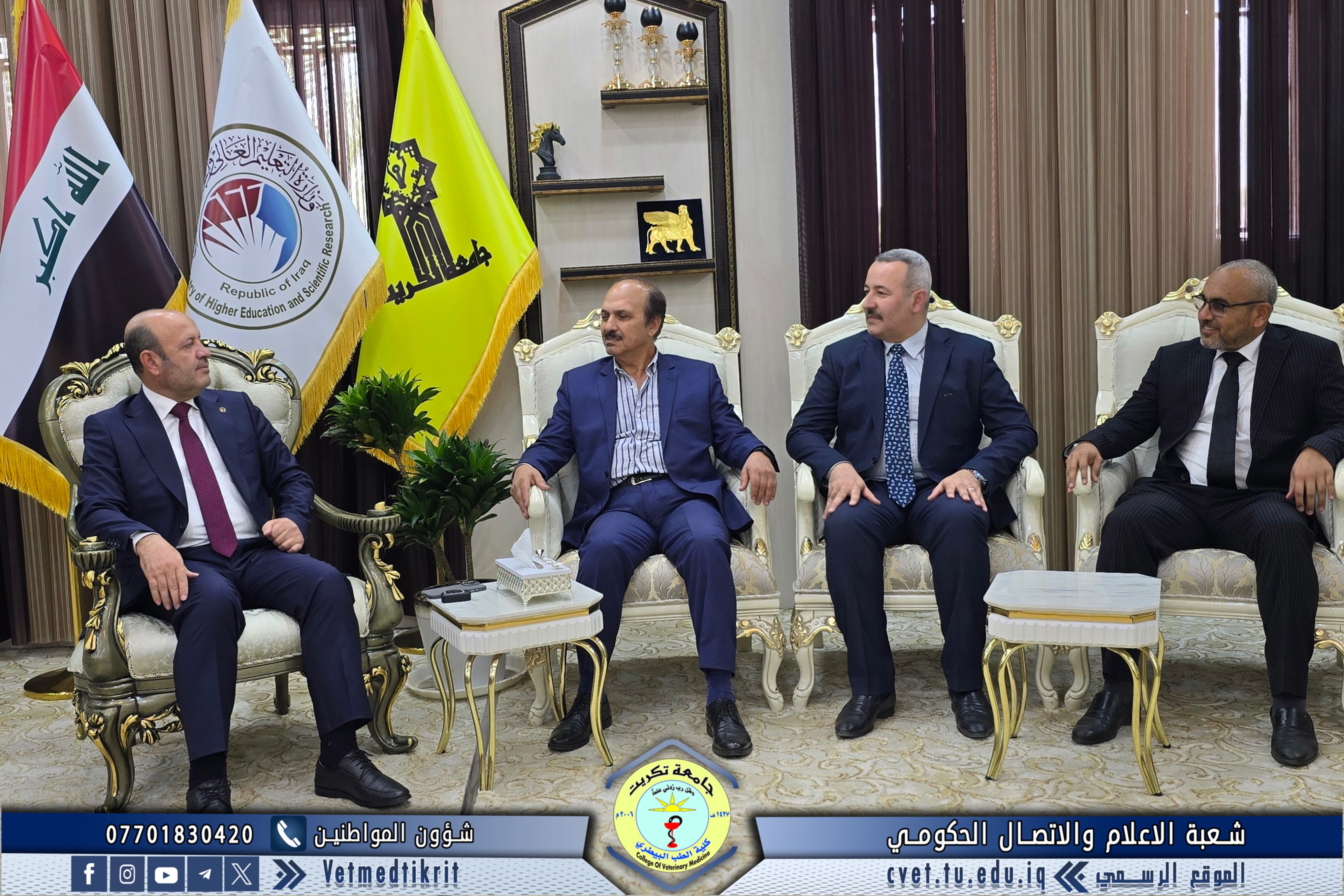 The College of Veterinary Medicine at the University of Tikrit welcomed the Ministerial Committee for Evaluating the Academic and Scientific Reality of the college. The committee was received by Prof. Dr. Bashar Sadiq Noami, Dean of the College; Asst. Prof. Dr. Montaser Mohammed Hilal, Associate Dean for Scientific Affairs; Asst. Prof. Dr. Osama Hamid Shihab, Associate Dean for Administrative Affairs; and Asst. Prof. Dr. Ahmed Abdullah Sultan, Director of the Quality Assurance and University Performance Division.
