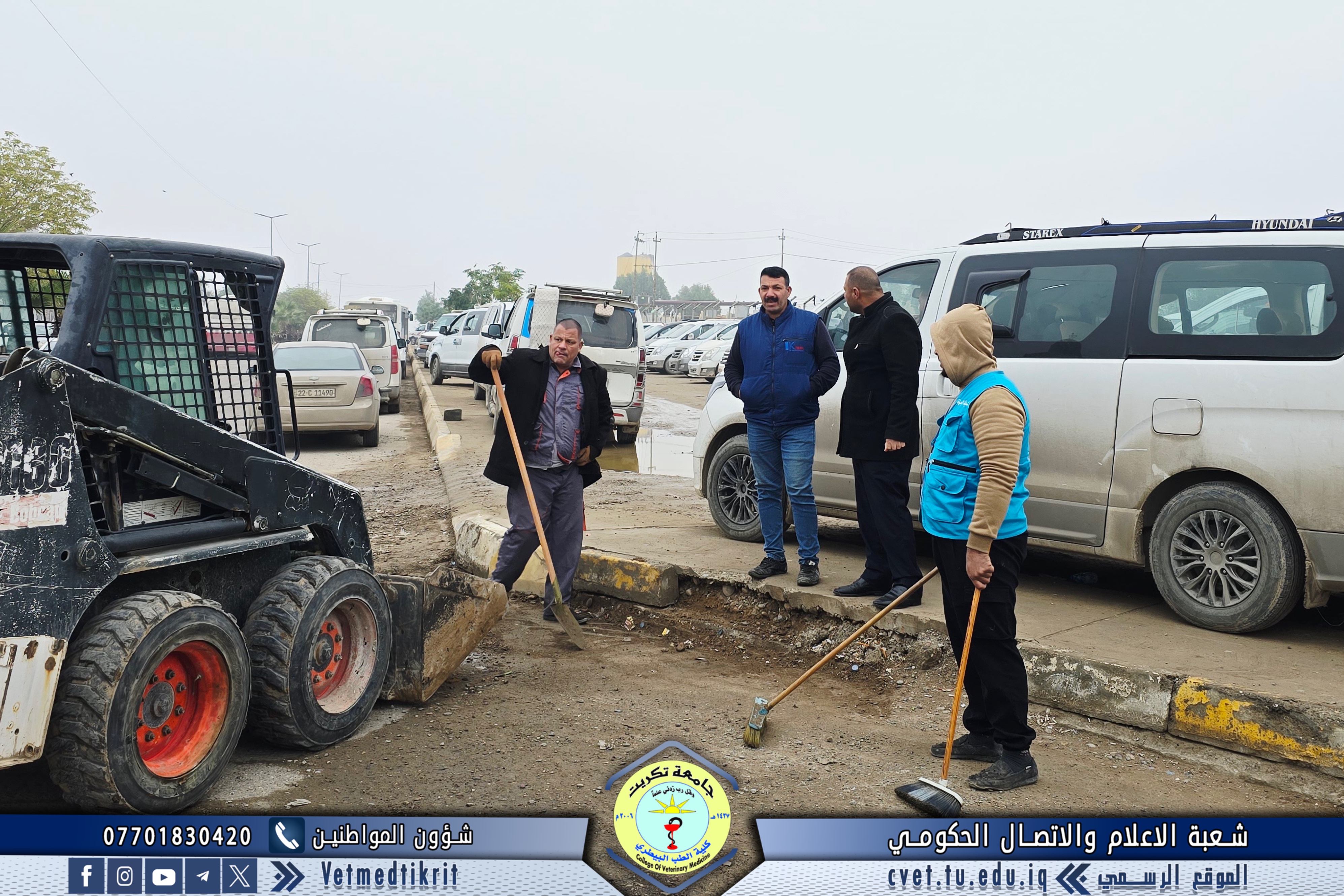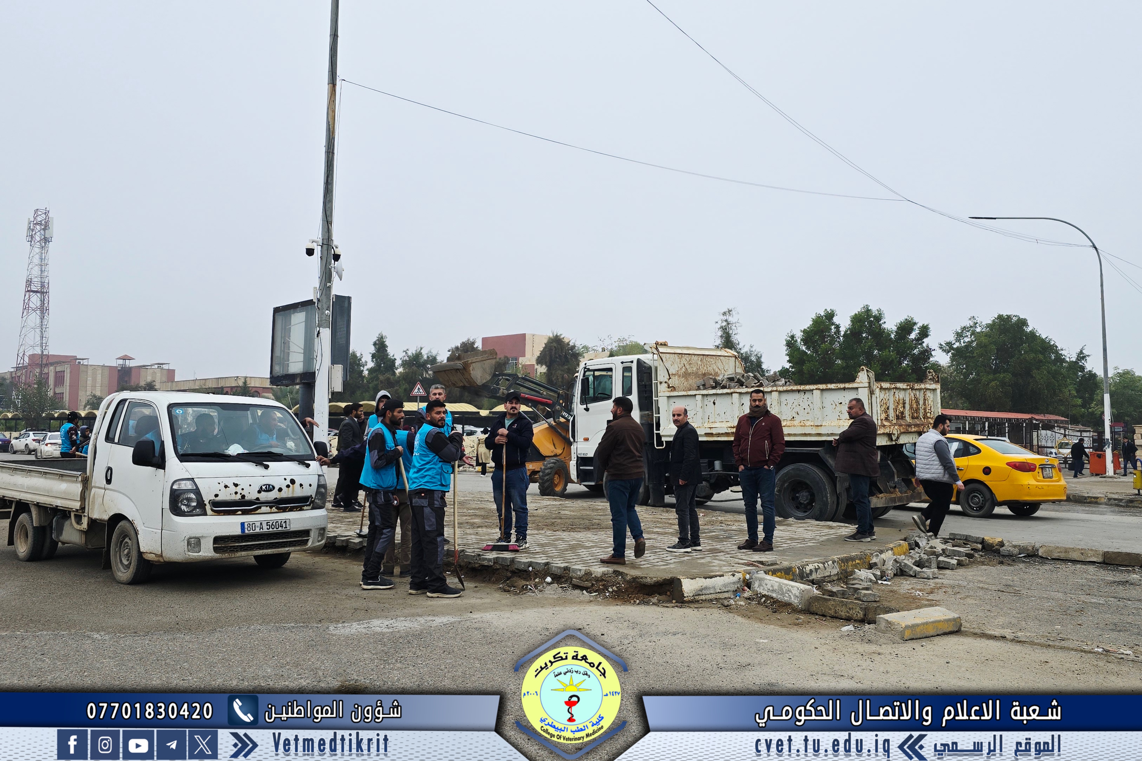 The Gardens and Services Division at the College of Veterinary Medicine, University of Tikrit, took part in a large-scale campaign to clean the main and secondary streets within the university campus. The campaign was carried out under the supervision of Professor Dr. Waed Mahmoud Raouf, President of the University of Tikrit, and Professor Dr. Hamed Mohammed Saleh, Assistant President of the University for Administrative Affairs.