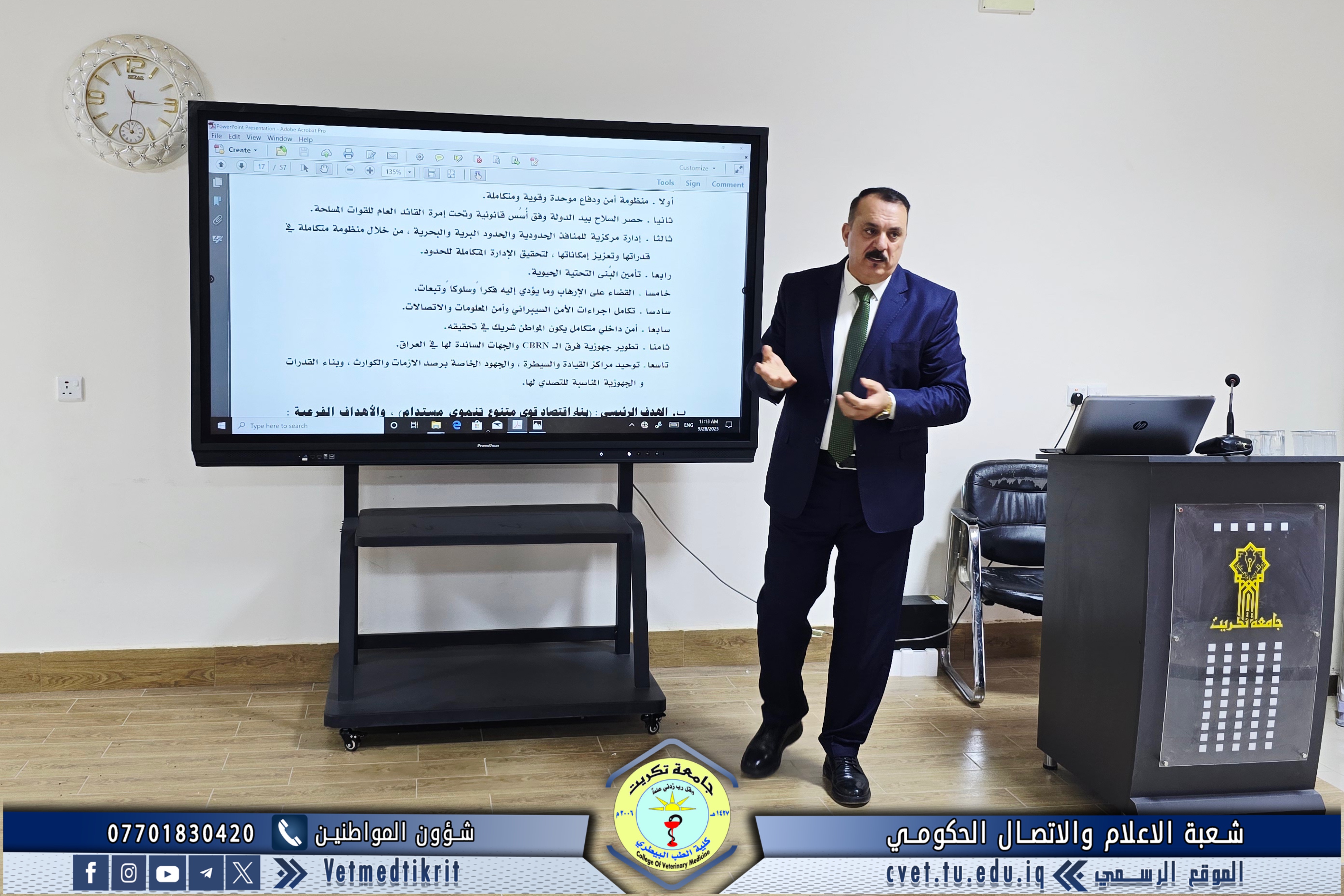 The event was attended by Prof. Dr. Bashar Sadiq Noomi, Dean of the College of Veterinary Medicine, Asst. Prof. Dr. Mohammed Raheel Ali, Dean of the College of Dentistry, and a number of faculty members and staff. The symposium was delivered by Prof. Dr. Dhafir Mudhi Faisal from the College of Law, who discussed several key themes forming the pillars of national security, including: