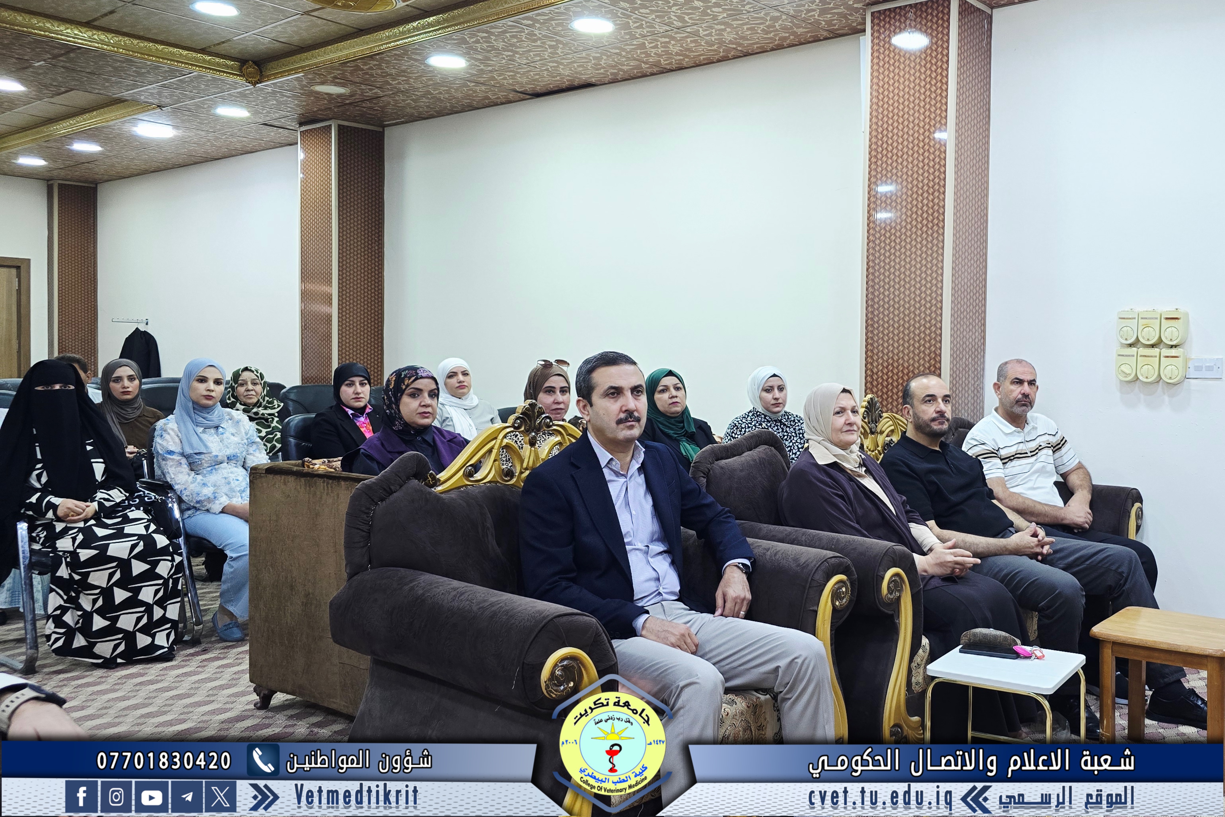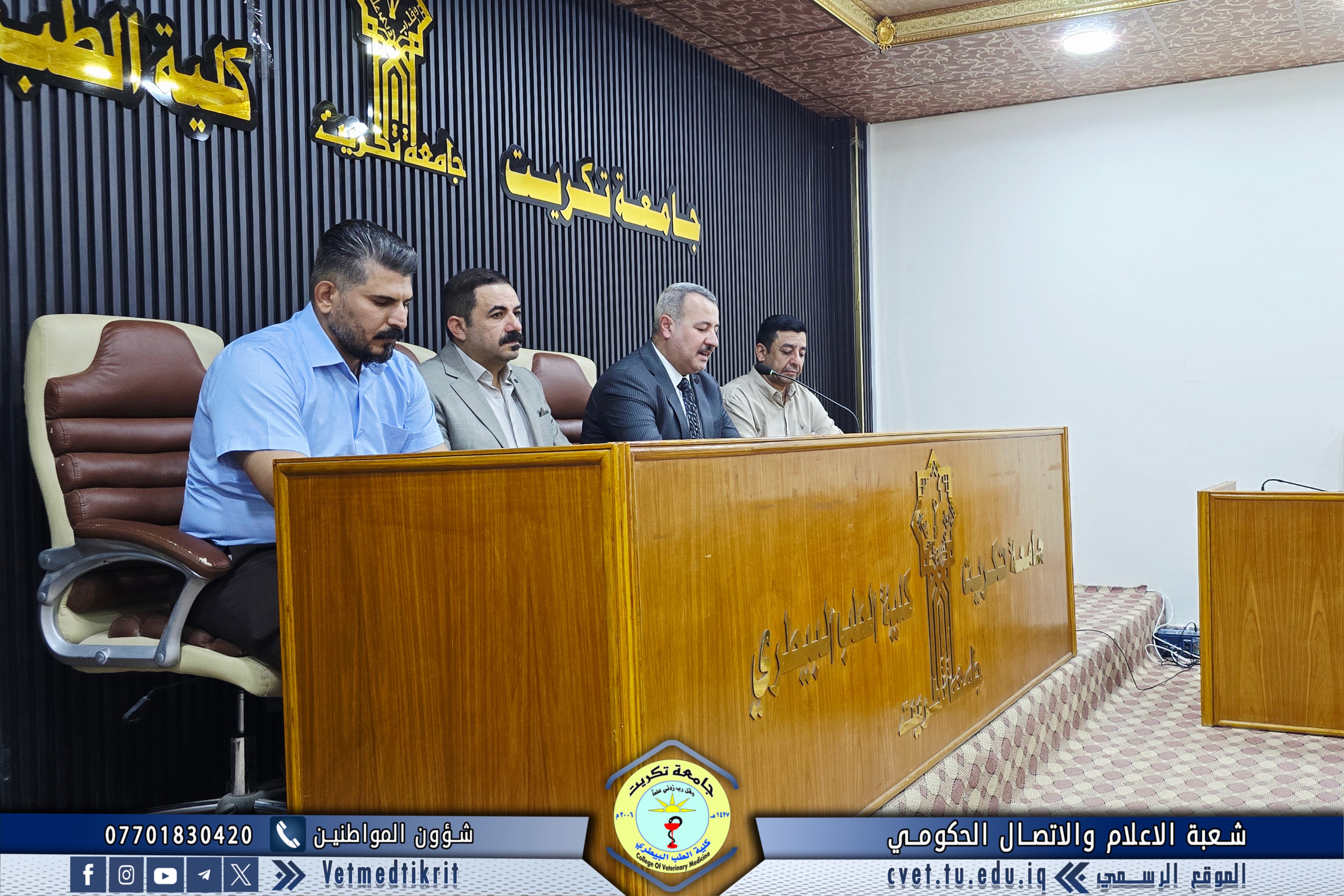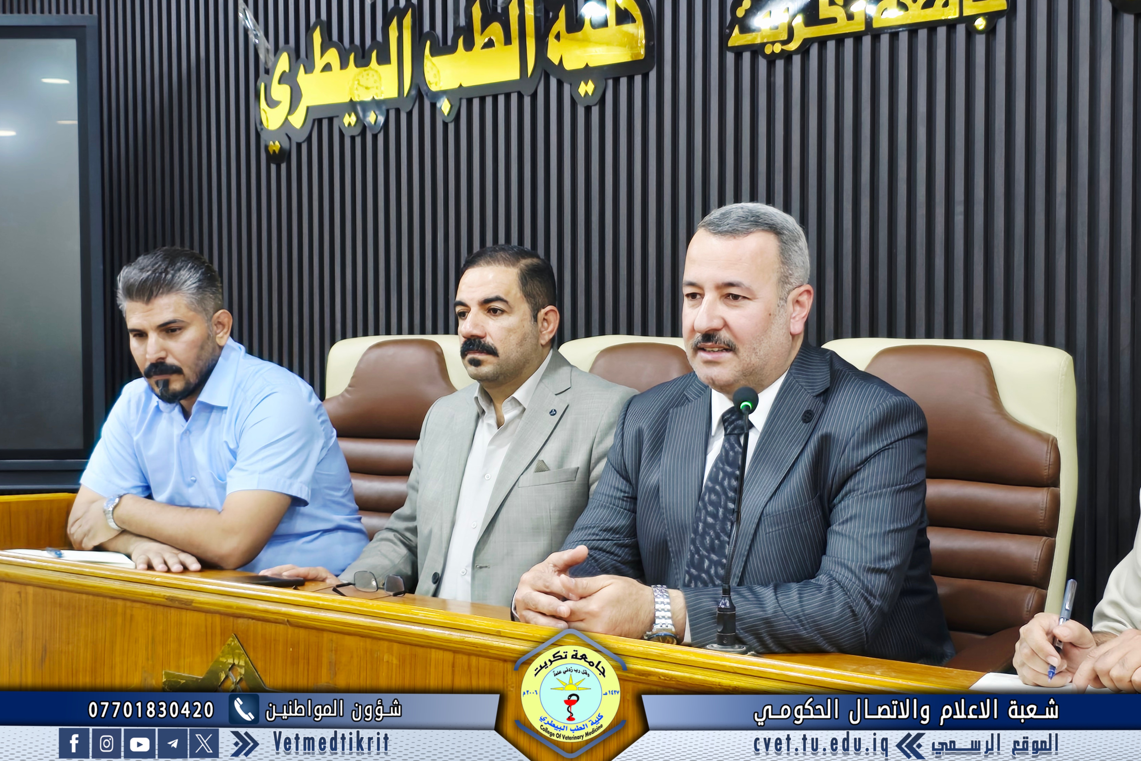 The Deanship of the College of Veterinary Medicine at Tikrit University held an expanded meeting with faculty members to mark the start of the new academic year. The meeting was attended by Professor Dr. Bashar Sadiq Noumi, Dean of the College; Assistant Professor Dr. Muntaser Muhammad Hilal, Assistant Dean for Academic Affairs; Assistant Professor Dr. Osama Hamid Shihab, Assistant Dean for Administrative Affairs; and Assistant Professor Saad Sabbar Nassif, Secretary of the College Council. The Dean began the meeting with a speech welcoming the faculty, wishing them a successful and productive academic year. He emphasized the importance of cooperation and teamwork to advance the college's academic and scientific level. The meeting addressed several important topics, most notably: dividing lectures to achieve a balance between theoretical and practical requirements; emphasizing the importance of enhancing the practical and applied aspects of lectures to provide students with the necessary experience and skills; discussing mechanisms for implementing institutional accreditation standards and ensuring the quality of education; and examining some administrative and organizational aspects related to the progress of the educational process. At the conclusion of the meeting, the Dean emphasized the need to redouble efforts to achieve a distinguished academic year that contributes to providing society with solid scientific competencies capable of serving the veterinary medicine sector.