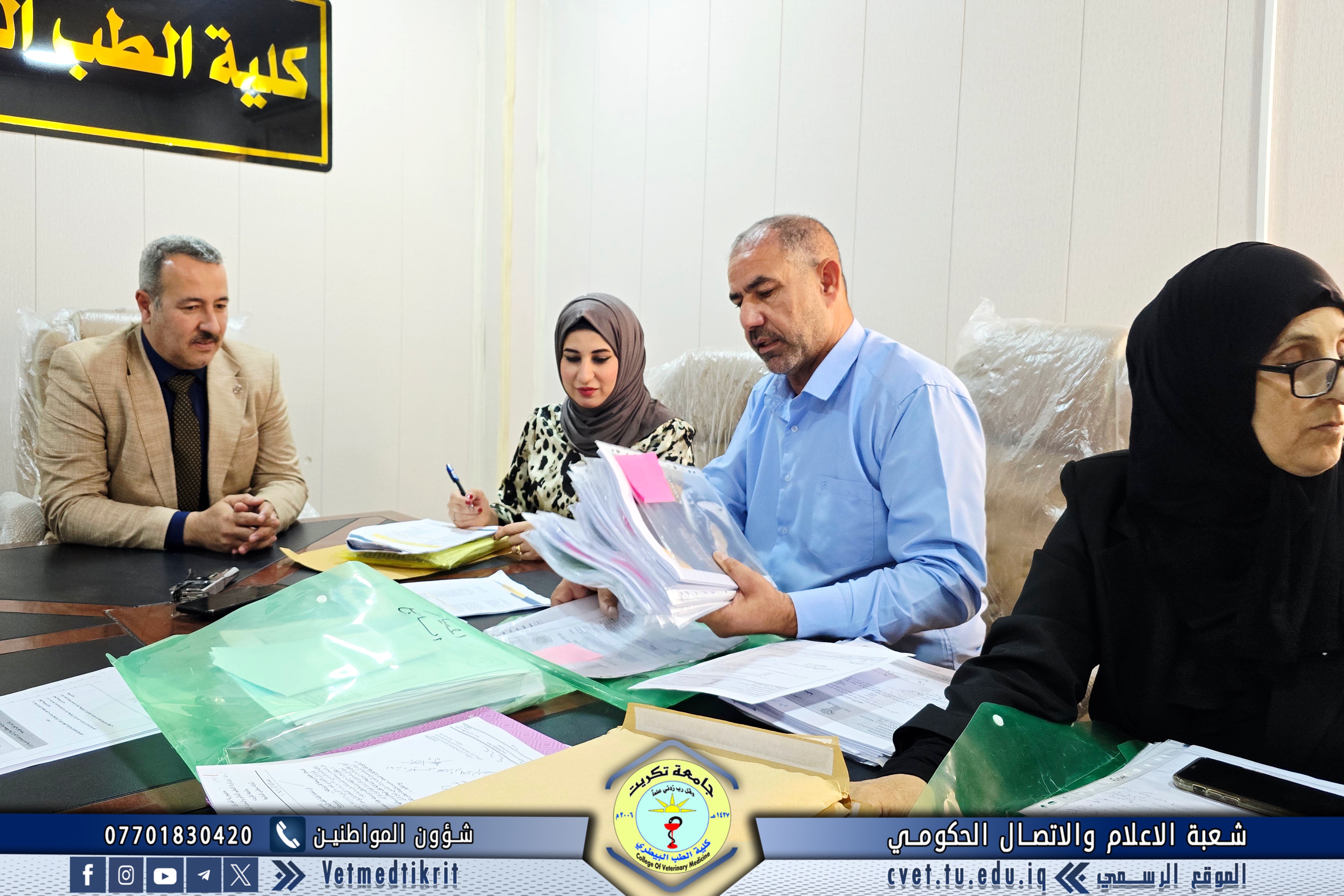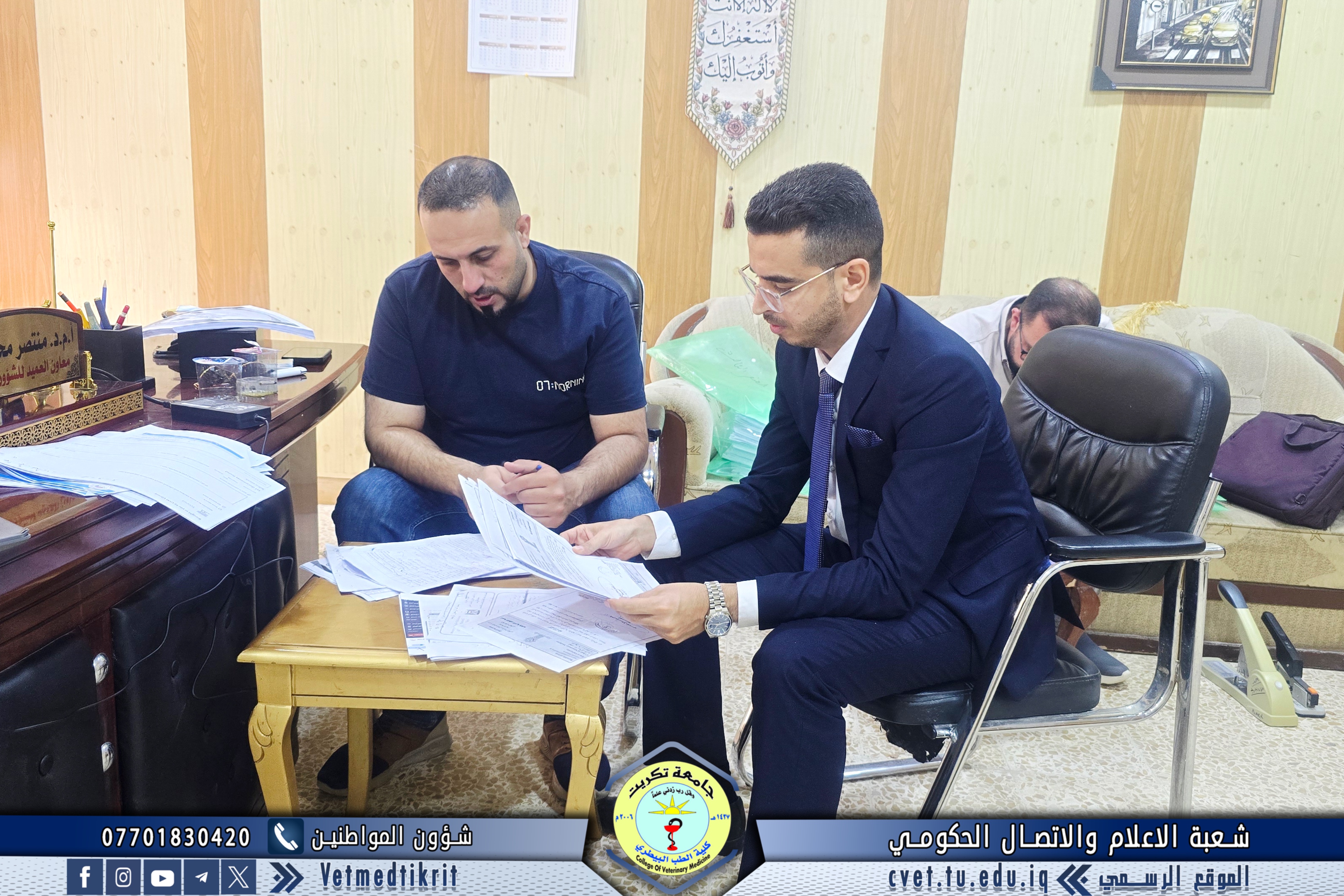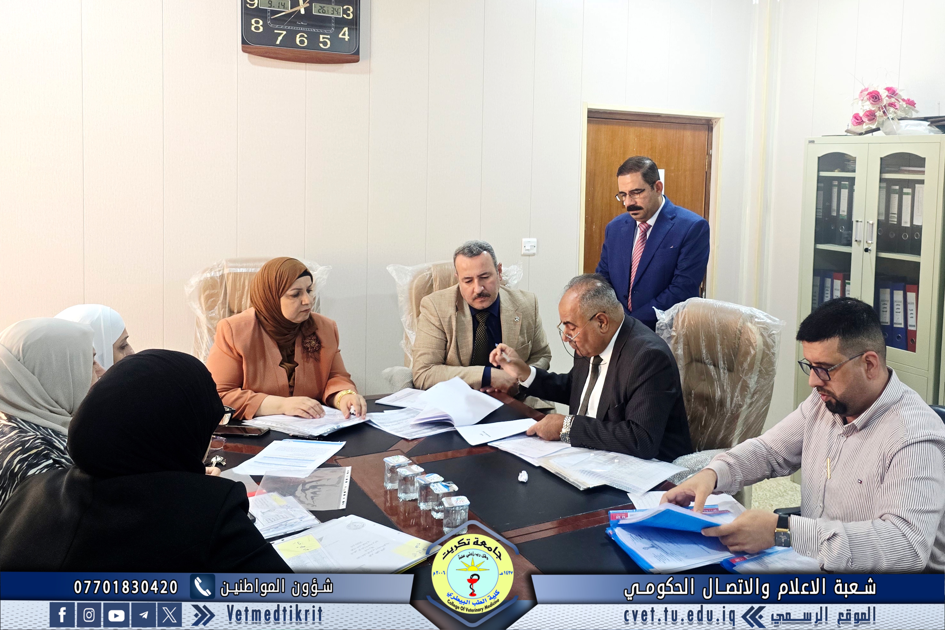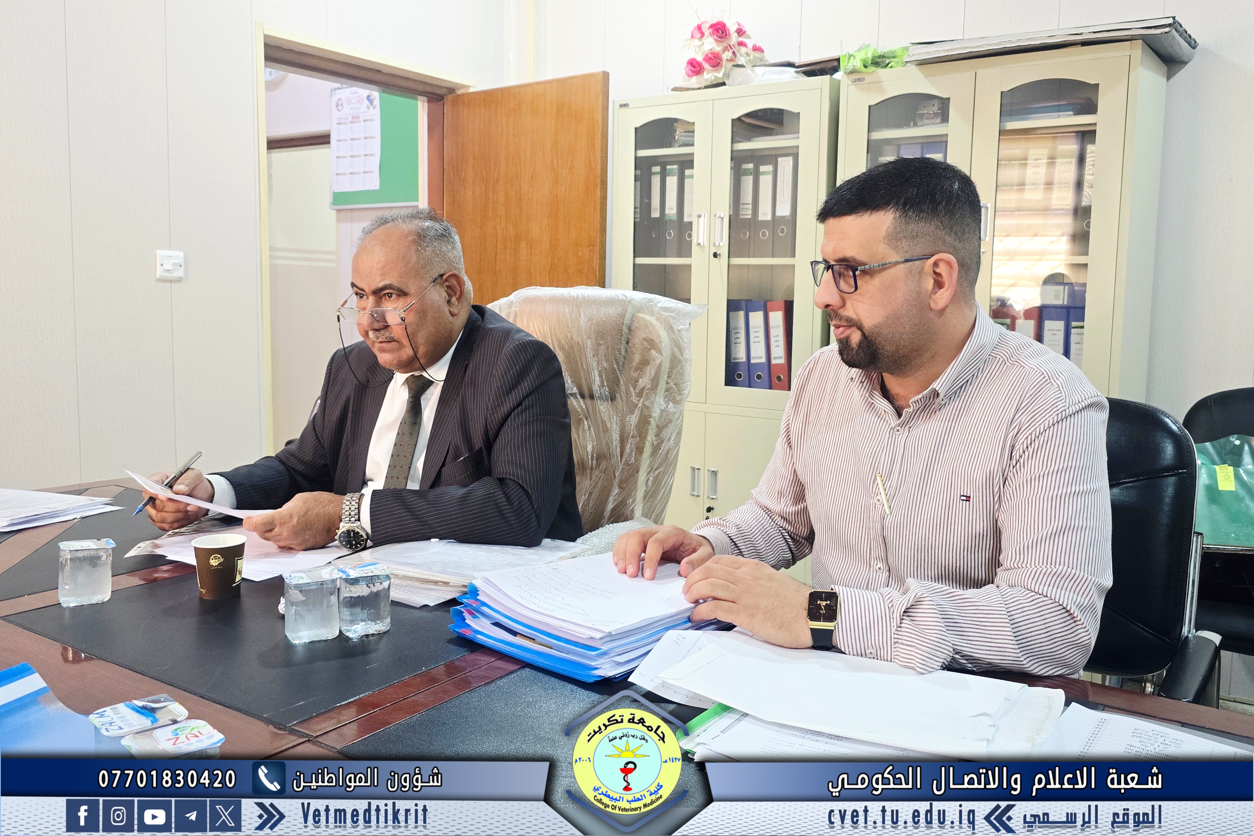 The Institutional Accreditation Standards Supervisory Committee at Tikrit University visited the College of Veterinary Medicine for the second time. They were received by Professor Dr. Bashar Sadiq Noumi, Dean of the College, and Assistant Professor Muntaser Mohammed Hilal, Assistant Dean for Academic Affairs. During the visit, the committee reviewed the evidence and documentation prepared by the committees formed at the college for this purpose. They expressed their admiration for the outstanding level of organization and meticulous work, appreciating the great efforts made by the college's deanship and all committees to move confidently towards implementing institutional accreditation standards. The College of Veterinary Medicine affirms its continued commitment to achieving academic excellence and enhancing its academic standing, in line with quality and institutional accreditation requirements, placing it among the leading colleges at the national and international levels.