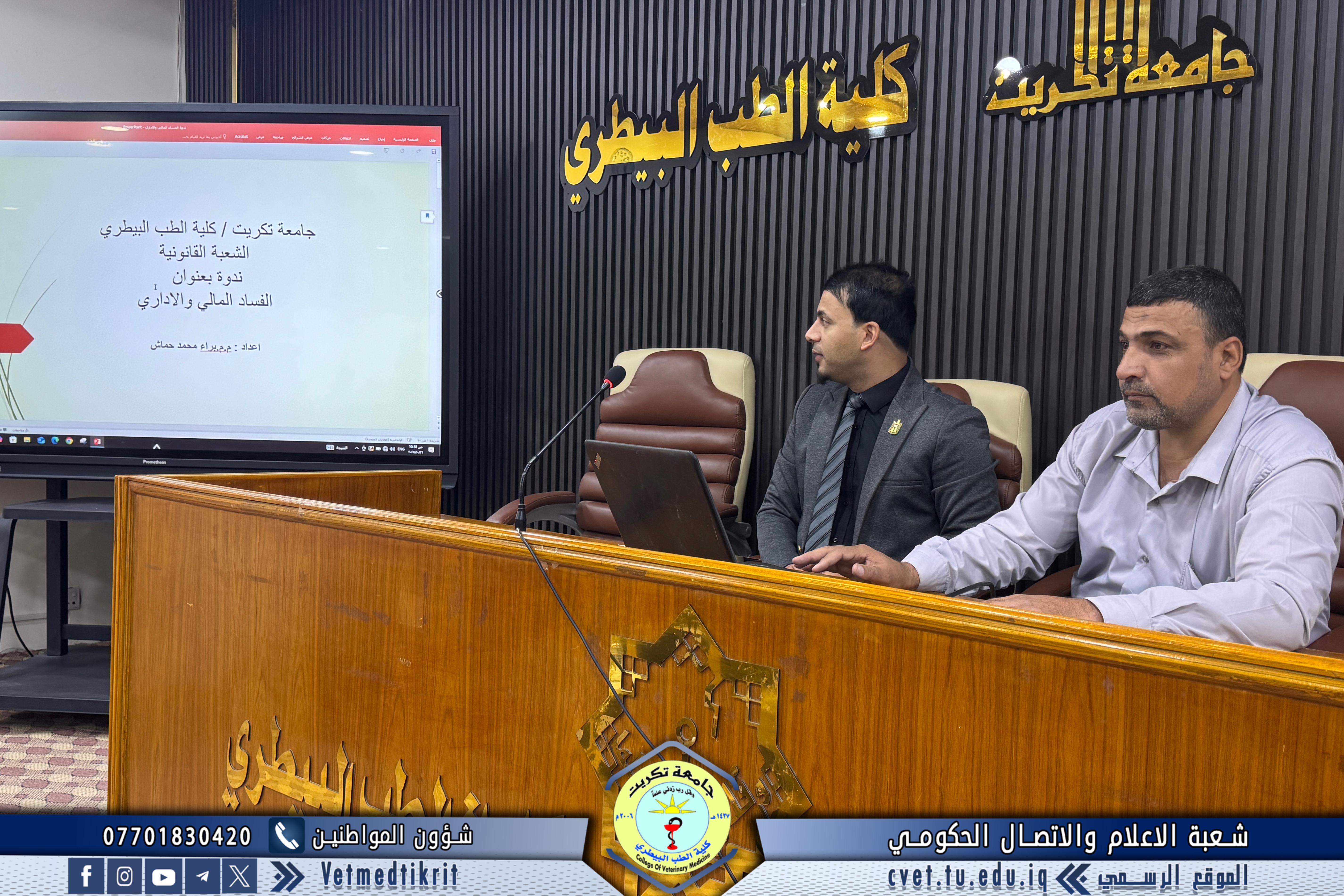 As part of its educational and awareness activities, the College of Veterinary Medicine at the University of Tikrit held a seminar titled “Financial and Administrative Corruption”, presented by Assistant Lecturer Baraa Mohammed Hamash and Mr. Ammar Abdul Kareem Araibi, with the attendance of several faculty and administrative staff members.