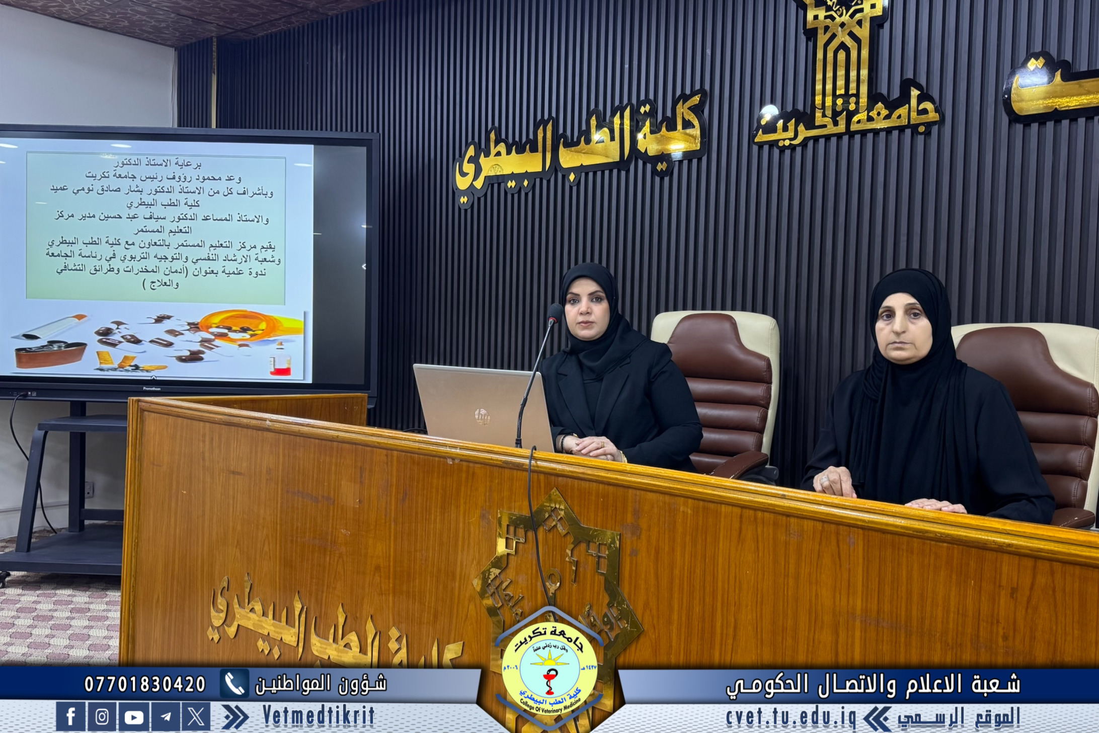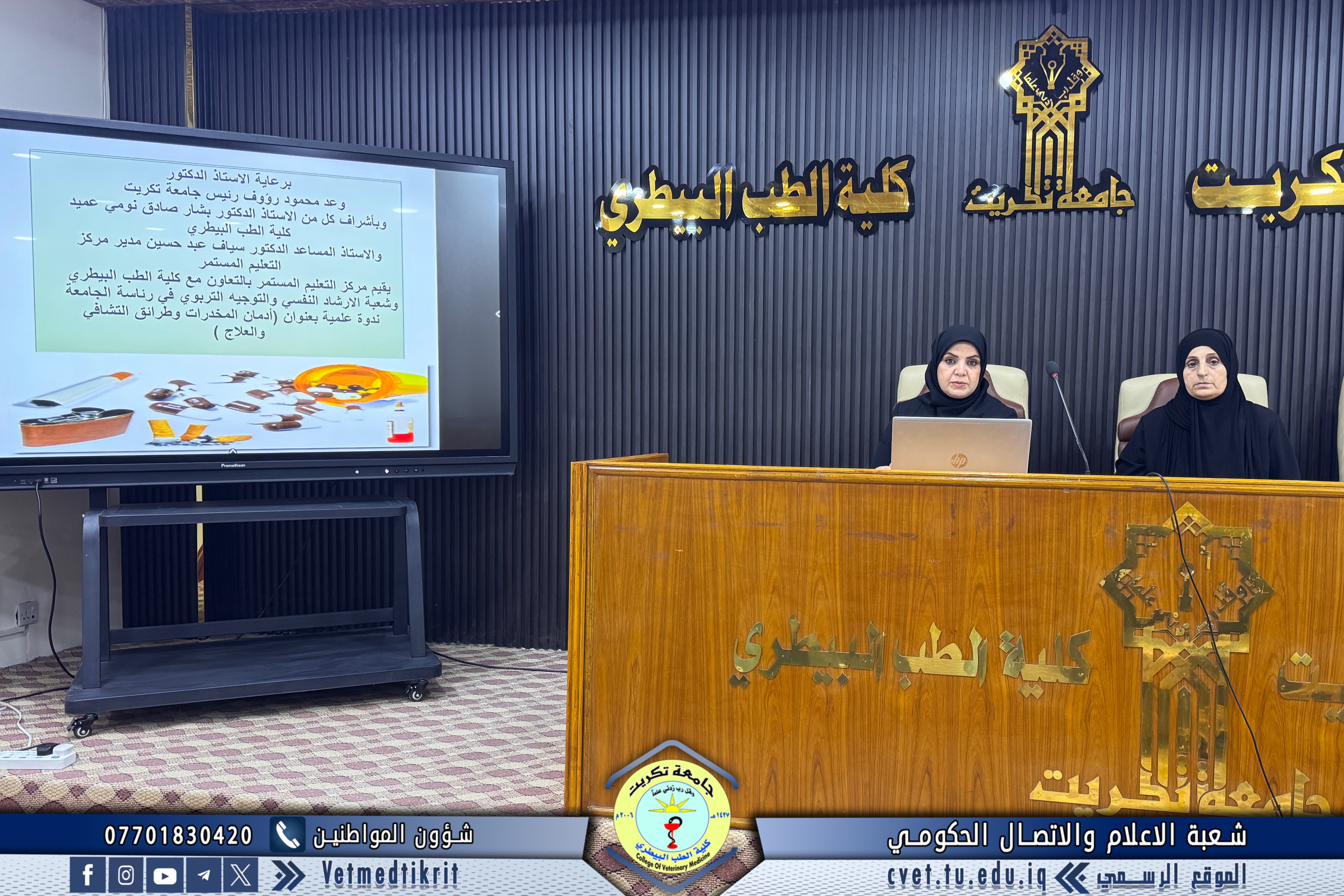 Under the patronage of the Dean of the College of Veterinary Medicine, University of Tikrit, and in cooperation with the Center for Continuing Education, the college organized an educational seminar titled “Drug Addiction and Methods of Recovery.”