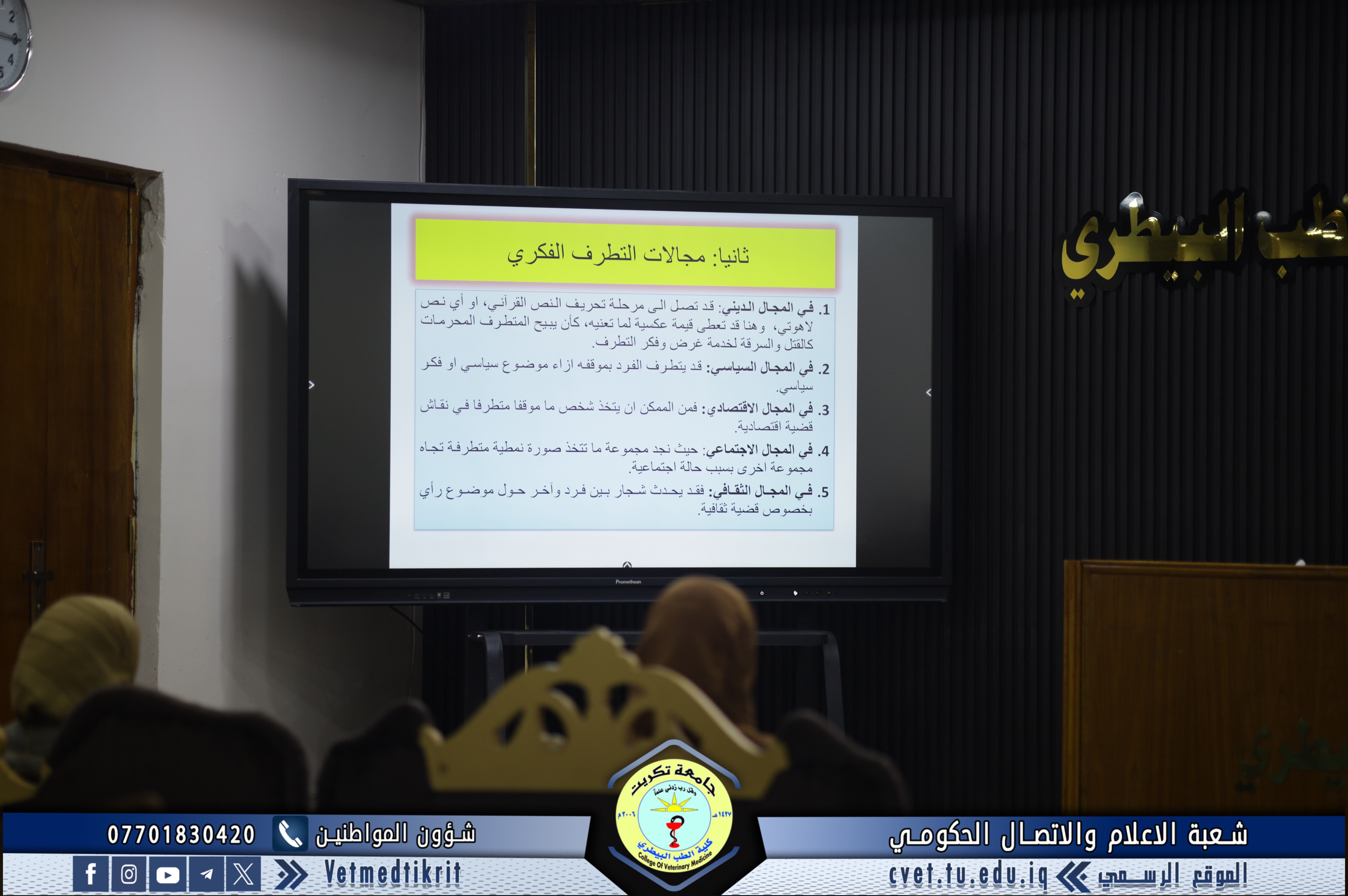 Under the patronage of the Dean of the College of Veterinary Medicine at the University of Tikrit, the Psychological Counseling and Educational Guidance Unit, in cooperation with the Department of Media in the College of Arts and the Center for Continuing Education, organized an awareness seminar entitled “Media and Confronting Intellectual Extremism.”