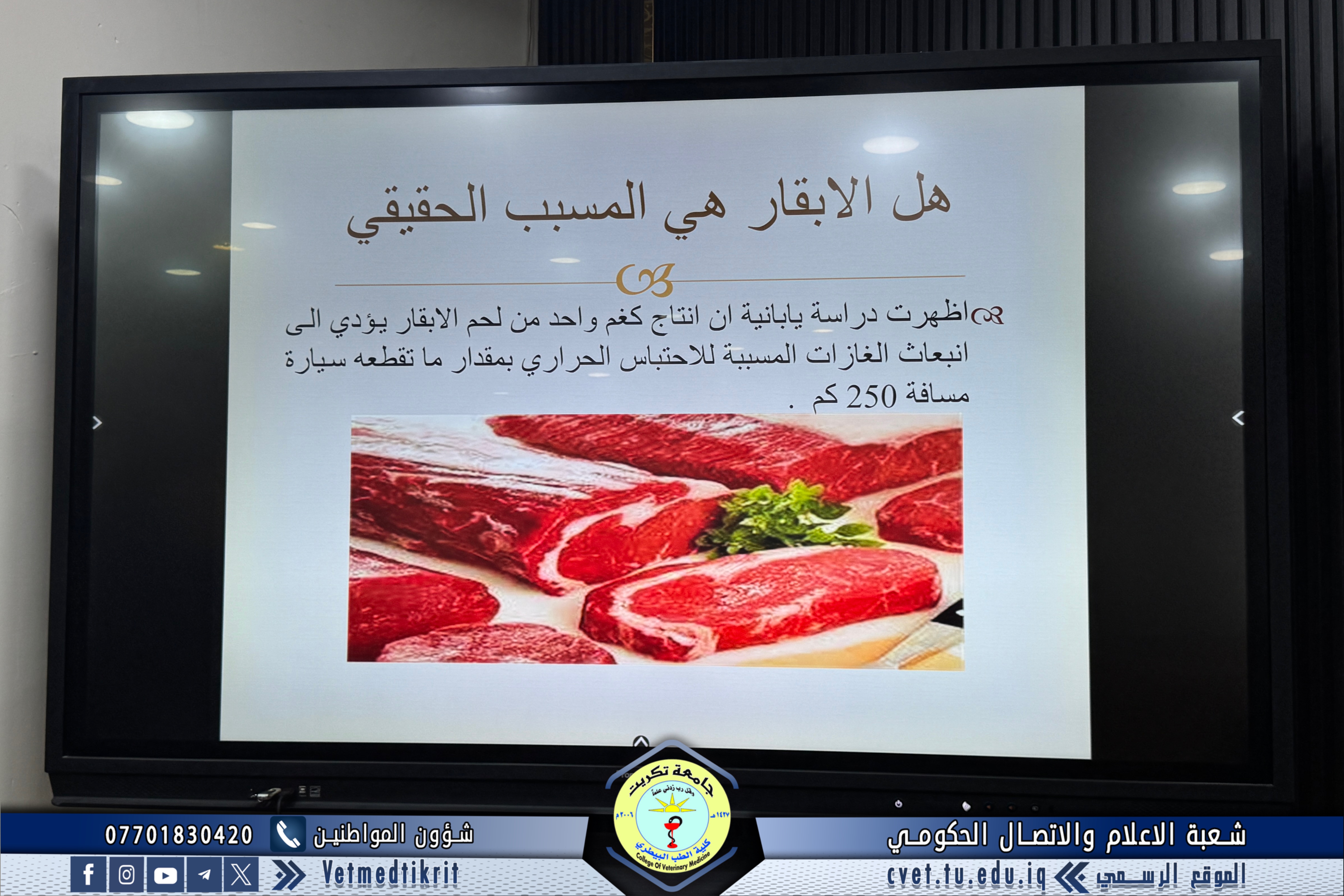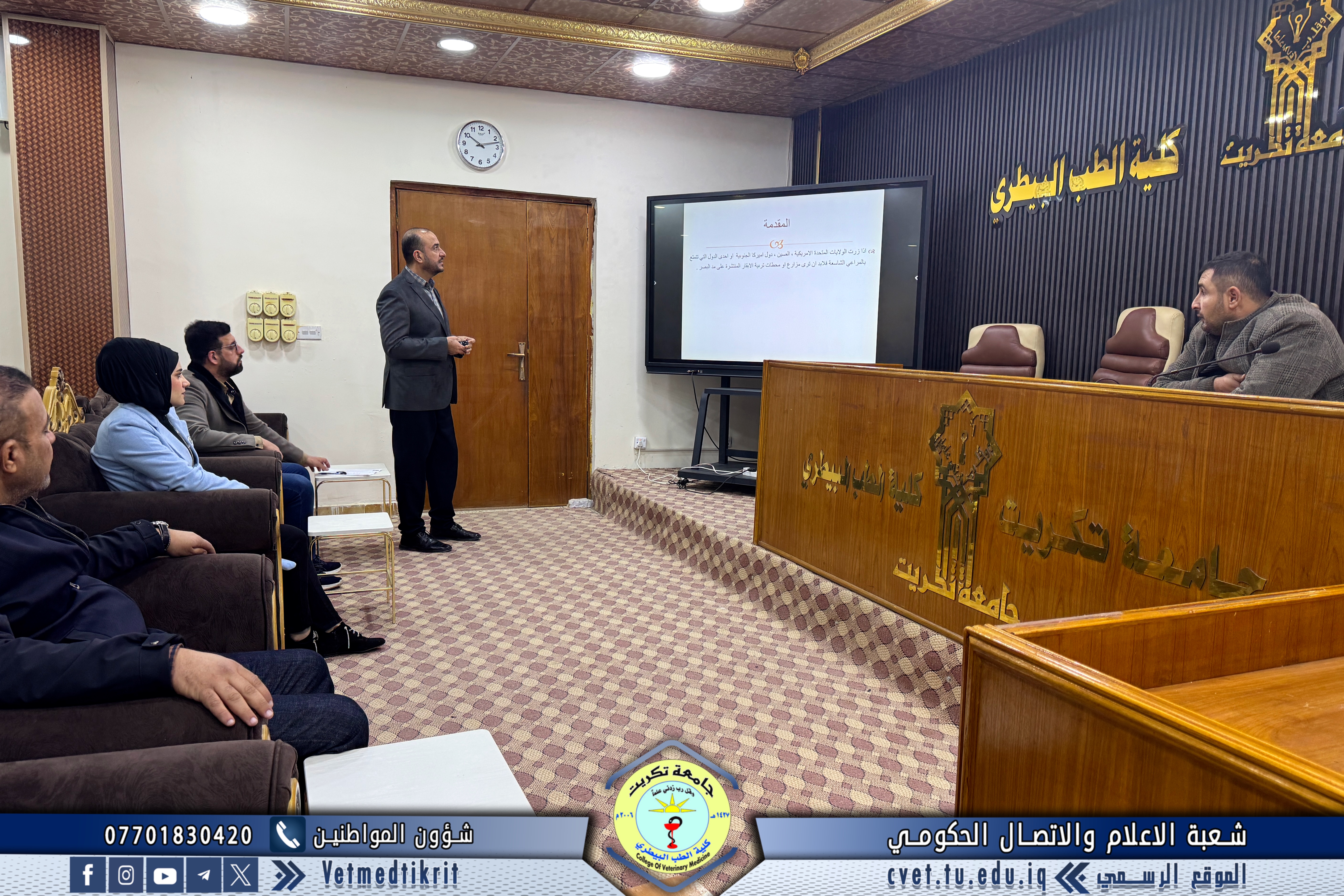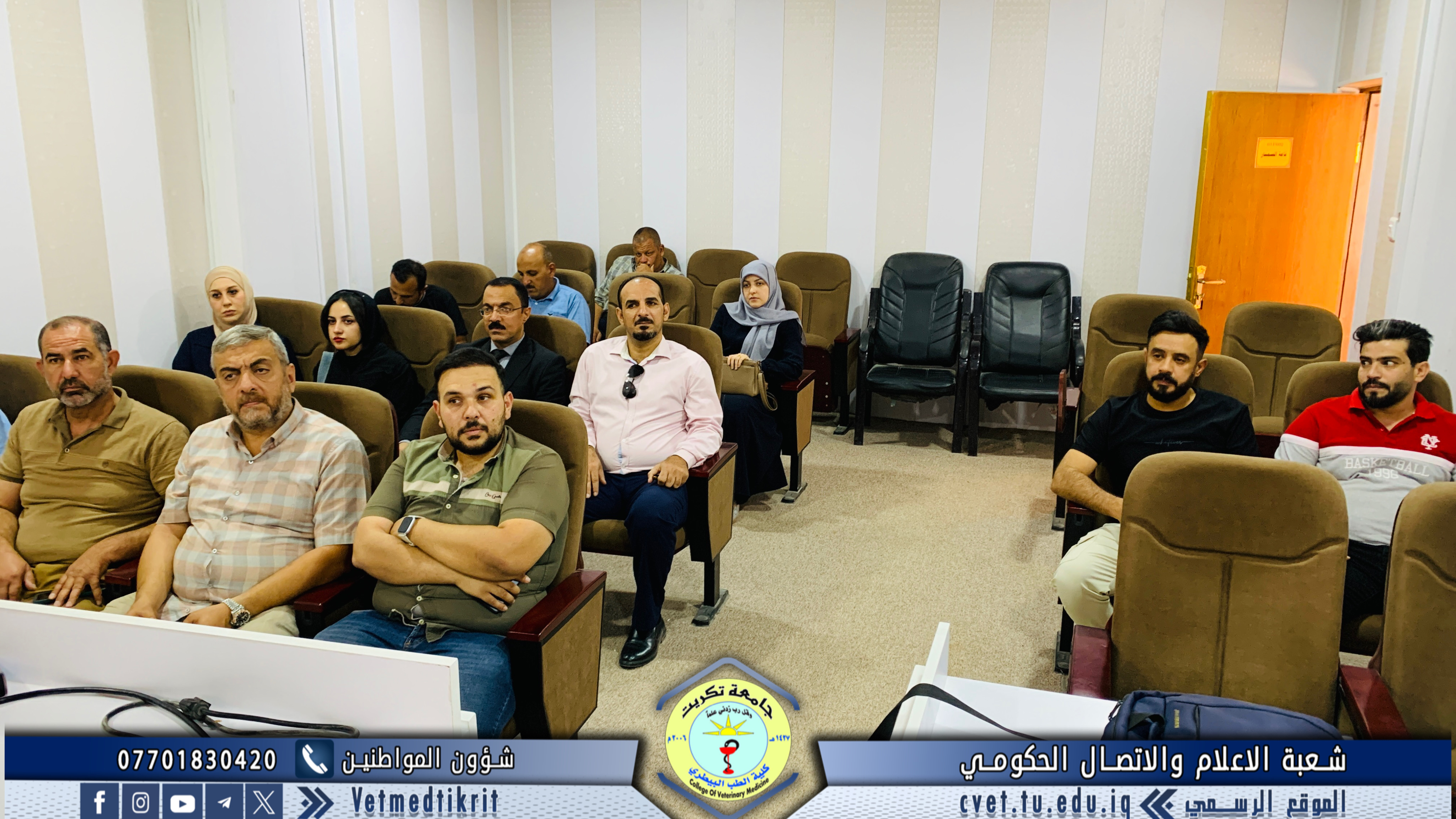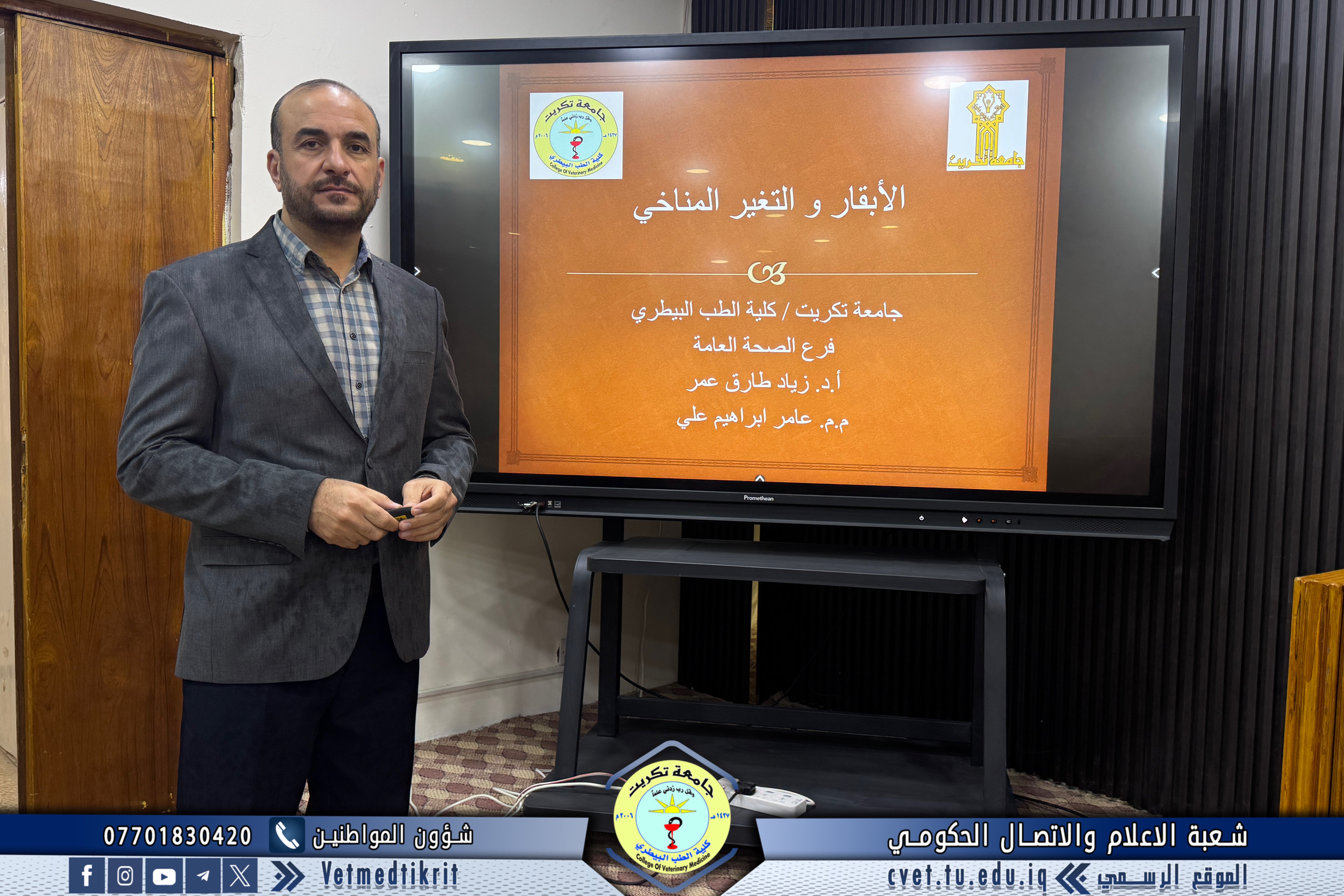 The College of Veterinary Medicine at the University of Tikrit, in cooperation with the Continuing Education Center, held a scientific seminar titled “Cows and Climate Change.” The seminar was delivered by Prof. Dr. Ziyad Tareq Omar and Assistant Lecturer Amer Ibrahim Ali.