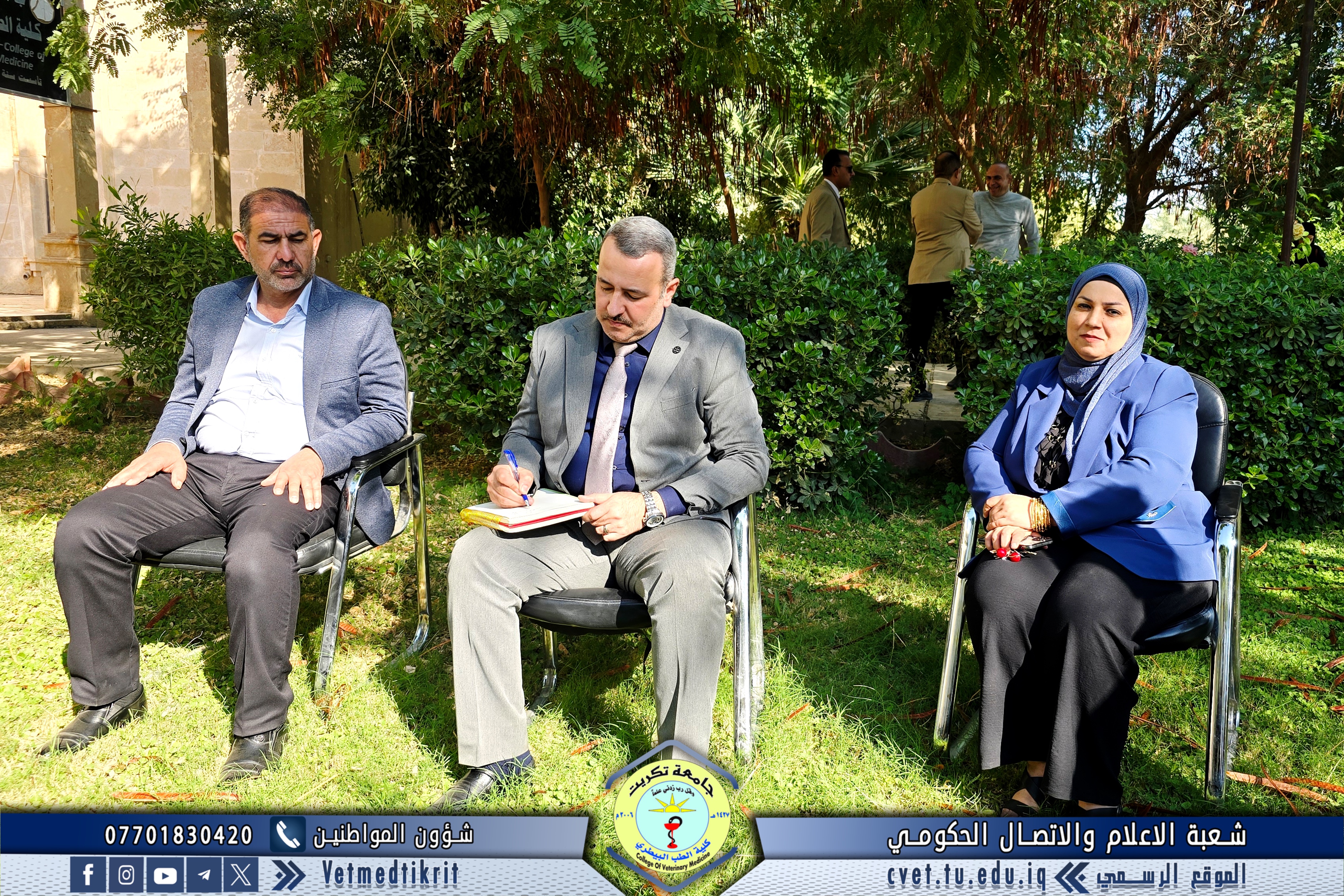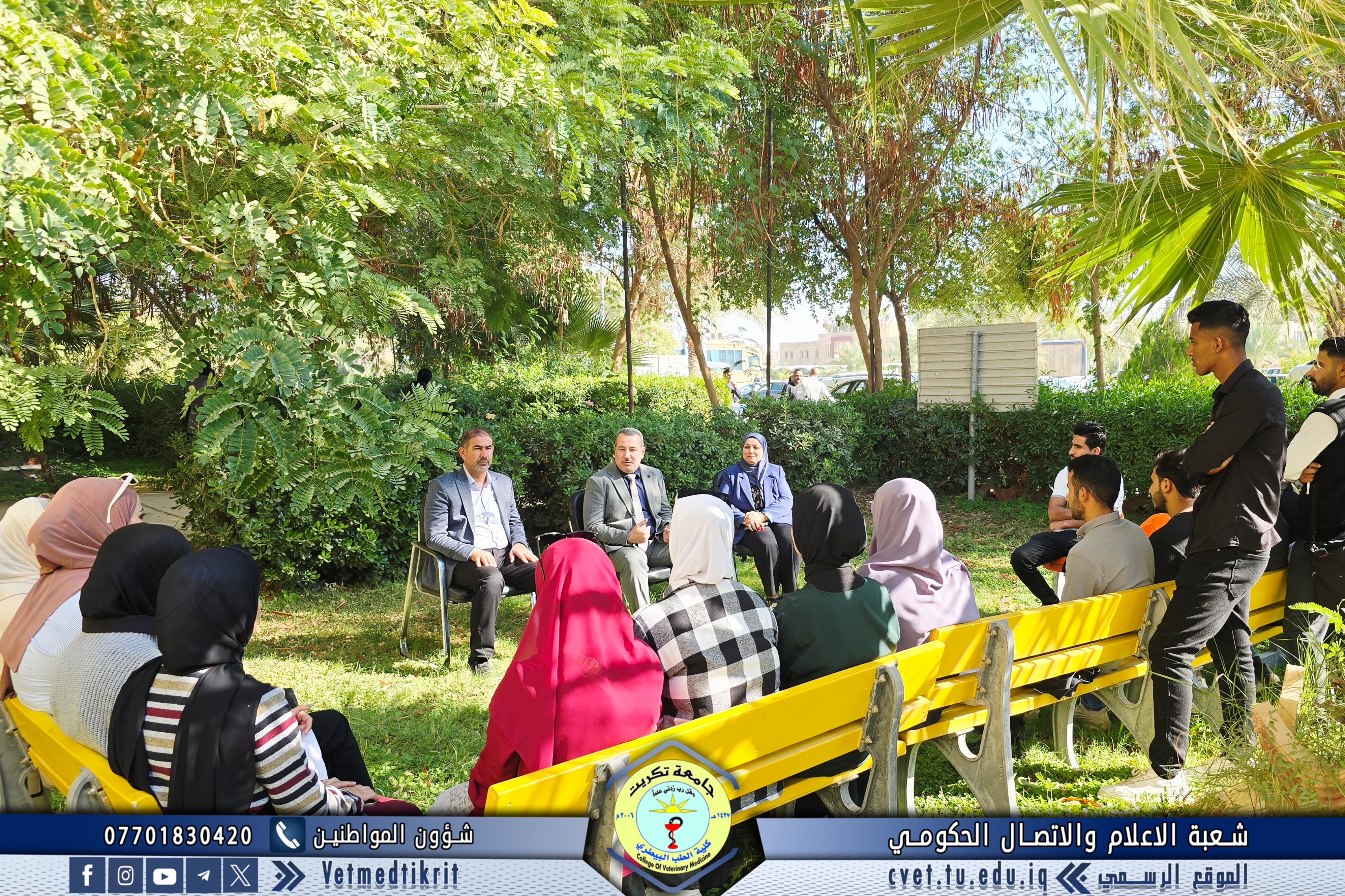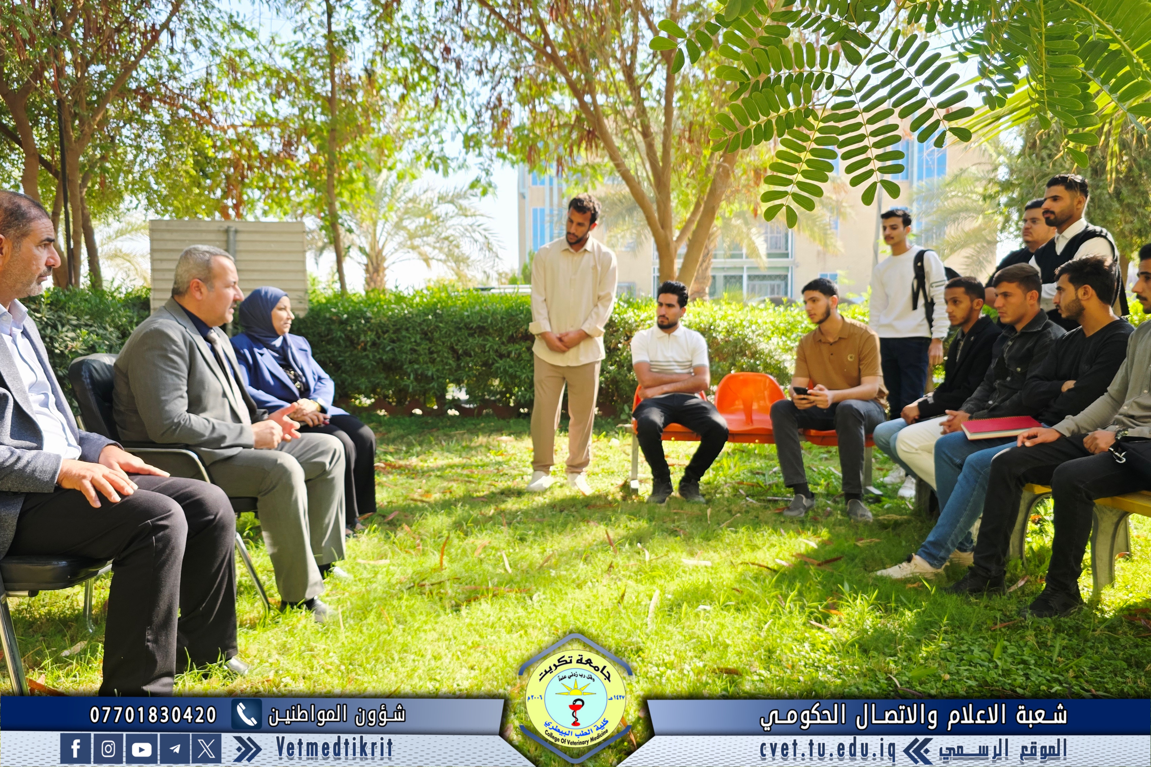 The meeting was held in the college gardens in a friendly atmosphere full of dialogue and interaction. The Dean began his speech by welcoming the students, wishing them a successful academic year, and emphasizing the importance of diligence, commitment, and adhering to proper university conduct that reflects the spirit of a College of Veterinary Medicine student.