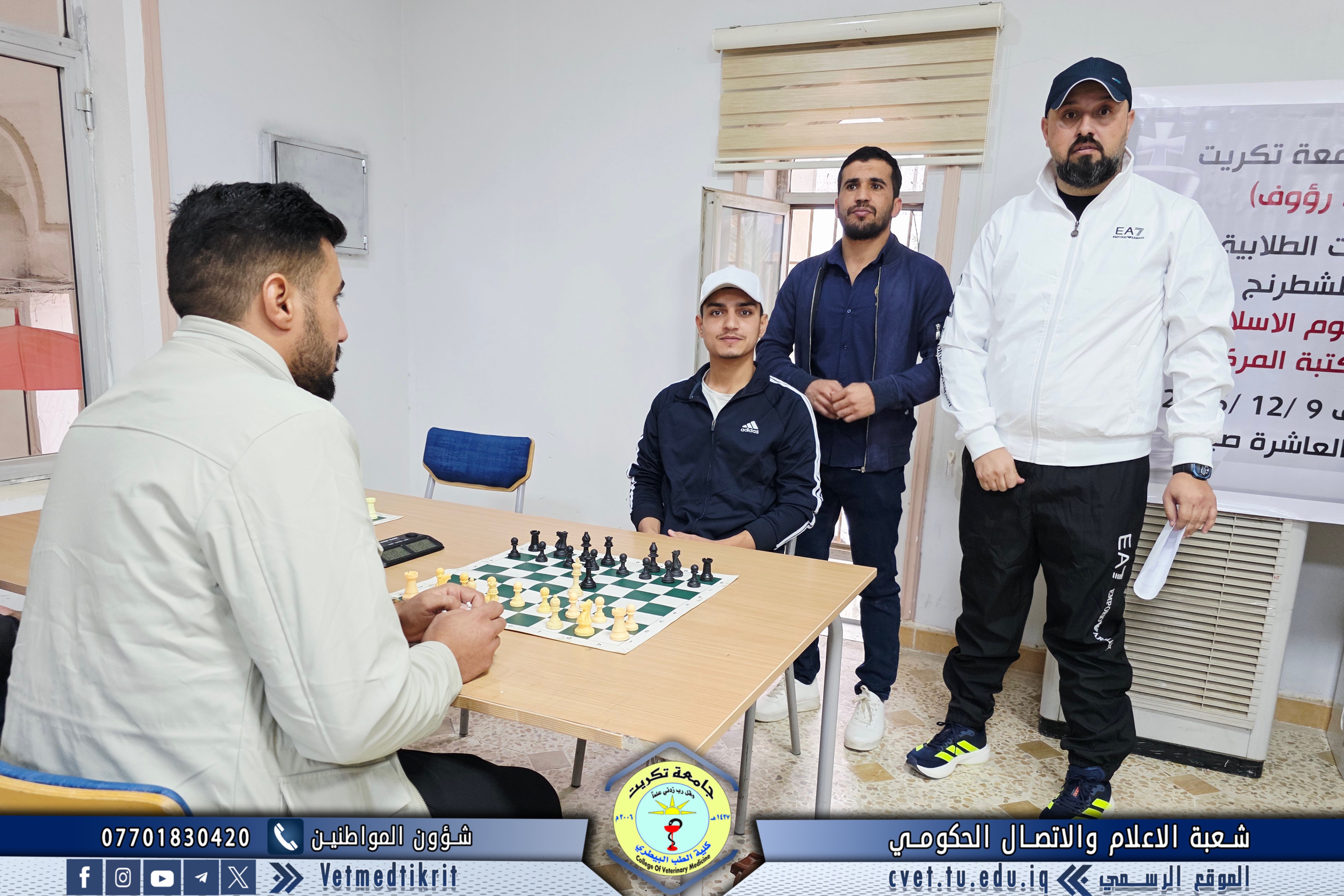 The College of Veterinary Medicine participated in the University of Tikrit Chess Championship, hosted by the College of Islamic Sciences and the General Secretariat of the Central Library. This participation comes as part of the College’s extracurricular activities and its commitment to supporting students across various academic, cultural, and athletic fields.