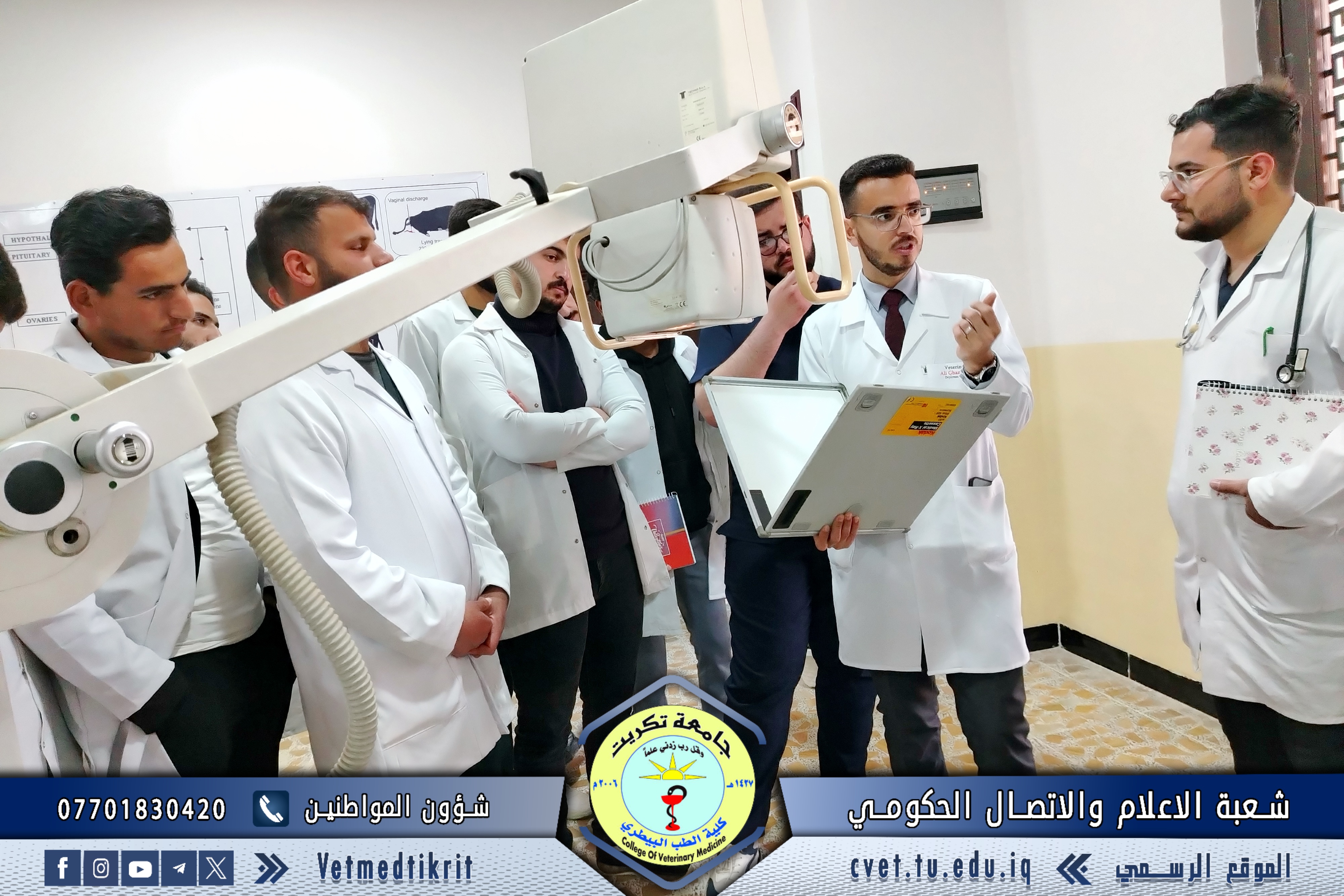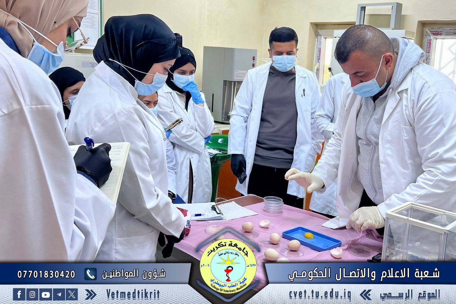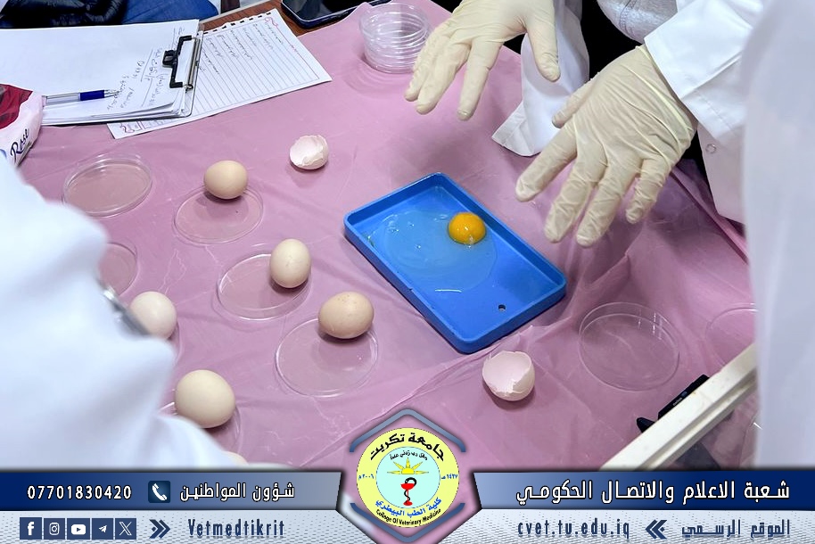 The College of Veterinary Medicine at the University of Tikrit organized a practical lecture for first-year students entitled “Egg Examination and Grading”, delivered by Dr. Omar Issam and Dr. Ali Qais, as part of the practical courses designed to enhance students’ applied understanding within the Poultry Management curriculum.