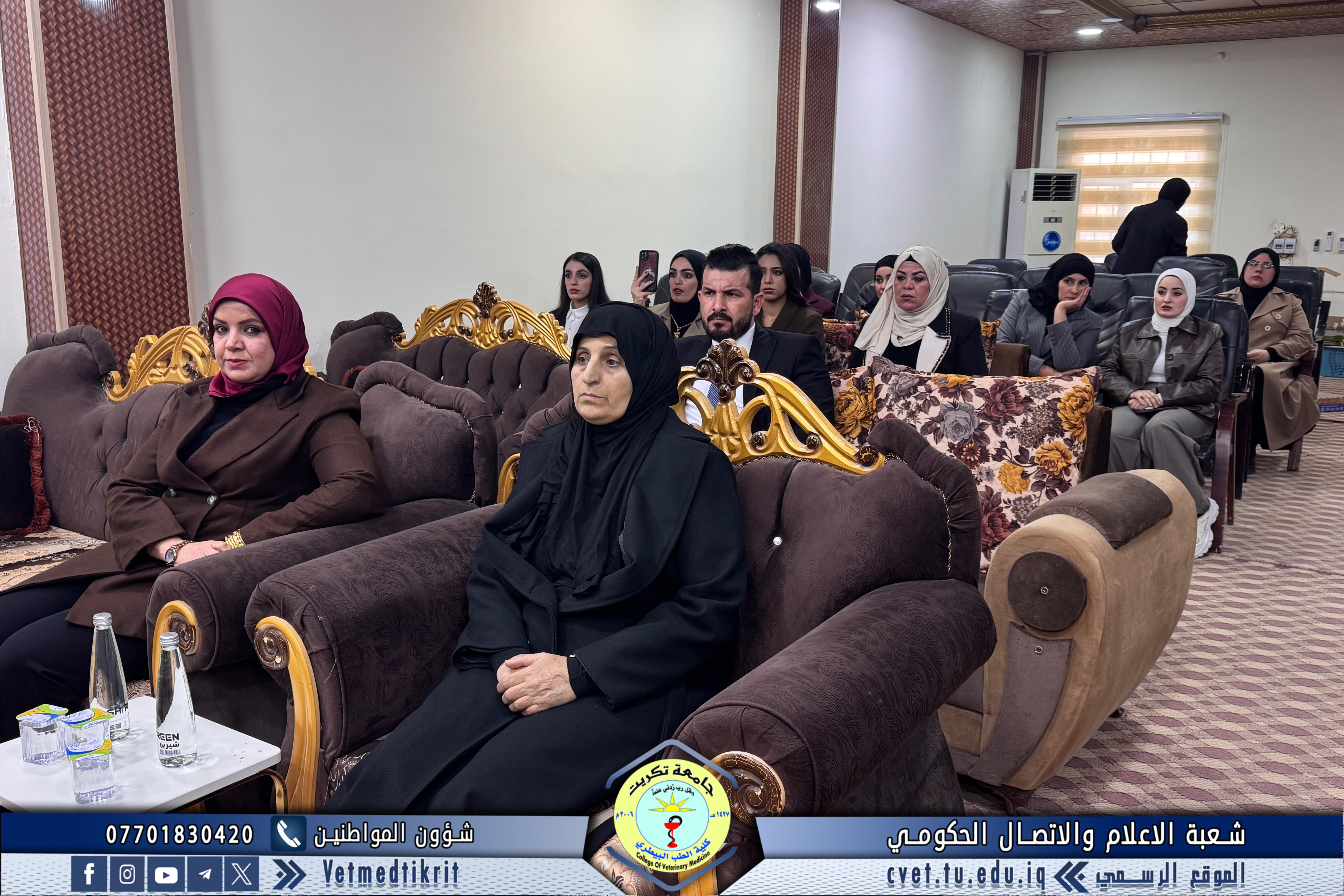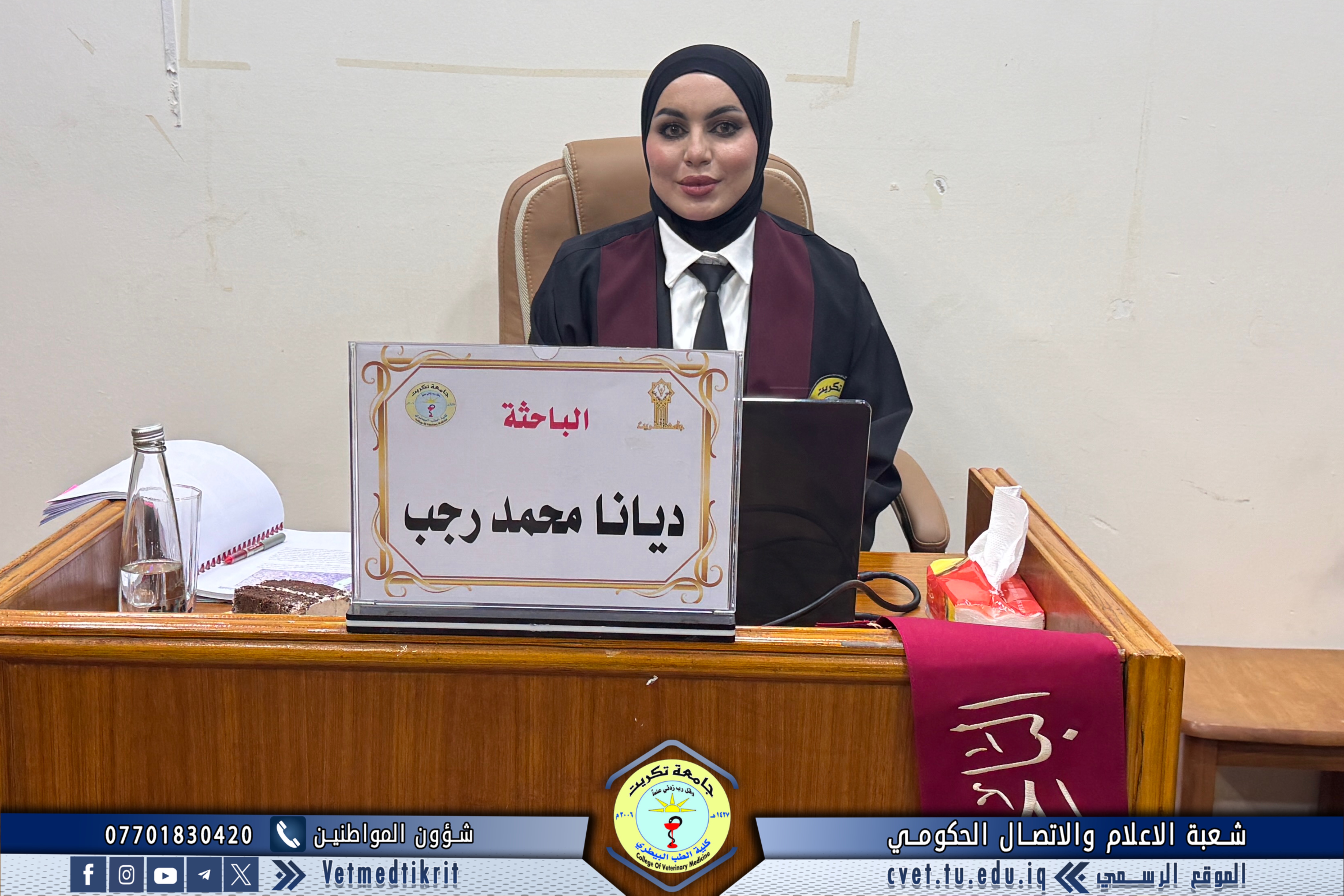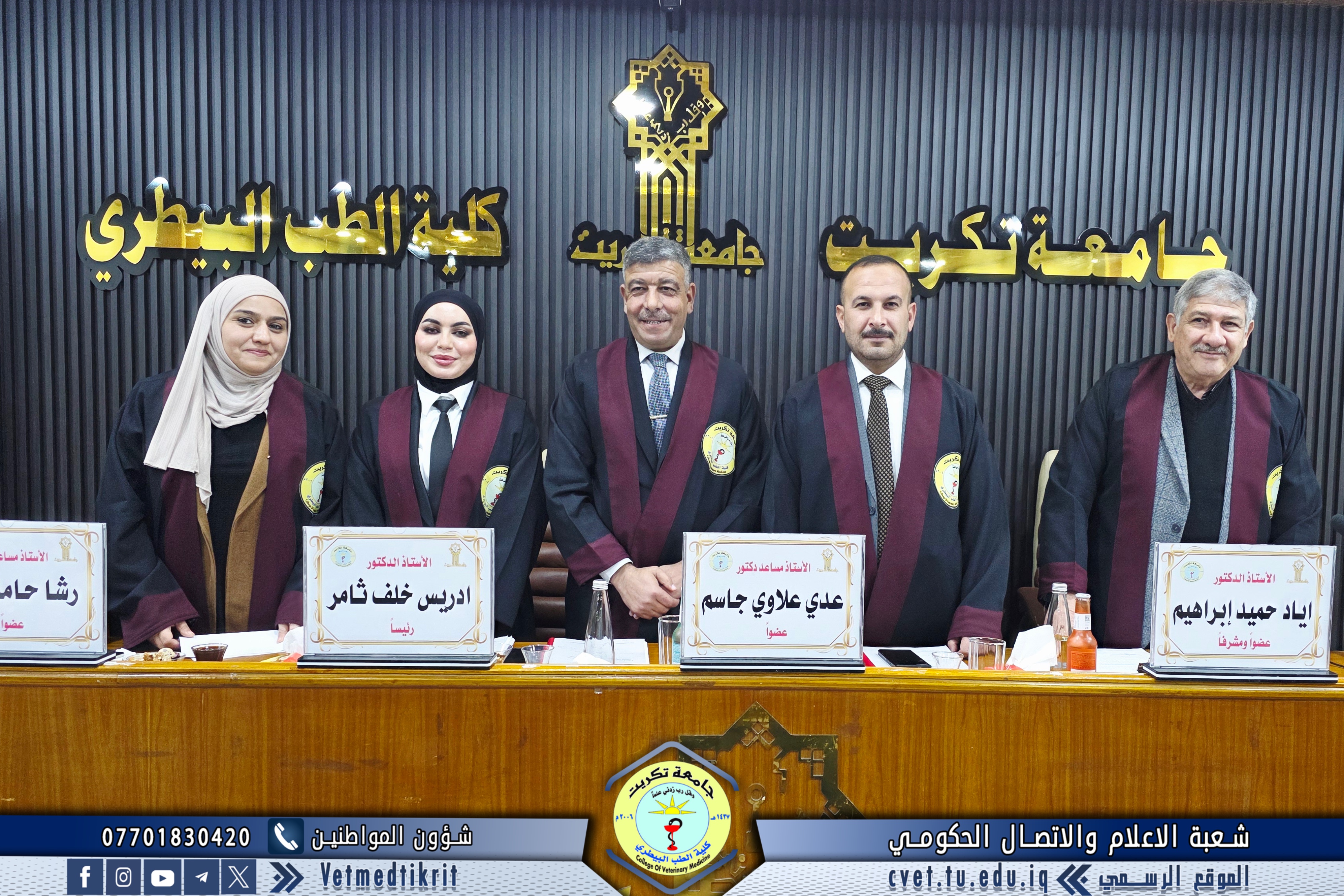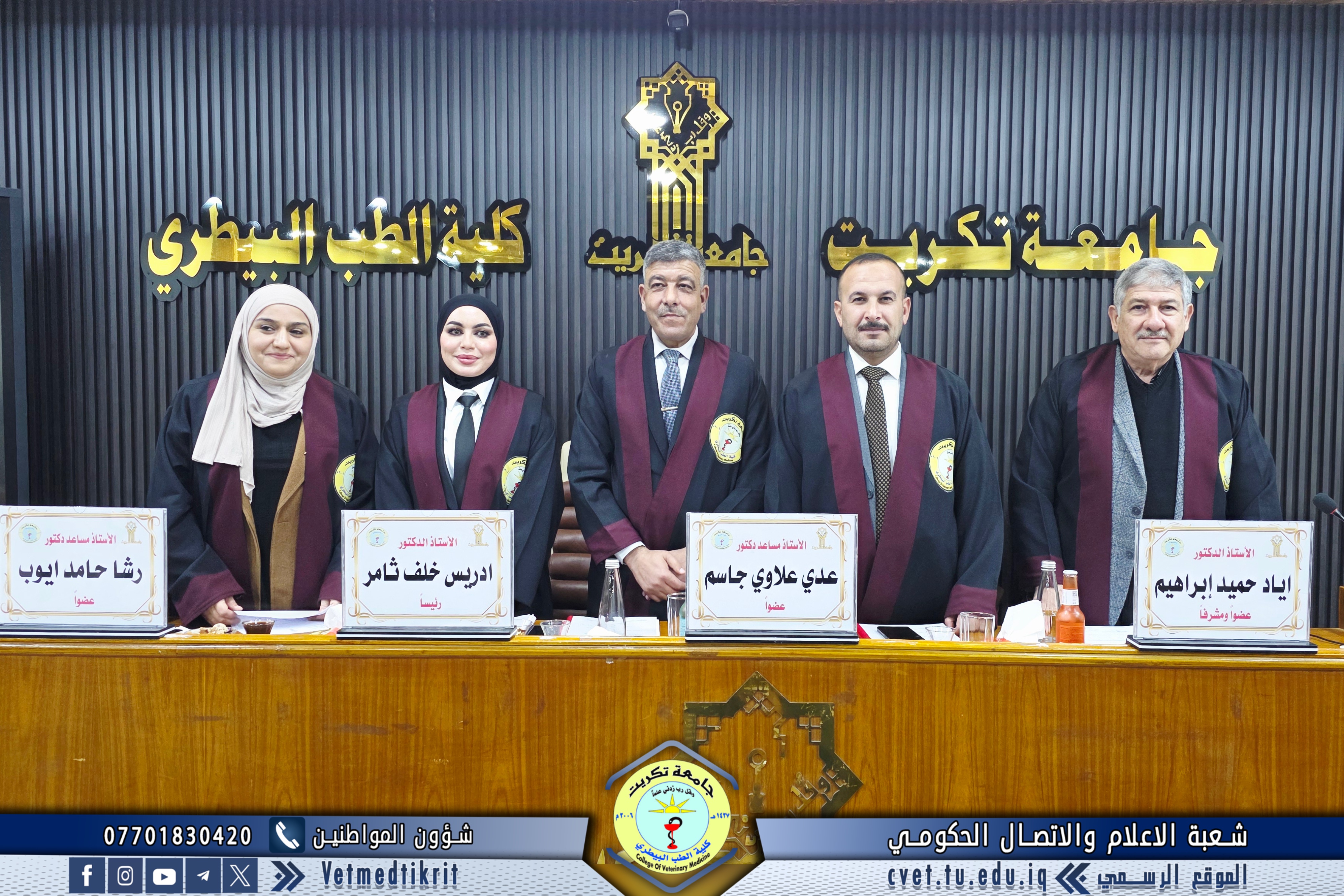 The thesis defense was held at Dr. Muhannad Maher Hall at the College of Veterinary Medicine, and was attended by a number of faculty members and students in a distinguished academic atmosphere.