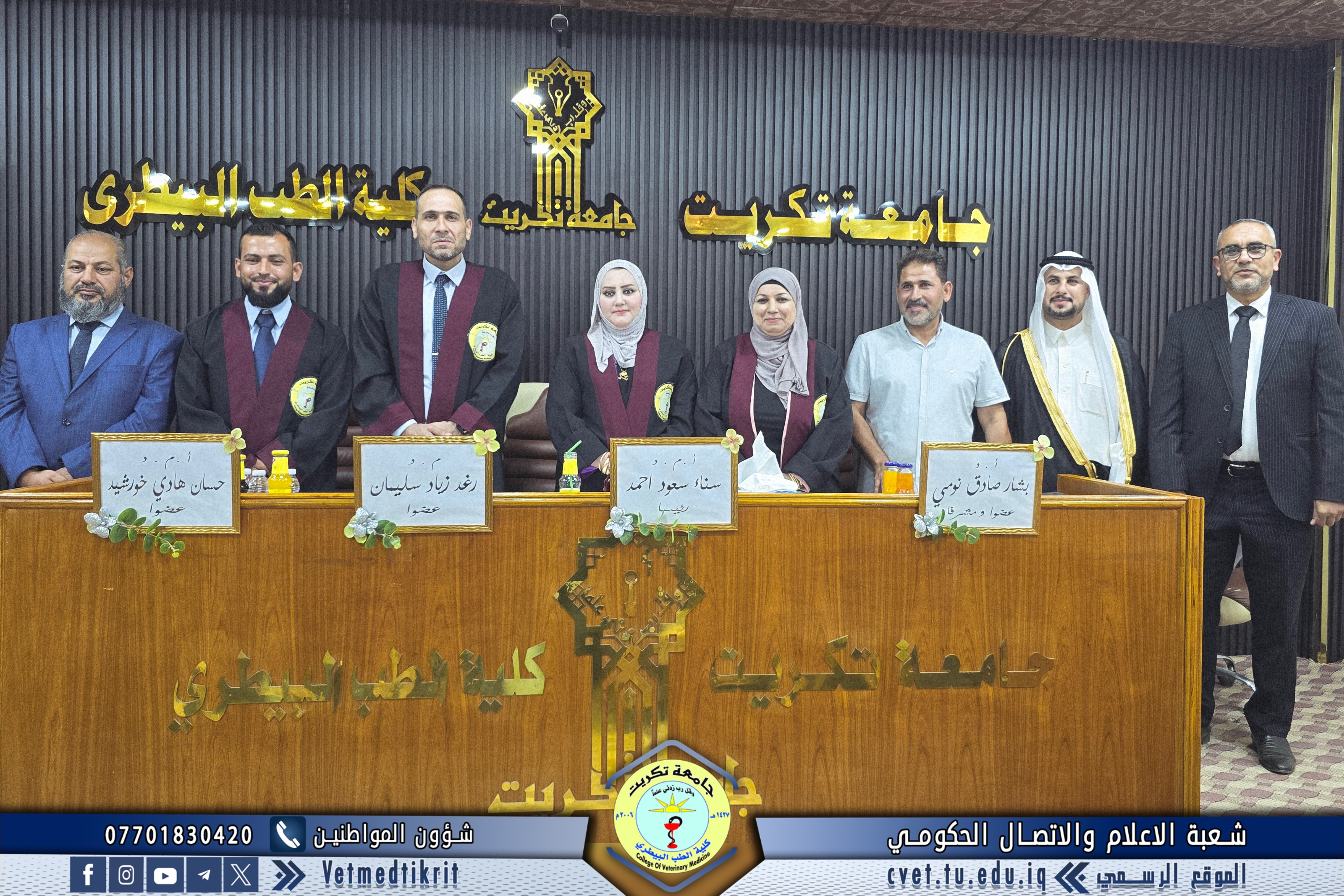 The abstract of the thesis was as follows: Pseudomonas aeruginosa is an important pathogenic bacterium in the medical and veterinary fields, causing numerous diseases in humans and animals, including wound and burn infections, eye infections, skin infections, urinary tract infections, middle ear infections, septicemia, and bone and joint infections. Among these diseases, middle ear infections are prominent, which are frequently observed in pets such as dogs and cats. To isolate and identify pyocyanin-producing Pseudomonas aeruginosa bacteria and their resistance to antibiotics, 40 ear swabs were collected from domestic cats admitted to private veterinary clinics in Tikrit, diagnosed with otitis, during December 2024. Ear swabs were collected from the infected cats using sterile cotton swabs, and Pseudomonas aeruginosa was isolated and identified. The study demonstrated the isolate's ability to produce large quantities of the exochrome pyocyanin when cultured on King's A medium. This pigment exhibited significant inhibitory activity against S. aureus and Candida albicans, but had no effect on E. coli or E. faecalis, highlighting its potential as a potential antimicrobial. In bone marrow cell cultures, results showed that pyocyanin exerts a direct cytotoxic effect, with varying degrees of damage depending on the associated microbe. The negative effect was greater when pyocyanin was combined with E. coli and E. faecalis, while it was less severe with S. aureus and Candida albicans, due to the hemoglobin inhibiting the growth of these organisms. These results indicate that pyocyanin has a dual nature: on the one hand, it is an important virulence factor for P. aeruginosa, and on the other hand, it possesses antibacterial and antifungal properties that could be employed in future therapeutic fields, provided its concentration is controlled to reduce its toxicity to host cells. The discussion, held in Dr. Muhannad Maher Hall at the College of Veterinary Medicine, was attended by a number of faculty members and students.