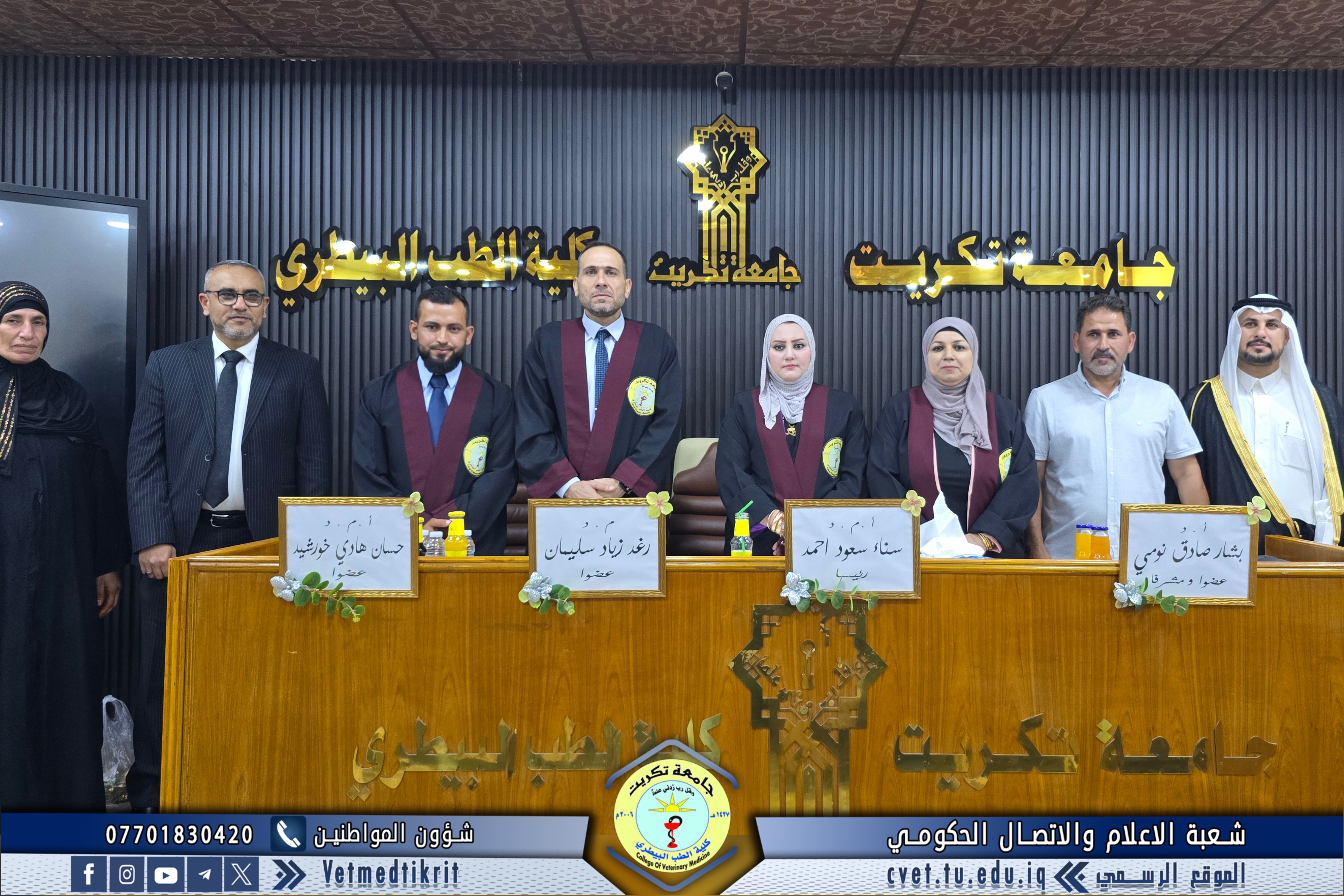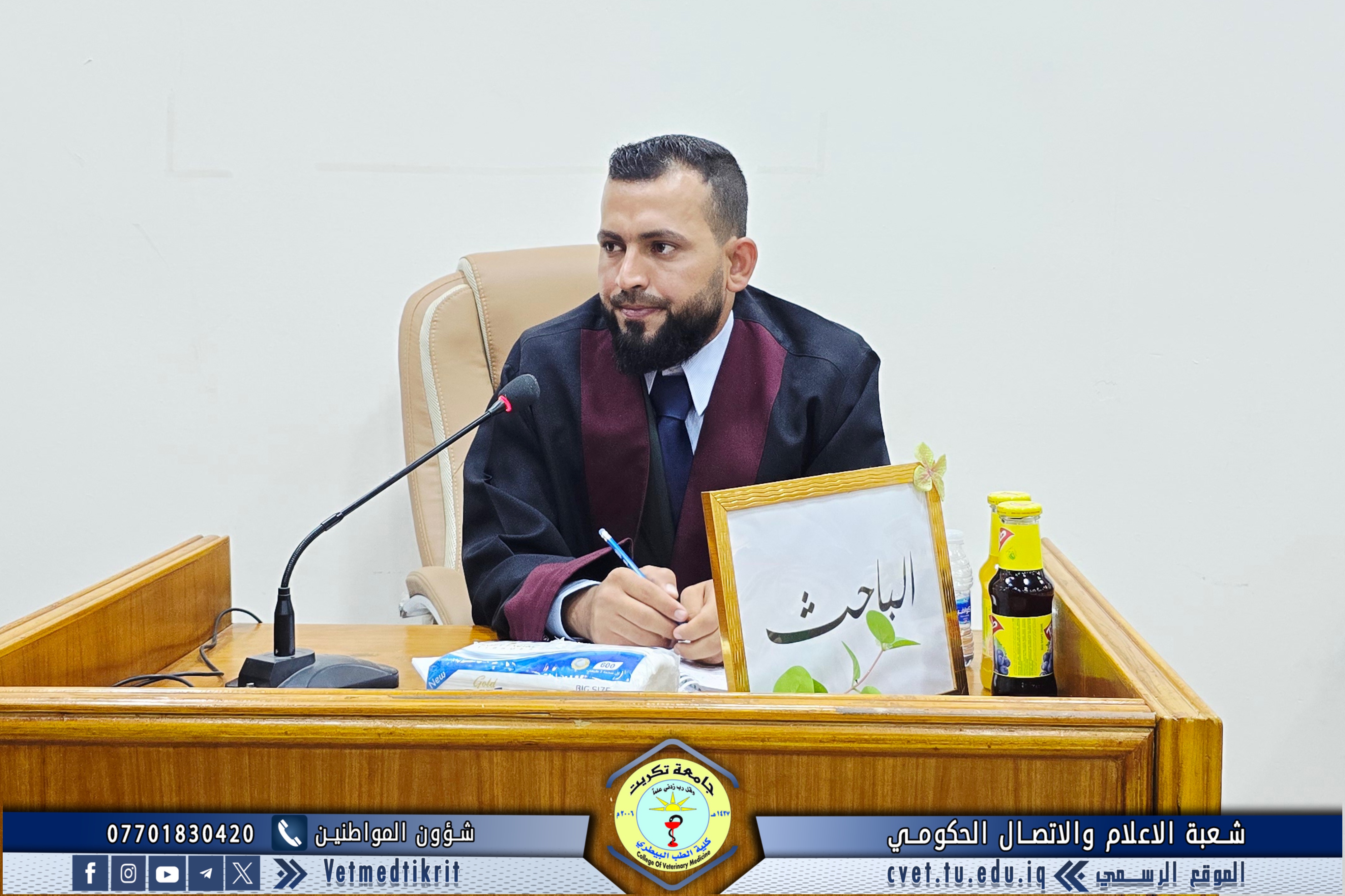 By the grace of God, the Master's thesis entitled "The Antibacterial, Protective, and Immunological Effect of Pyocyanin on Pseudomonas aeruginosa Isolated from Otitis Media in Dogs and Cats" was discussed by Ibrahim Hussein Muhammad, a student majoring in Microbiology, at the College of Veterinary Medicine at Tikrit University. The discussion committee consisted of: