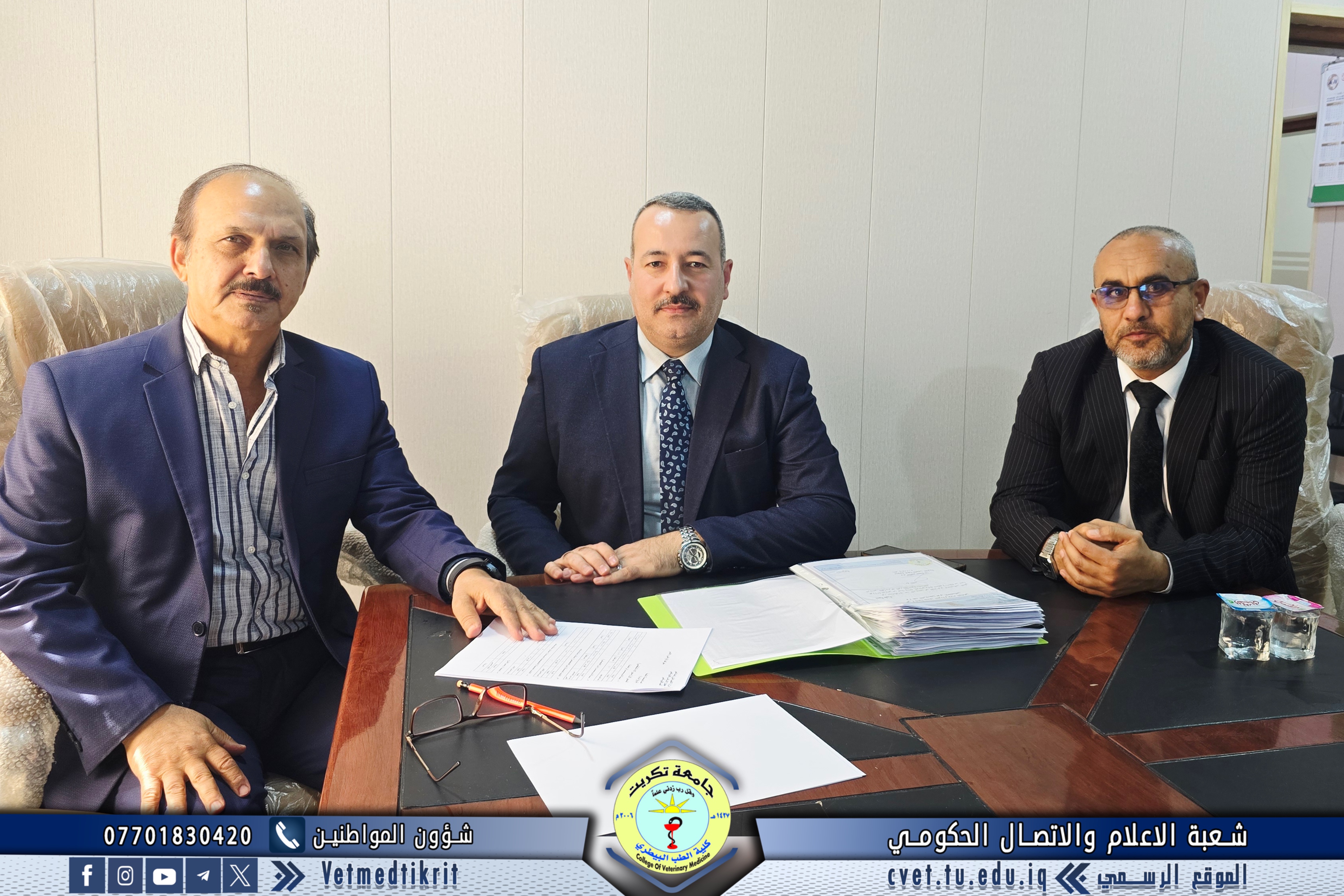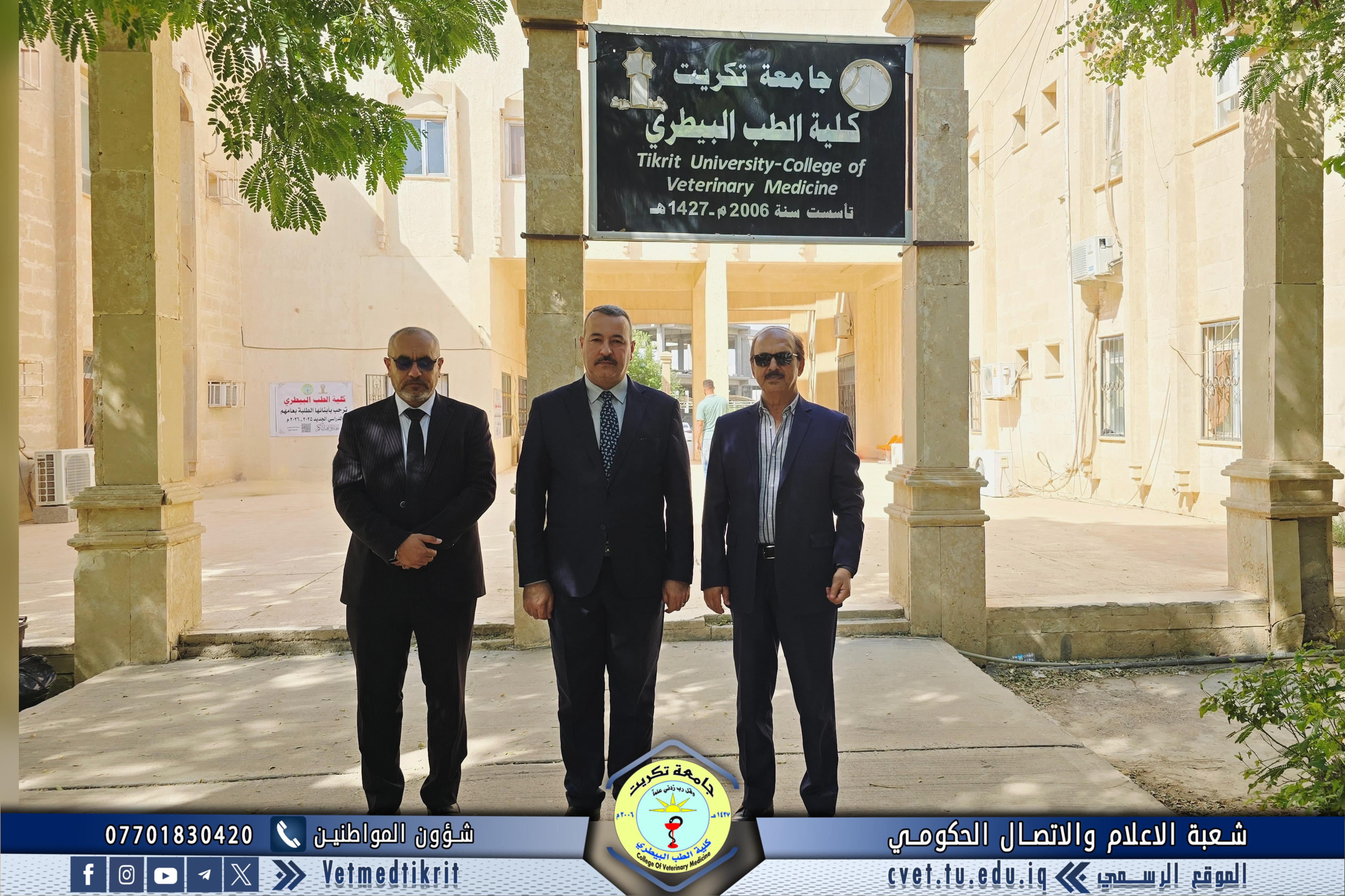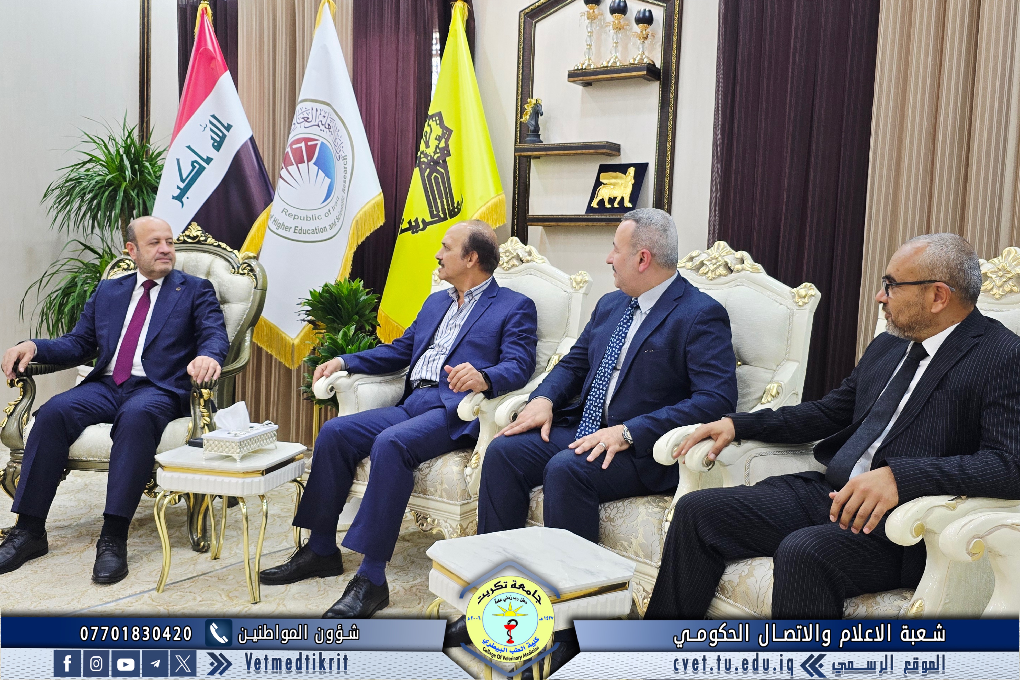 The College of Veterinary Medicine at the University of Tikrit welcomed the Ministerial Committee for Evaluating the Academic and Scientific Reality of the college. The committee was received by Prof. Dr. Bashar Sadiq Noami, Dean of the College; Asst. Prof. Dr. Montaser Mohammed Hilal, Associate Dean for Scientific Affairs; Asst. Prof. Dr. Osama Hamid Shihab, Associate Dean for Administrative Affairs; and Asst. Prof. Dr. Ahmed Abdullah Sultan, Director of the Quality Assurance and University Performance Division.
