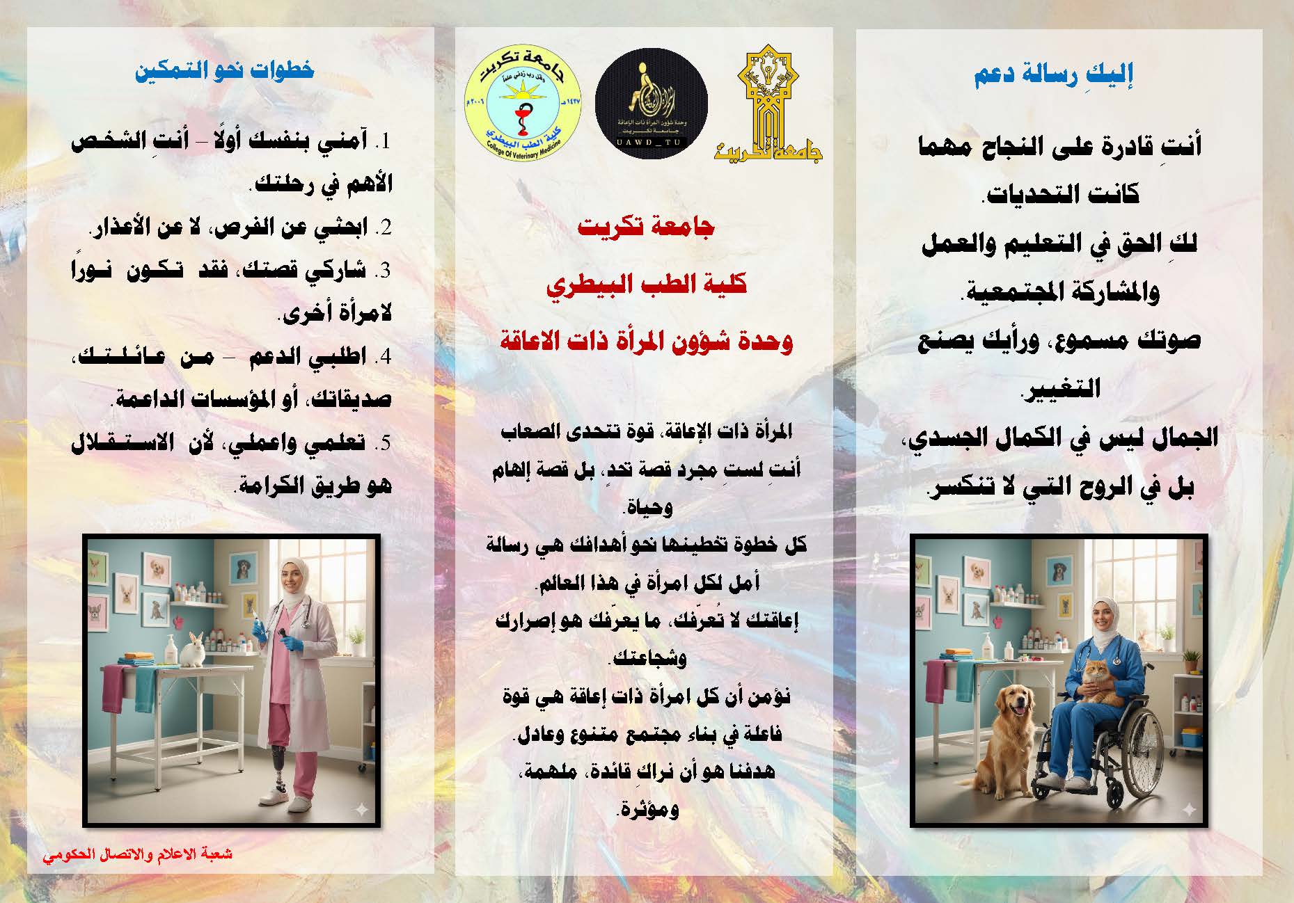 The Unit for Women with Disabilities at the College of Veterinary Medicine, University of Tikrit, organized a distinguished awareness campaign titled “Women with Disabilities: Strength that Defies Challenges.” The campaign aimed to promote awareness of the vital role of women with disabilities in society and to strengthen their empowerment across various fields.