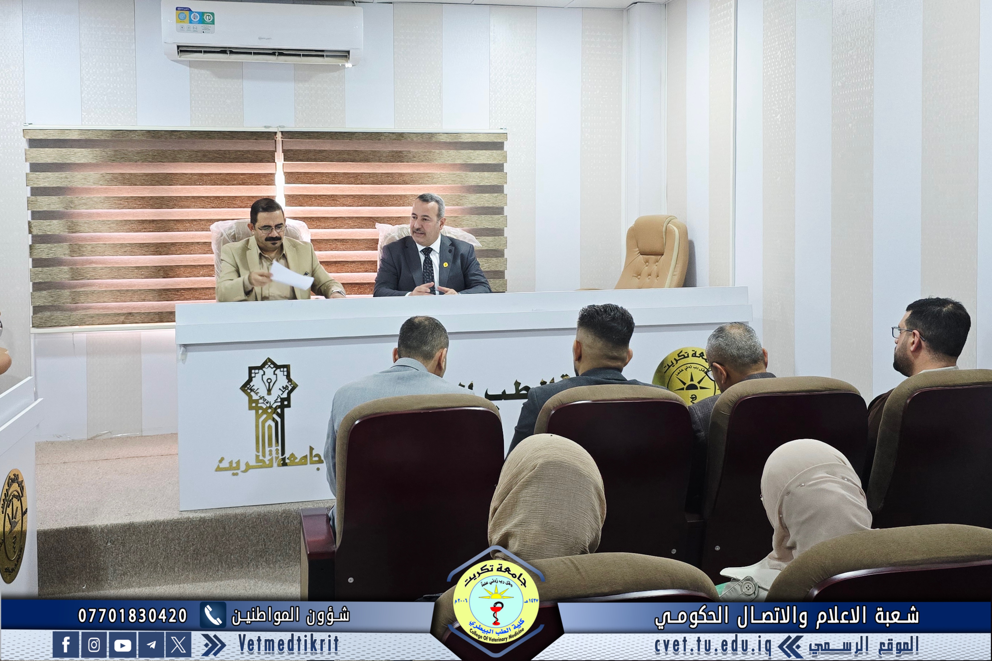 The Administration of the College of Veterinary Medicine at the University of Tikrit held an extensive meeting chaired by Prof. Dr. Bashar Sadiq Noami, Dean of the College, and attended by Asst. Prof. Dr. Montasir Mohammed Hilal, Associate Dean for Scientific Affairs, along with the heads and members of the committees responsible for completing the college’s institutional accreditation requirements.