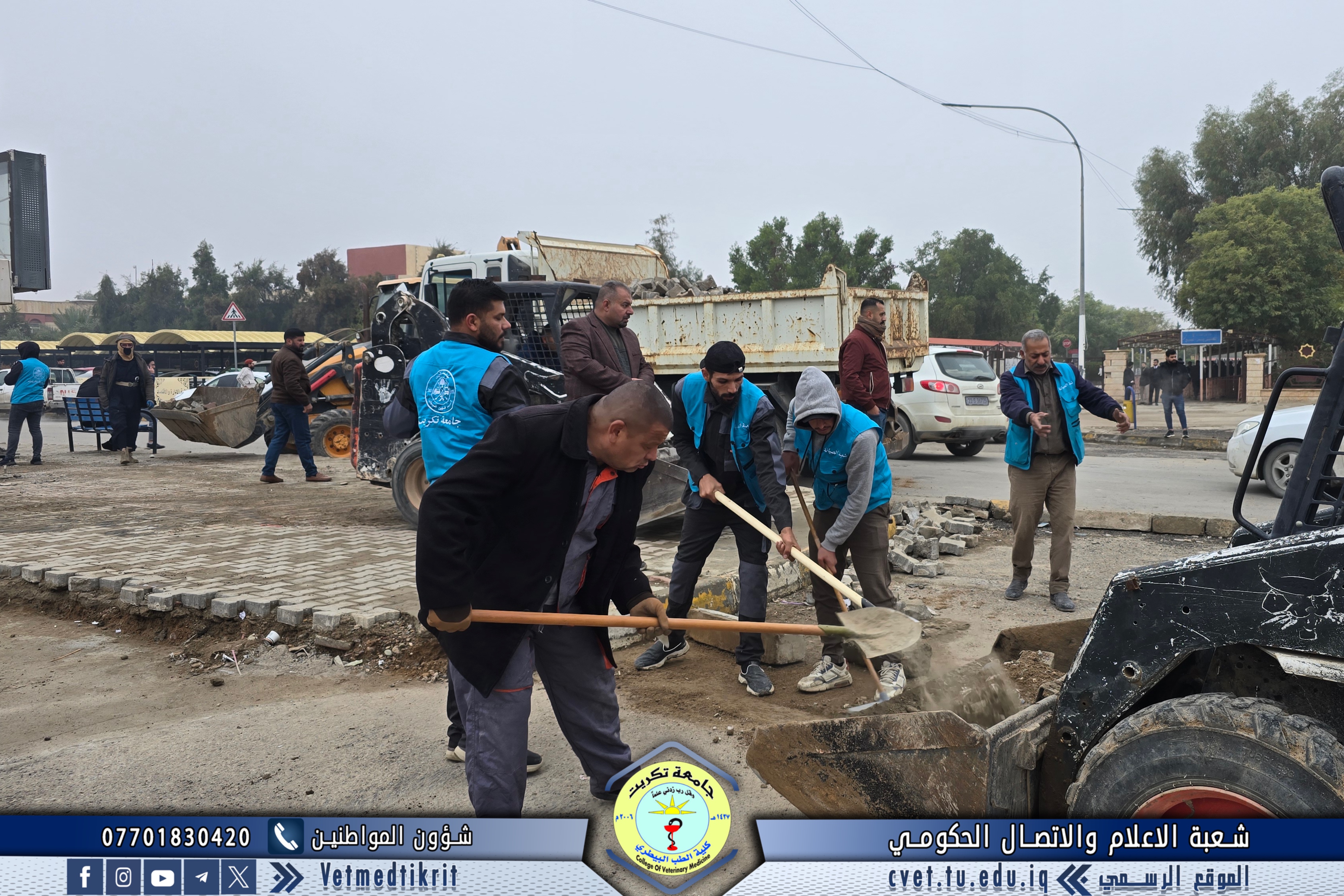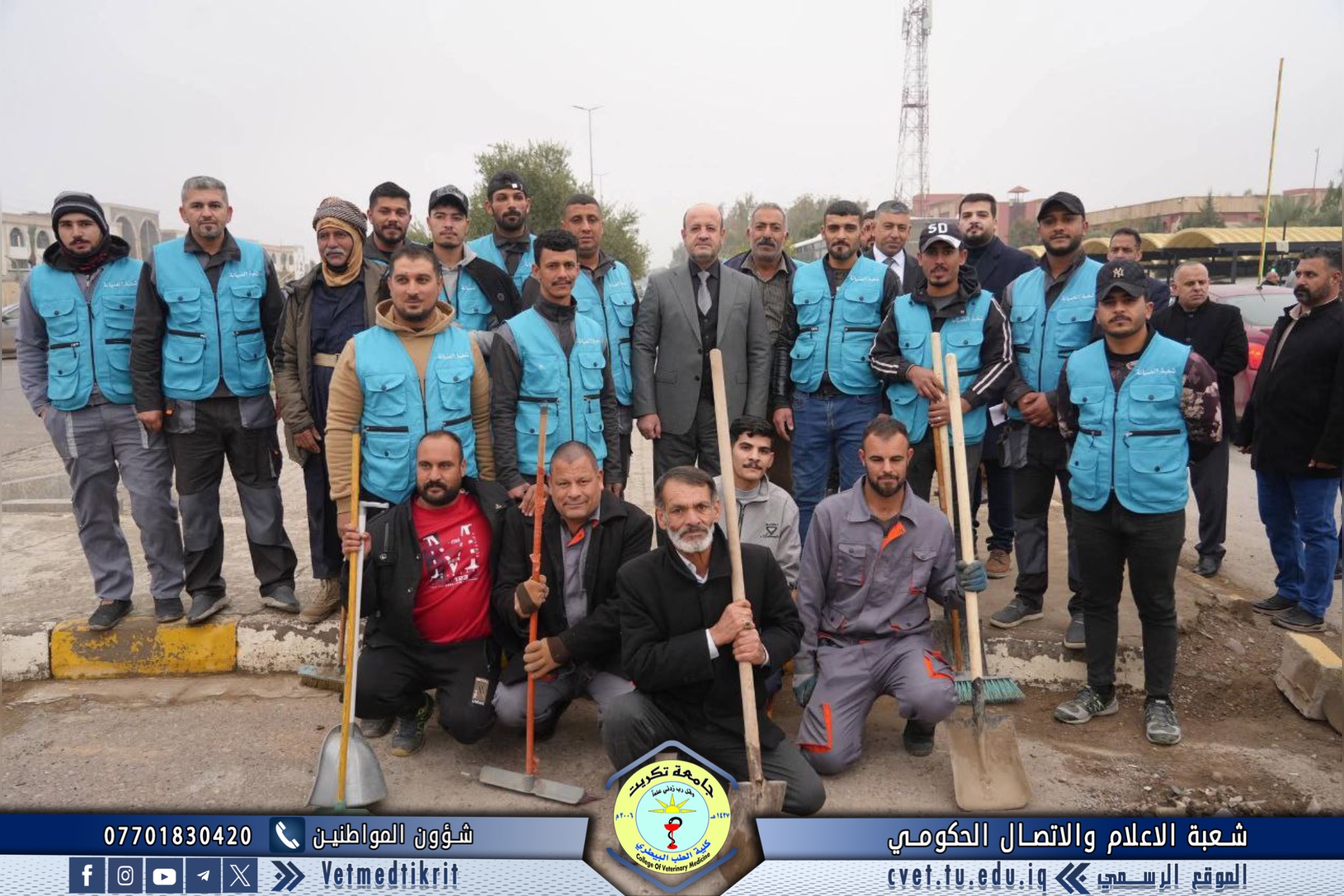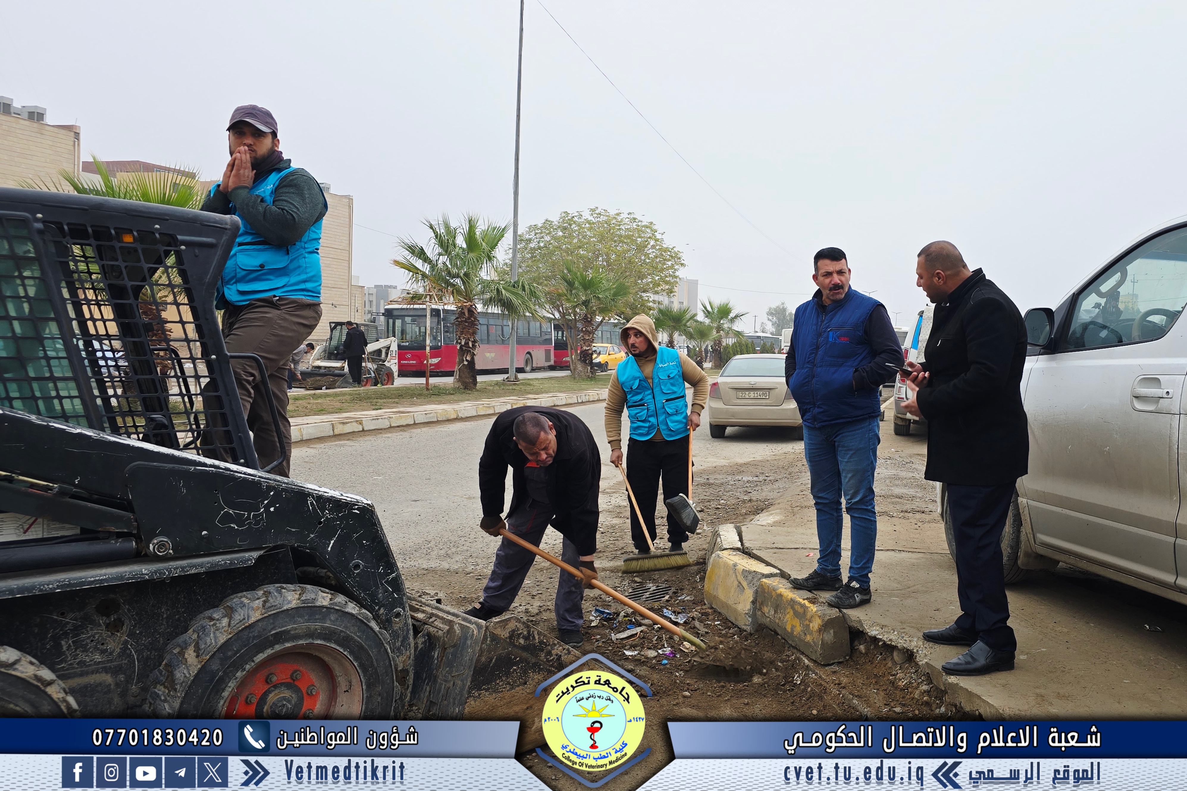 The Gardens and Services Division at the College of Veterinary Medicine, University of Tikrit, took part in a large-scale campaign to clean the main and secondary streets within the university campus. The campaign was carried out under the supervision of Professor Dr. Waed Mahmoud Raouf, President of the University of Tikrit, and Professor Dr. Hamed Mohammed Saleh, Assistant President of the University for Administrative Affairs.