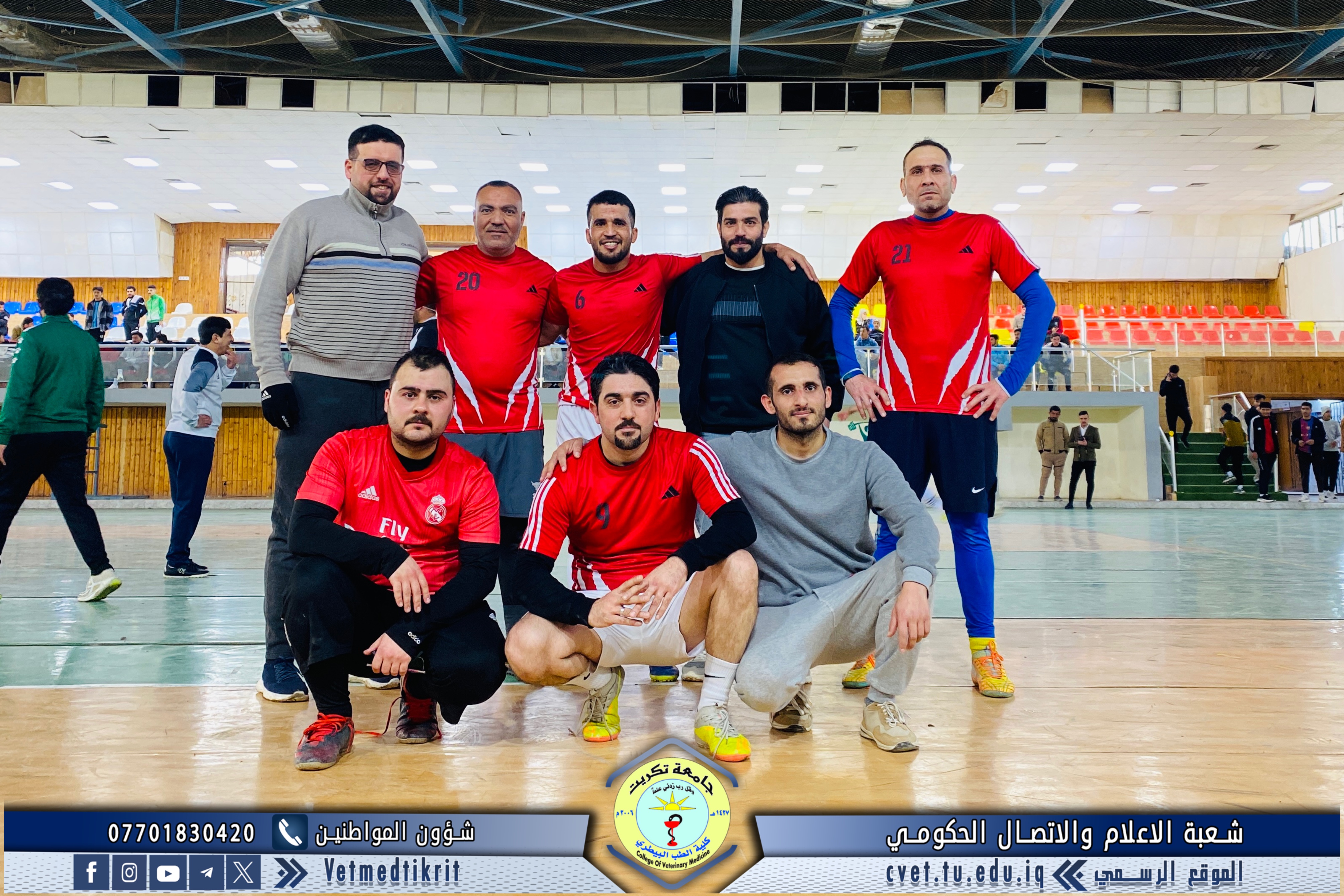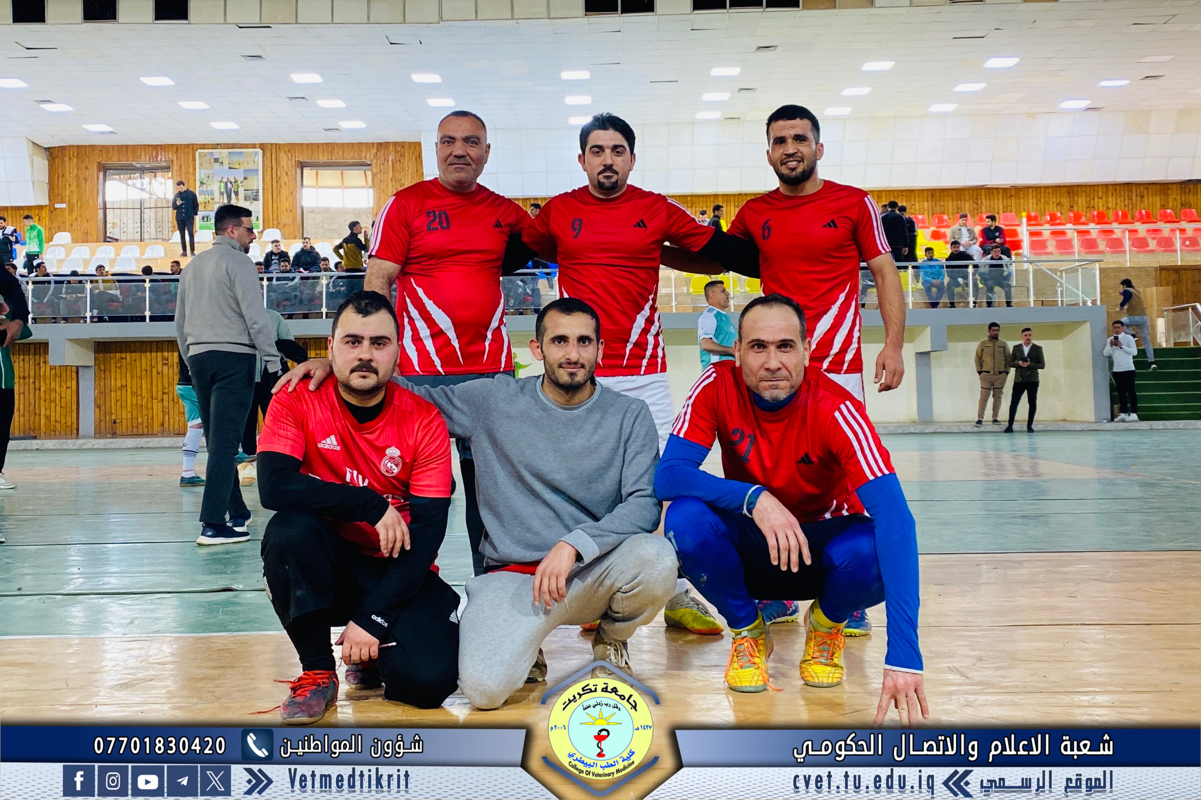 The College of Veterinary Medicine five-a-side football team for teaching staff achieved its second victory over the team of the College of Physical Education and Sports Sciences with a score of (3–2), as part of the quarterfinal round of the Tikrit University President’s Five-a-Side Football League for teaching staff.