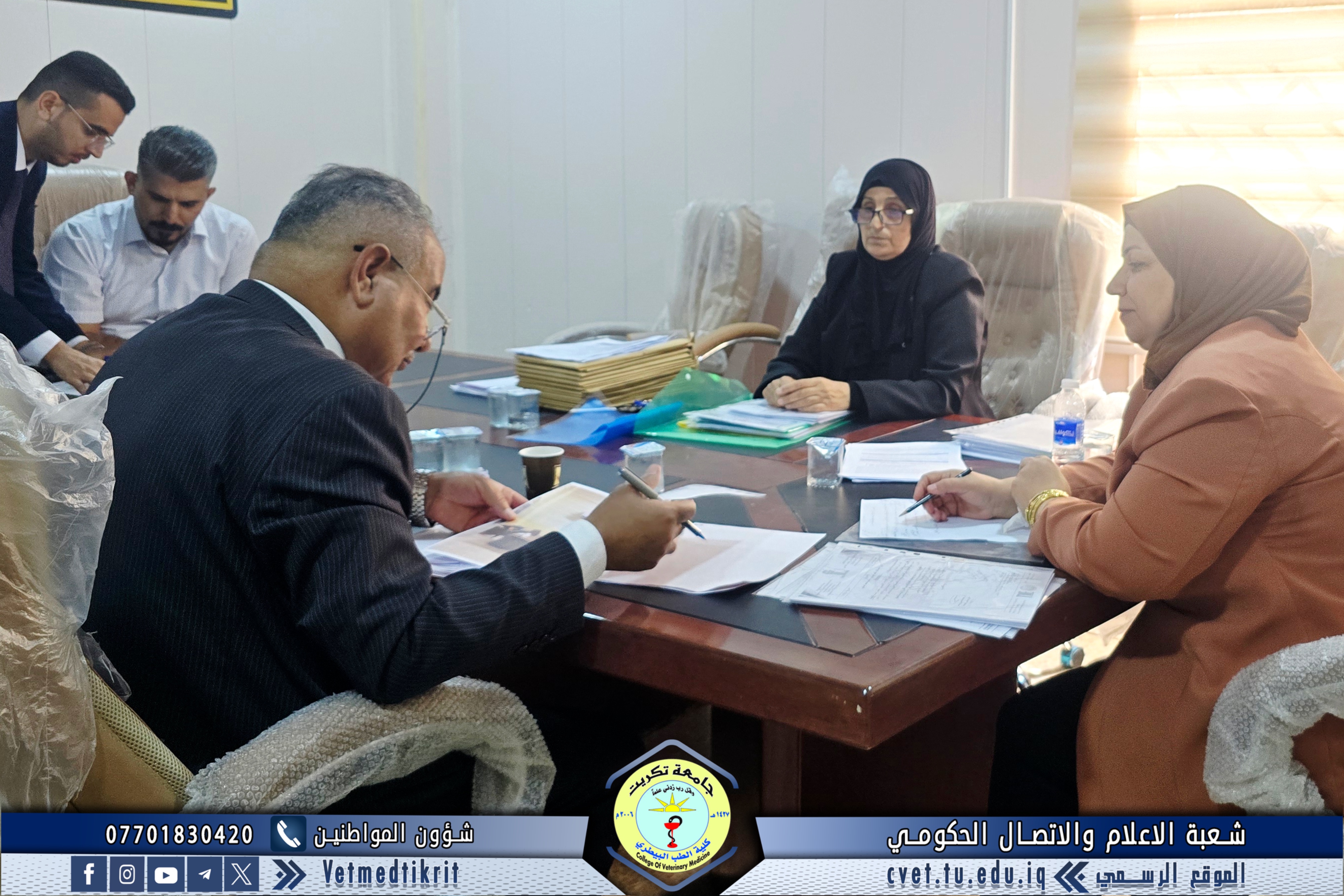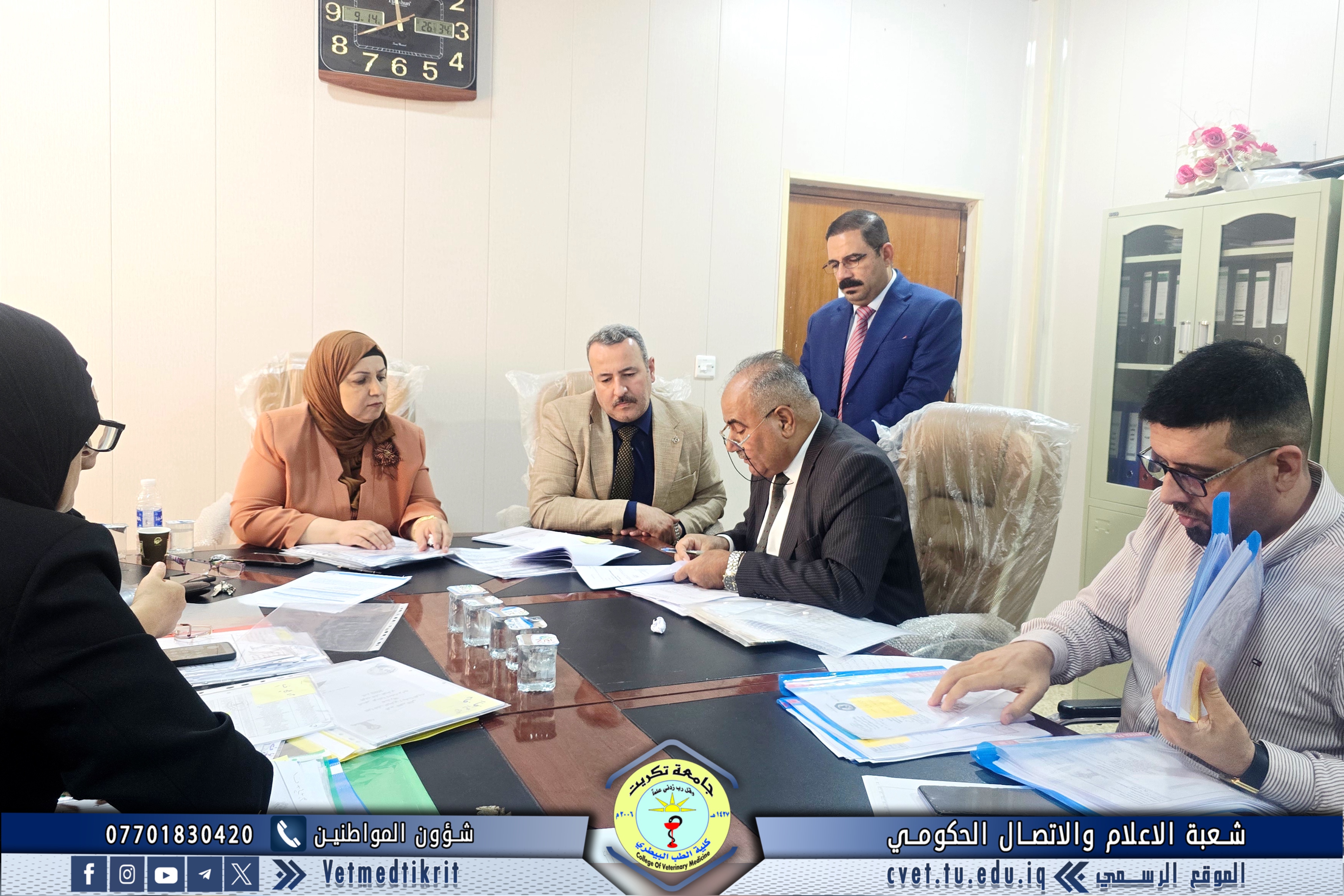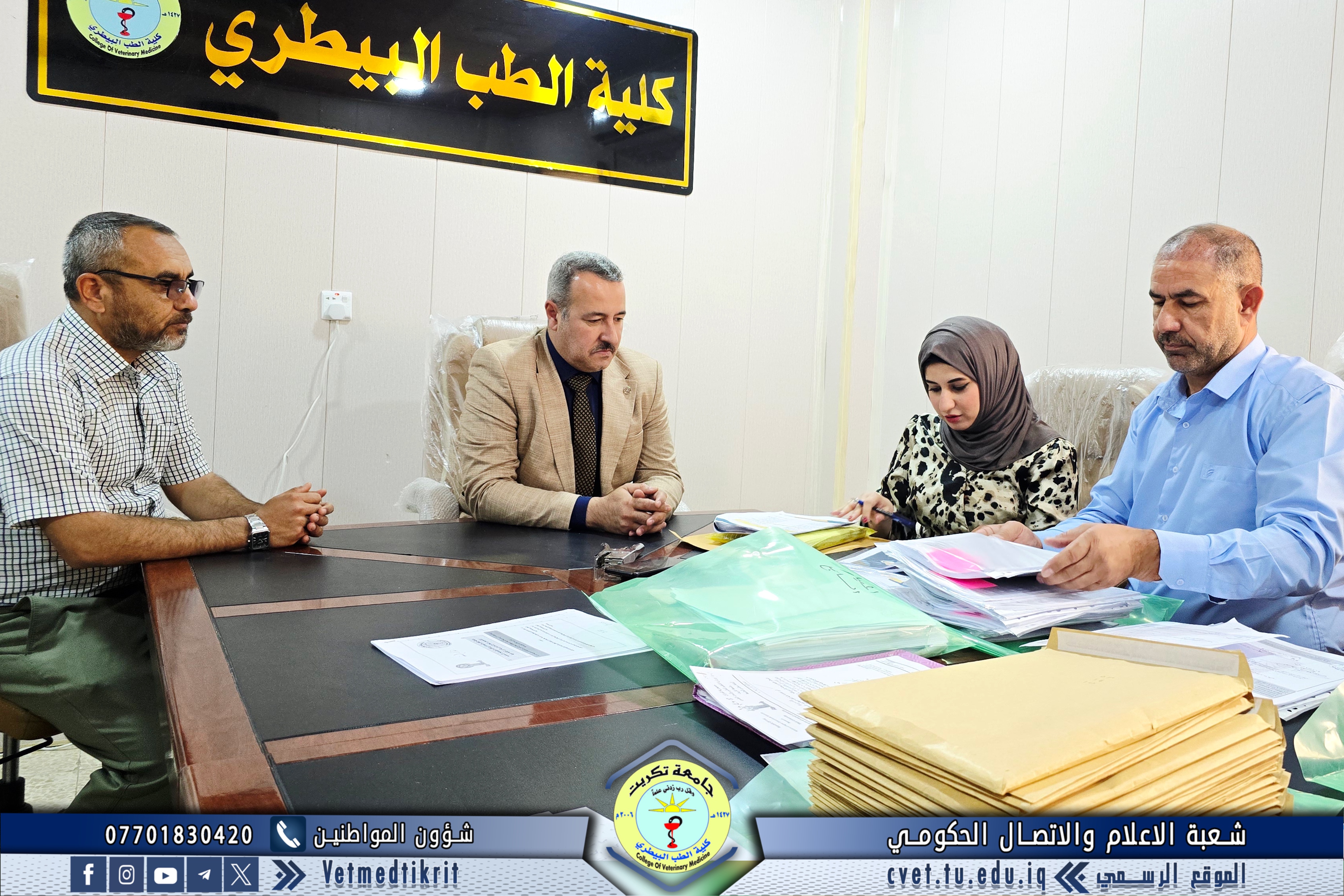 The Institutional Accreditation Standards Supervisory Committee at Tikrit University visited the College of Veterinary Medicine for the second time. They were received by Professor Dr. Bashar Sadiq Noumi, Dean of the College, and Assistant Professor Muntaser Mohammed Hilal, Assistant Dean for Academic Affairs. During the visit, the committee reviewed the evidence and documentation prepared by the committees formed at the college for this purpose. They expressed their admiration for the outstanding level of organization and meticulous work, appreciating the great efforts made by the college's deanship and all committees to move confidently towards implementing institutional accreditation standards. The College of Veterinary Medicine affirms its continued commitment to achieving academic excellence and enhancing its academic standing, in line with quality and institutional accreditation requirements, placing it among the leading colleges at the national and international levels.