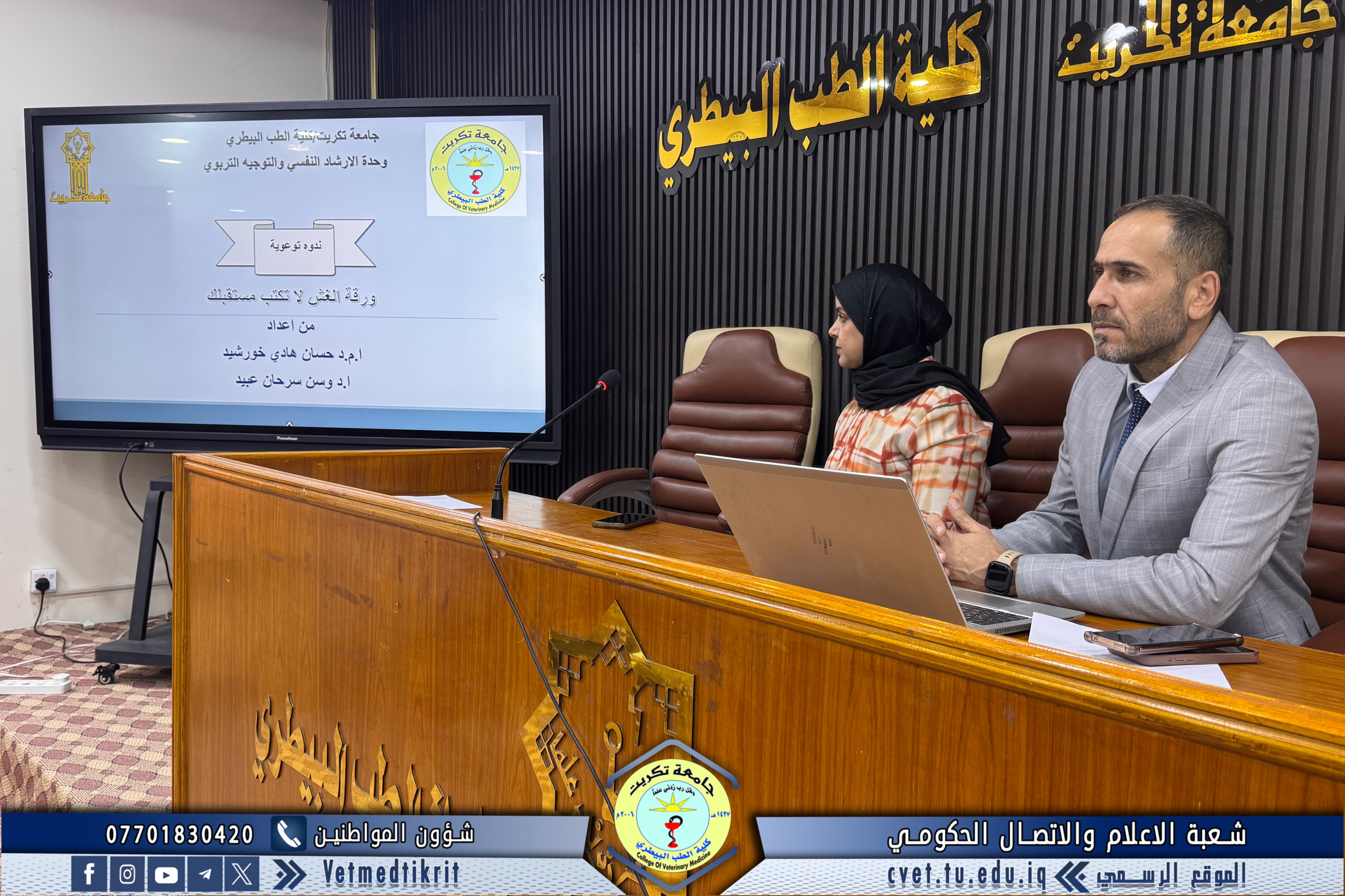 As part of its efforts to promote academic and ethical values among students, the Psychological Counseling and Educational Guidance Unit at the College of Veterinary Medicine, University of Tikrit, organized an awareness seminar titled “A Cheating Sheet Does Not Write Your Future.”