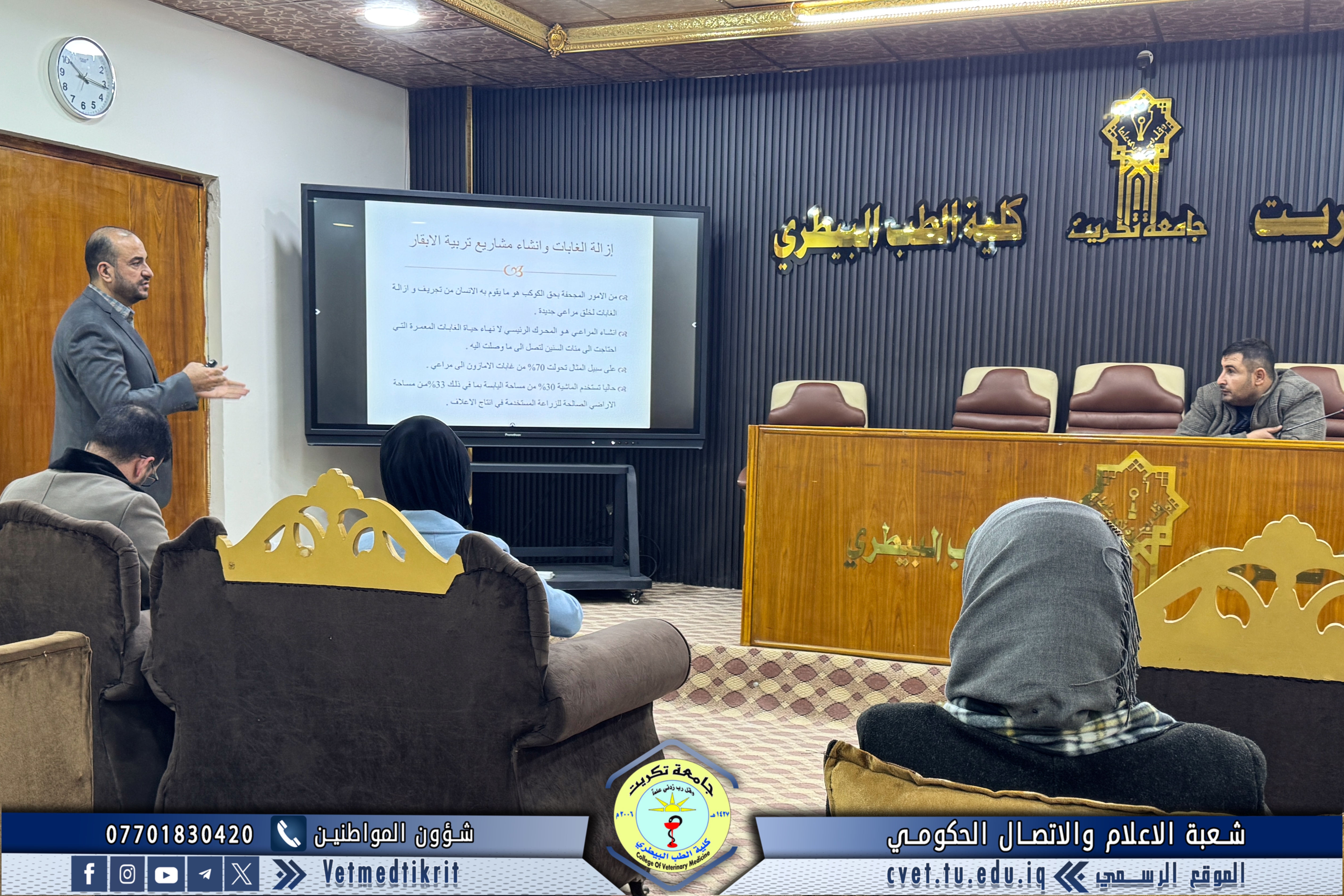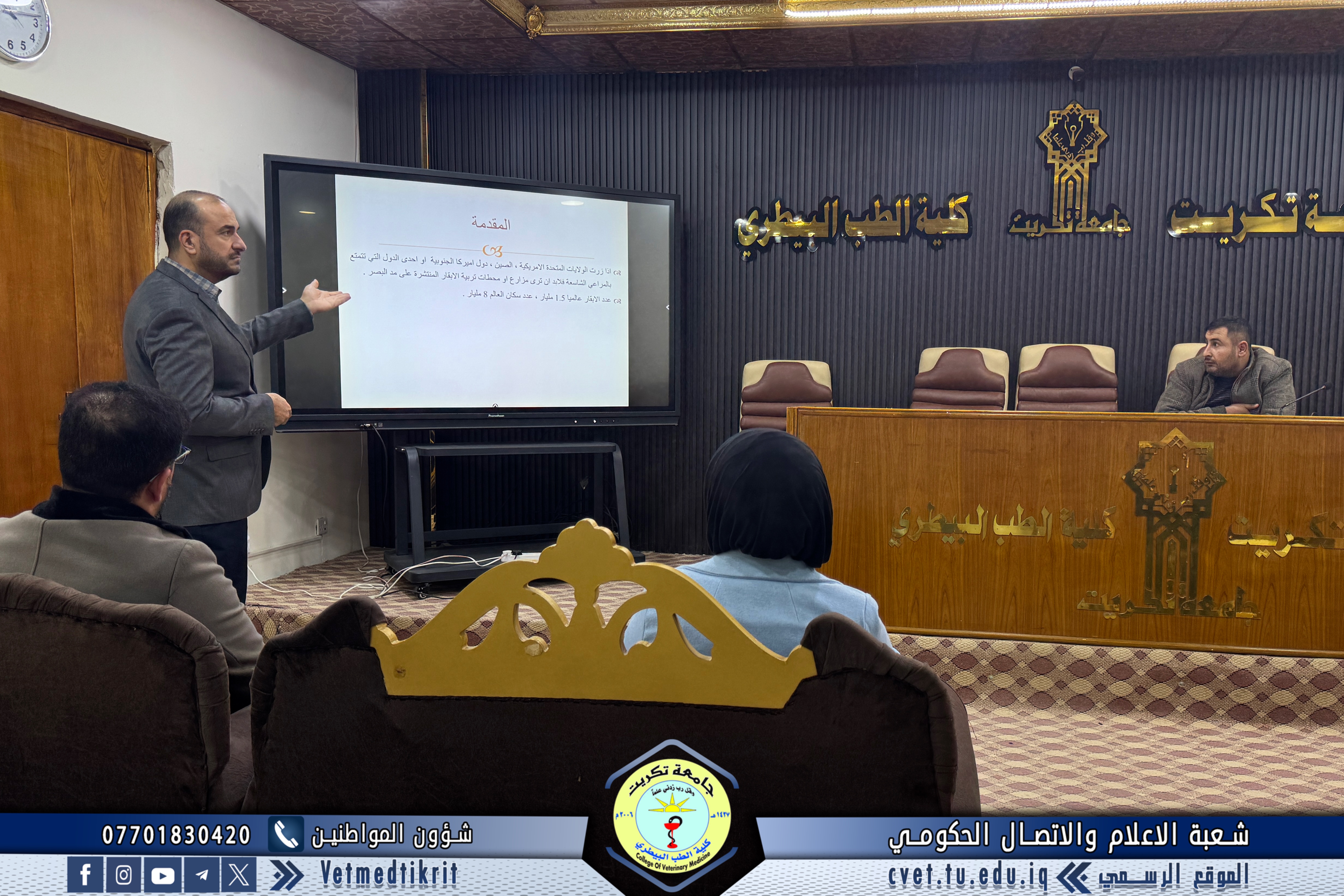 The College of Veterinary Medicine at the University of Tikrit, in cooperation with the Continuing Education Center, held a scientific seminar titled “Cows and Climate Change.” The seminar was delivered by Prof. Dr. Ziyad Tareq Omar and Assistant Lecturer Amer Ibrahim Ali.