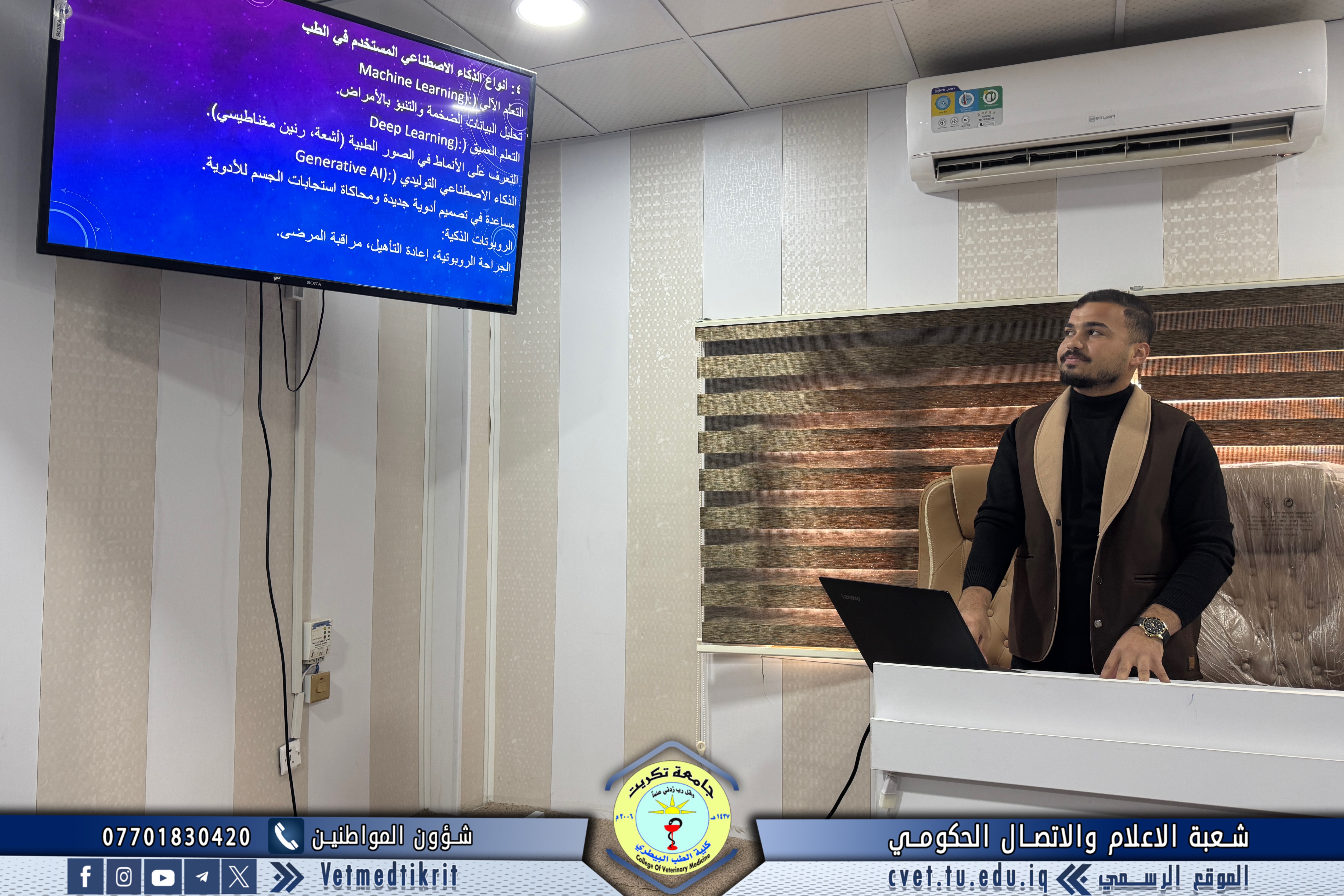 Under the patronage of the College of Veterinary Medicine and in cooperation with the Center for Continuing Education at the University of Tikrit, a scientific seminar titled “Artificial Intelligence” was held, presented by Veterinarian Mousa Dakheel Bahr and students Abdullah Alaa Mutlak and Haider Ali Essam.
