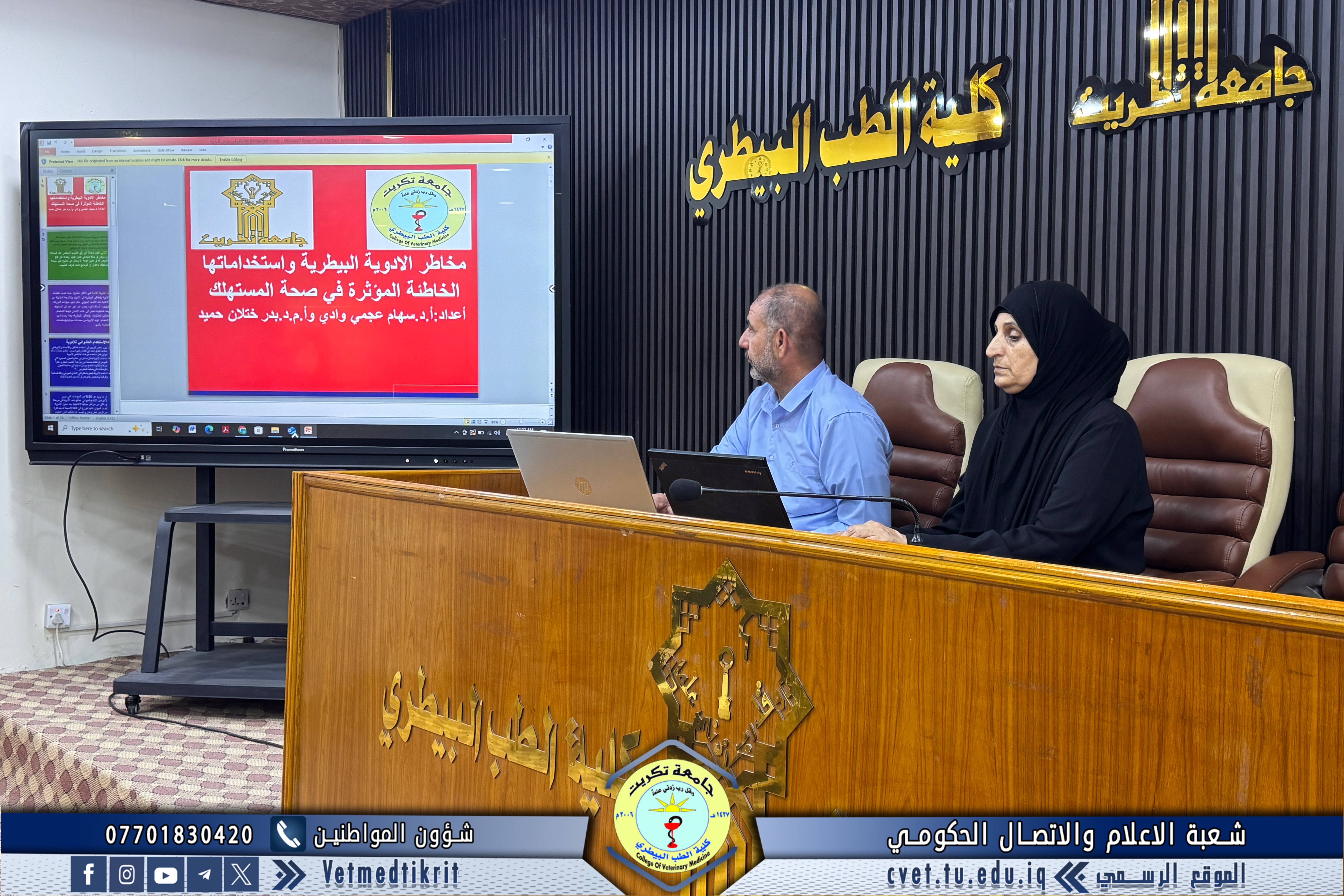 As part of its efforts to promote scientific awareness and encourage the rational use of veterinary medicines, the College of Veterinary Medicine at the University of Tikrit organized a scientific seminar entitled “The Risks of Veterinary Drugs and Their Misuse Affecting Consumer Health.”
