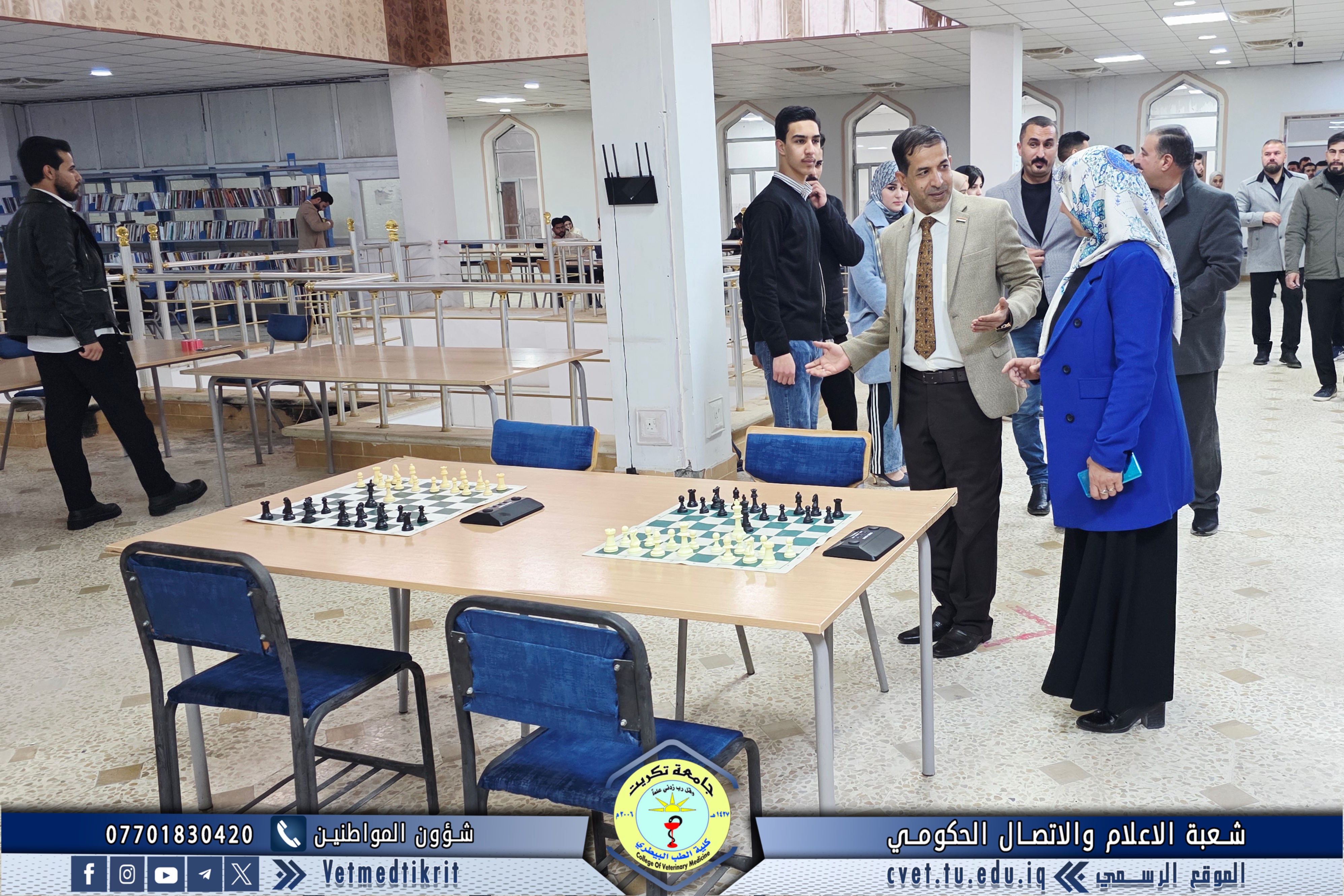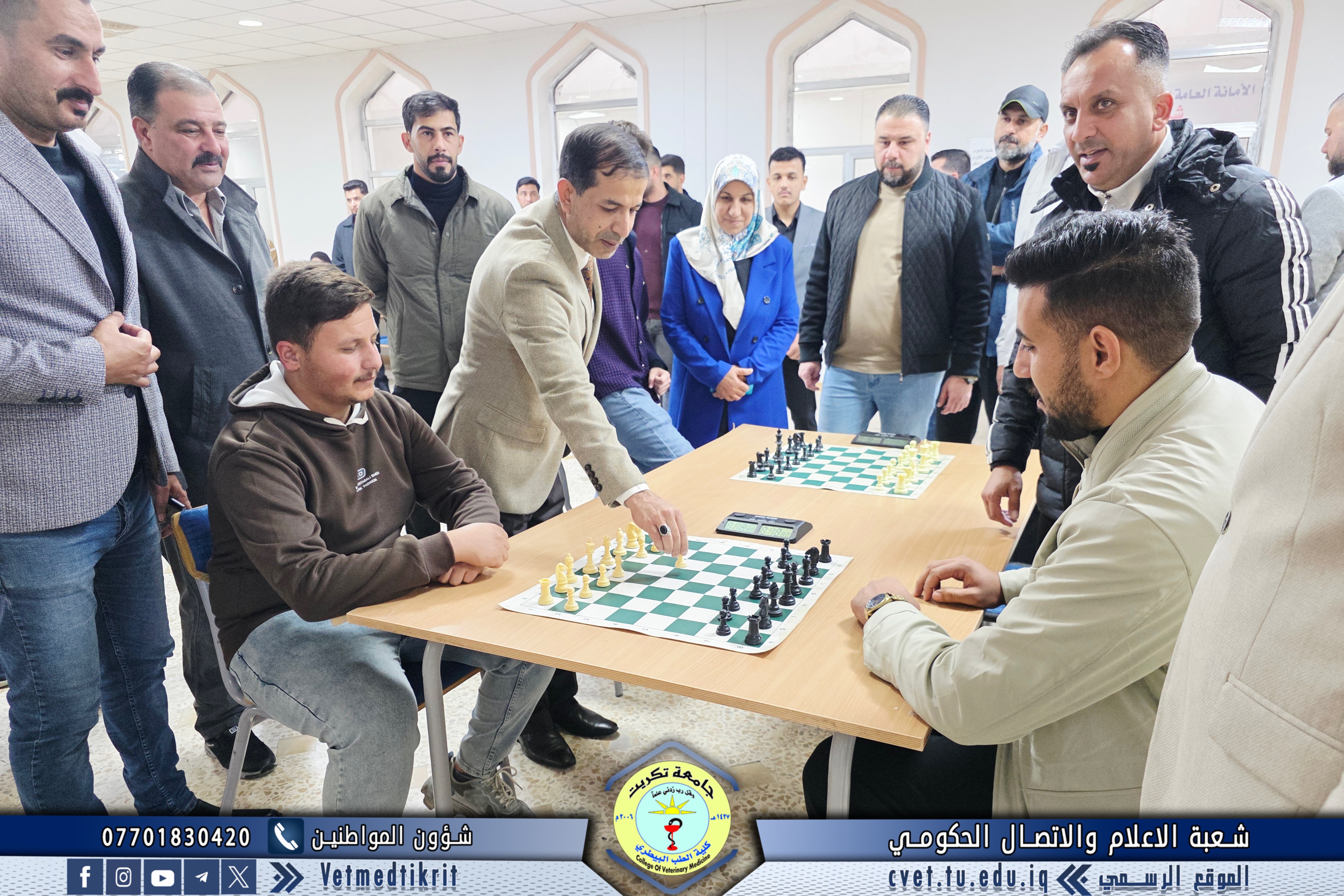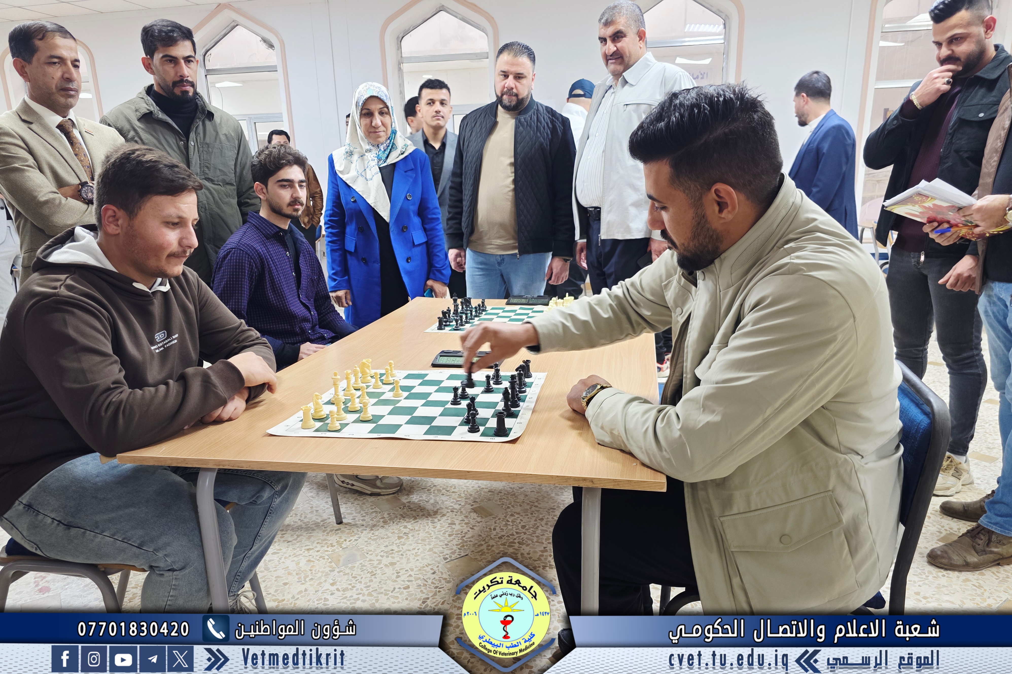 The College of Veterinary Medicine participated in the University of Tikrit Chess Championship, hosted by the College of Islamic Sciences and the General Secretariat of the Central Library. This participation comes as part of the College’s extracurricular activities and its commitment to supporting students across various academic, cultural, and athletic fields.